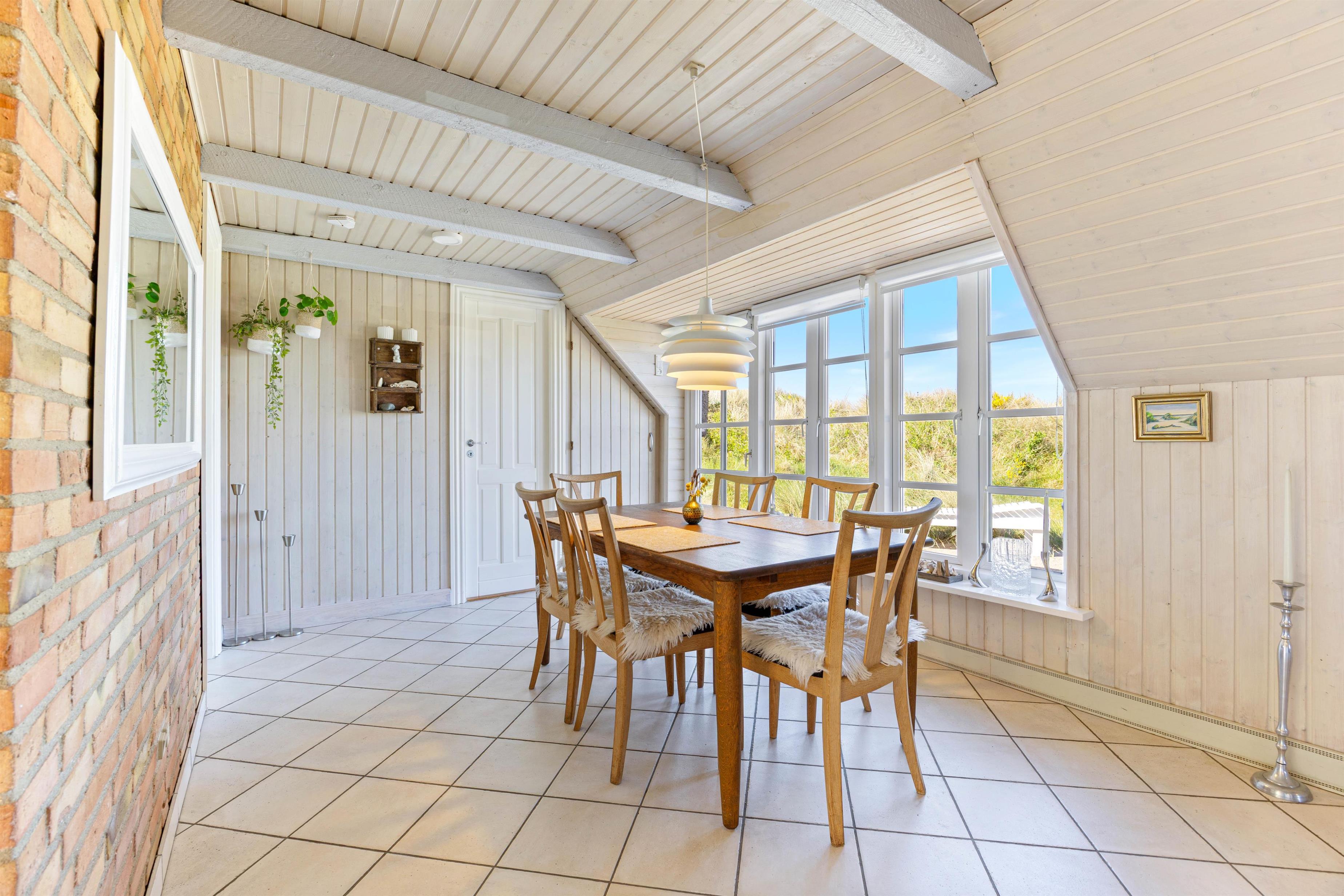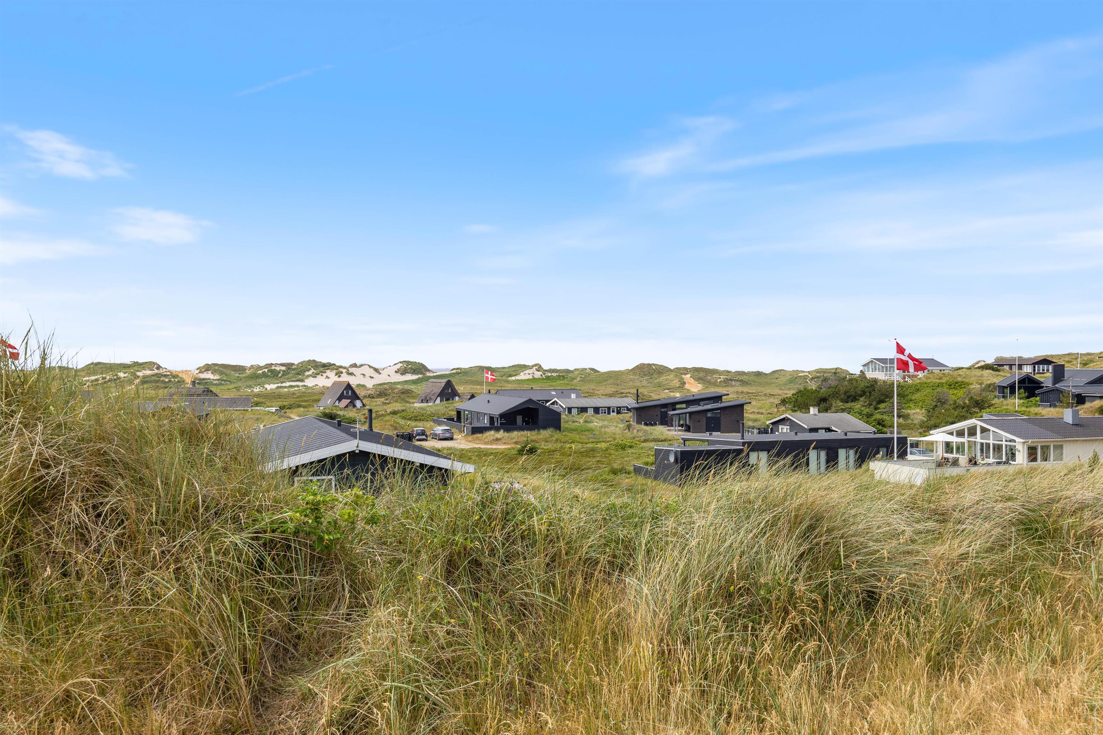 Feriehuset har utroligt flot udsigt over havet og klitterne, og den kan nydes i alt slags vejr, da udsigten ikke blot er fra husets terrasse, men også fra stuen og spisestuen. Ude imponerer feriehuset med sit flotte stråtag, der smelter sammen med det omkringliggende landskab, og på husets dejlige terrasse kan du smide dig på de tilhørende liggestole og nyde den fantastiske udsigt, alt imens du slapper af til lyden af havets brusen. Efter en dejlig grillaften på terrassen, kan I gå op på husets udsigtspunkt, hvor I på bænken kan se én af de mange imponerende solnedgange over Vesterhavet.