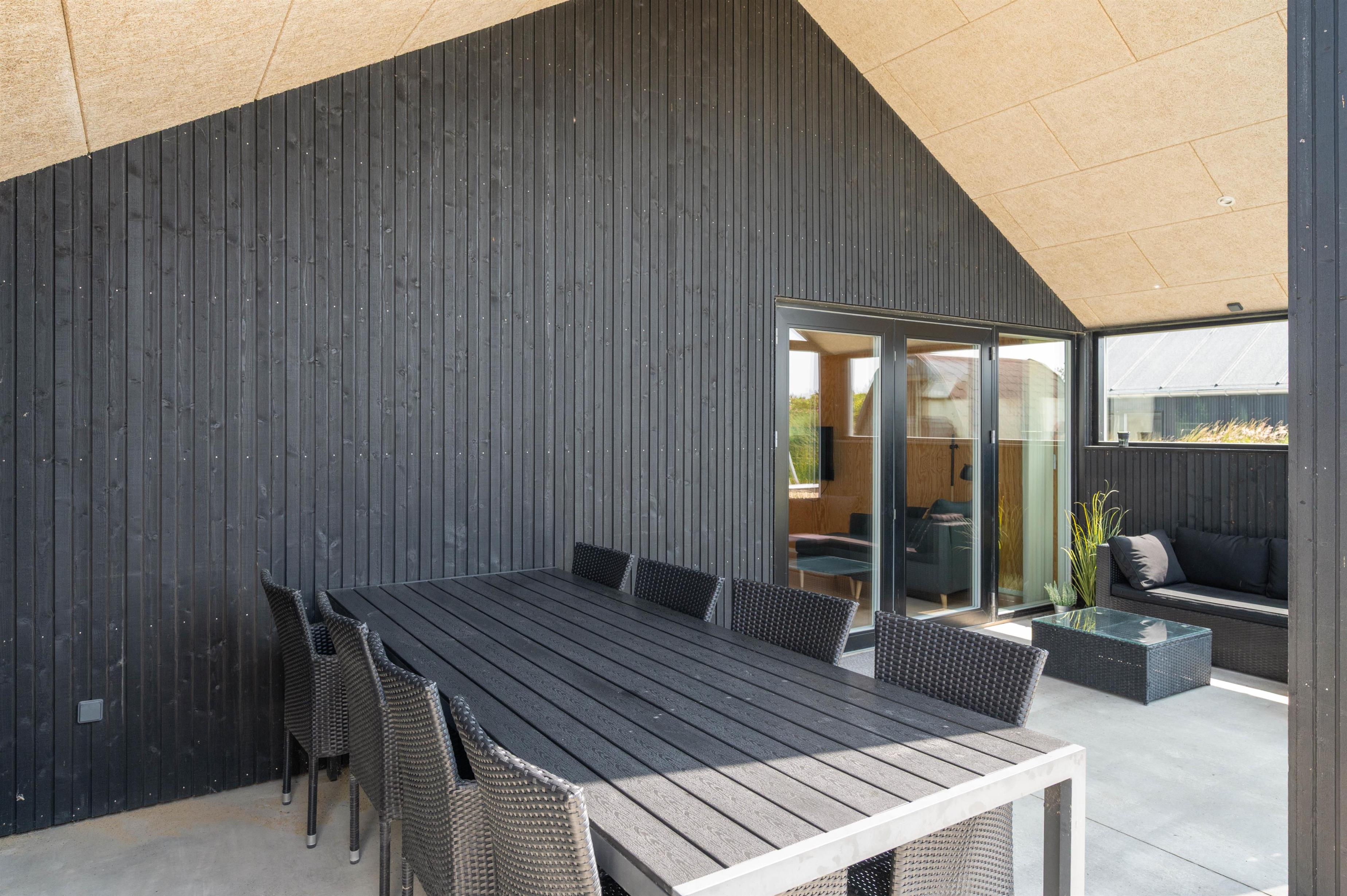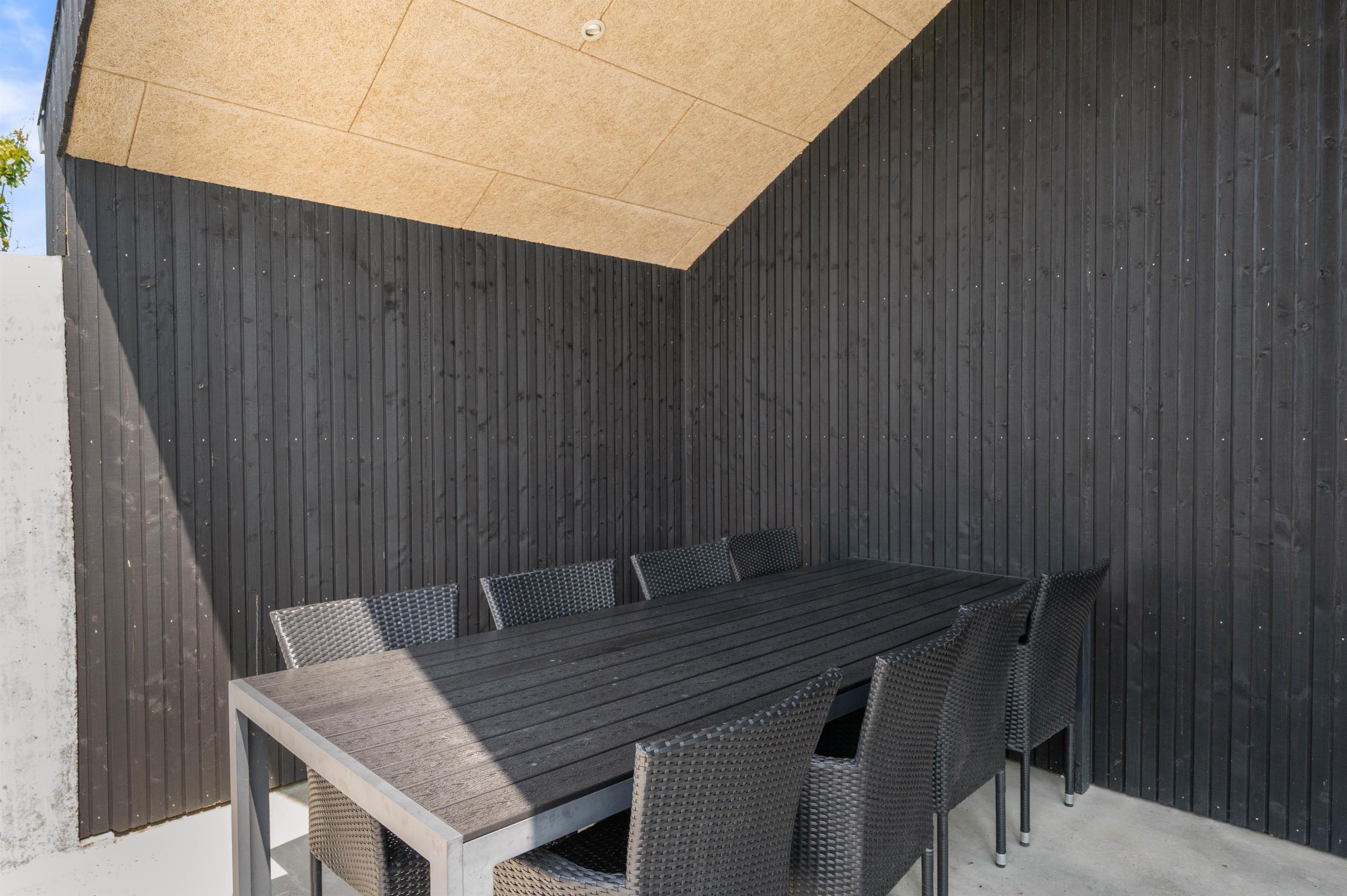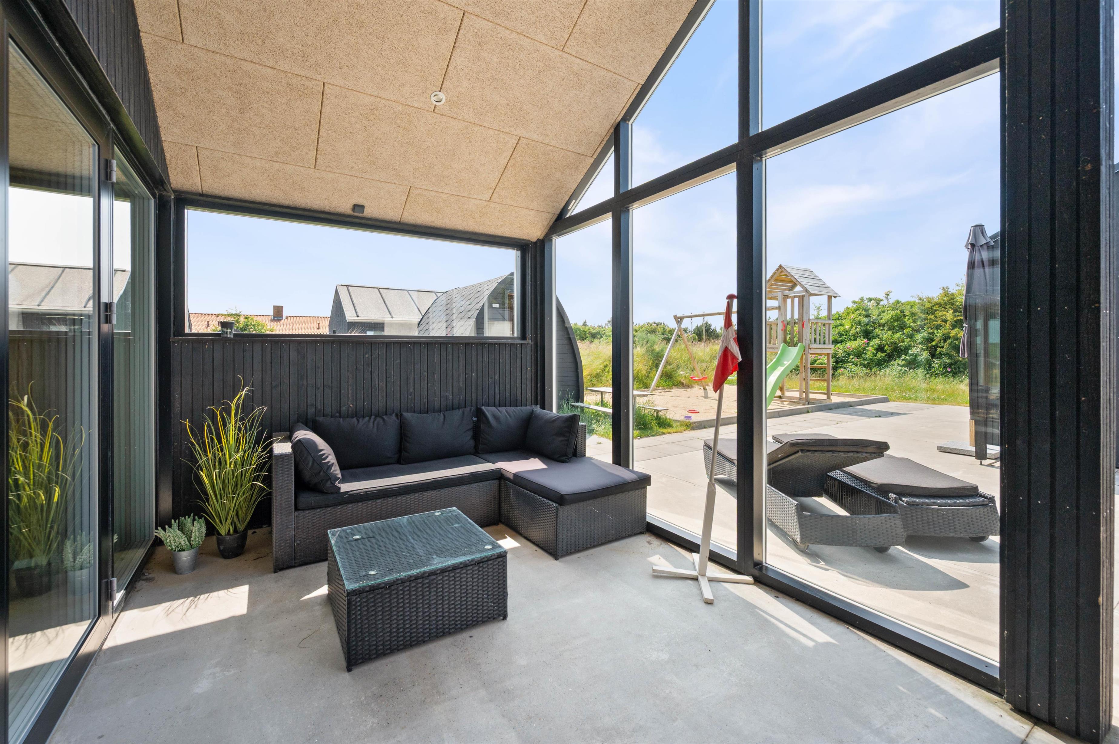 Fra sommerhuset kan I træde ud på den delvist overdækkede og afskærmede terrasse. Her står havemøbler og liggestole til rådighed for jer, som I kan finde jer godt til rette i, så I rigtig kan slappe af i solen.