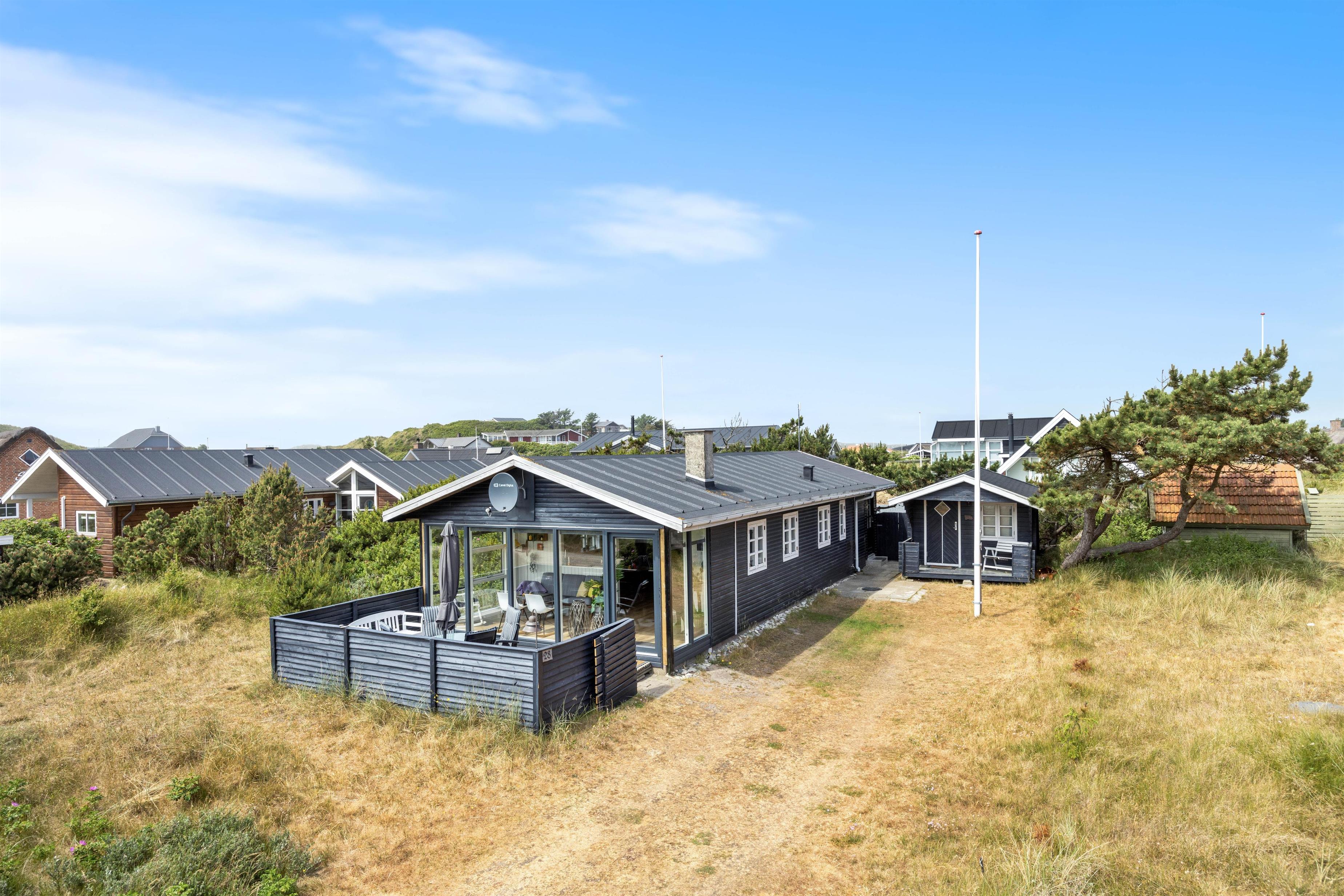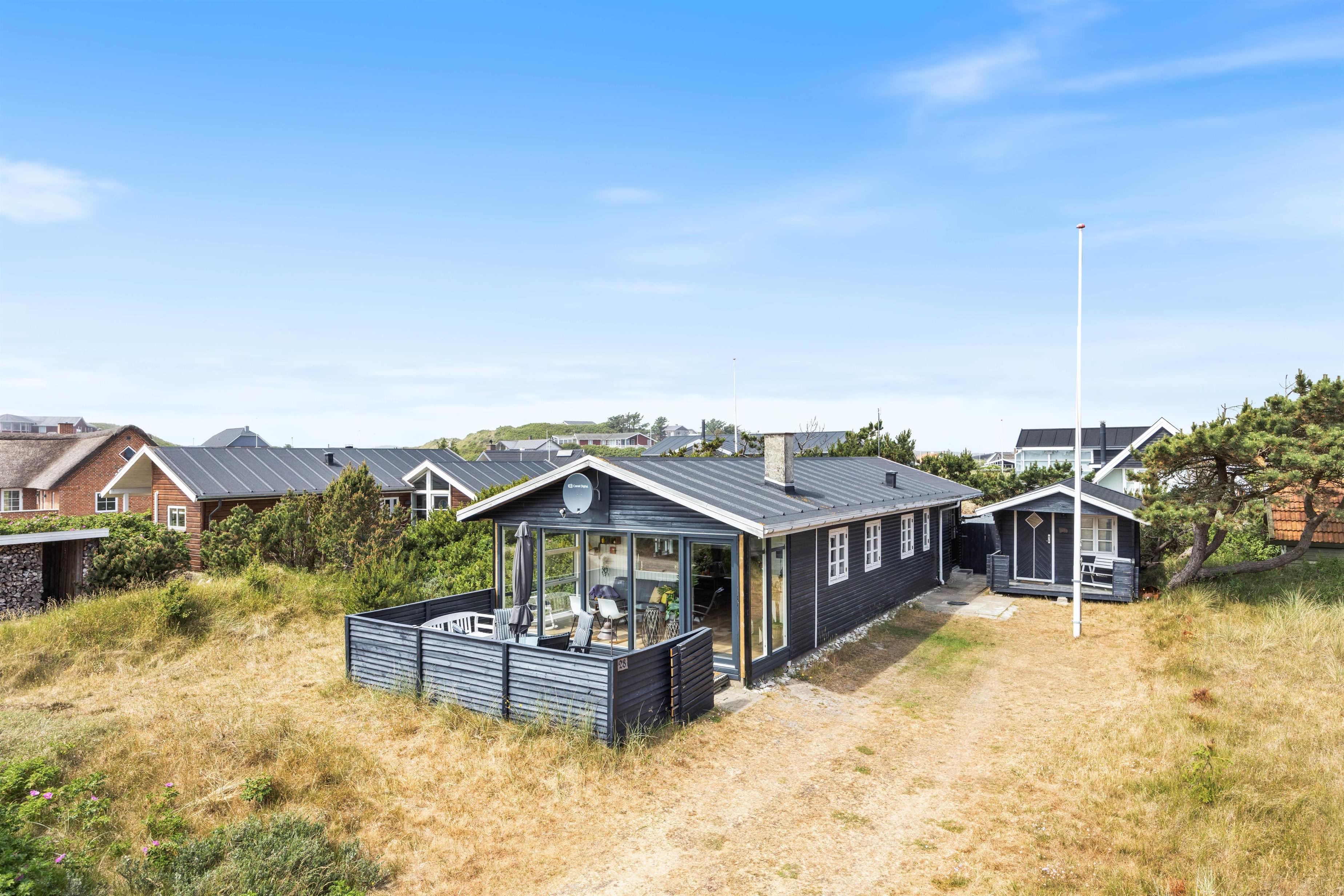 På Molsvej 28 inviterer dette hyggelige sommerhus med udestue og brændeovn inden for til en hyggelig ferie i Søndervig. Med plads til op til fem personer er sommerhuset et oplagt valg til en lille familie eller et par. Feriehuset ligger kun 500 meter fra det smukke Vesterhav, og I er desuden velkomne til at have op til to hunde med på jeres ferie i sommerhuset.