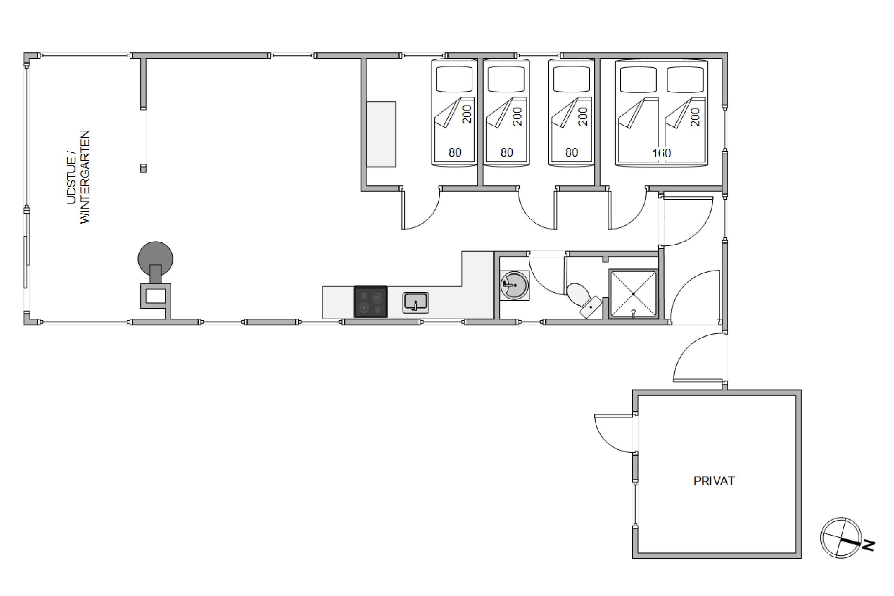 Fra sommerhusets udestue kan I bevæge jer videre ud på terrassen, hvor I kan sætte jer godt til rette i havemøbler og liggestole på de feriedage, hvor vejret er i top. Terrassen vender mod syd, og I vil derfor kunne nyde solen det meste af dagen.