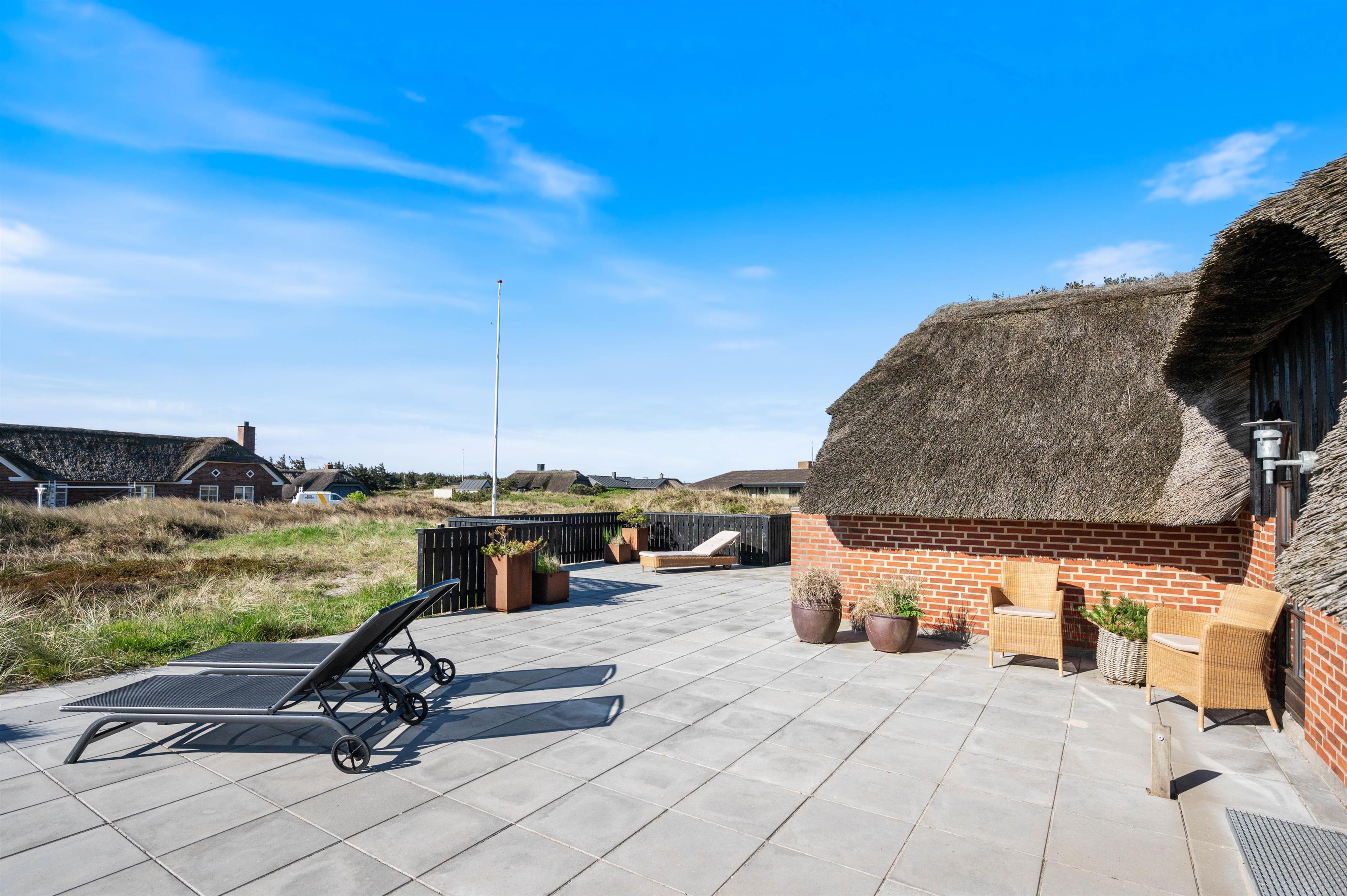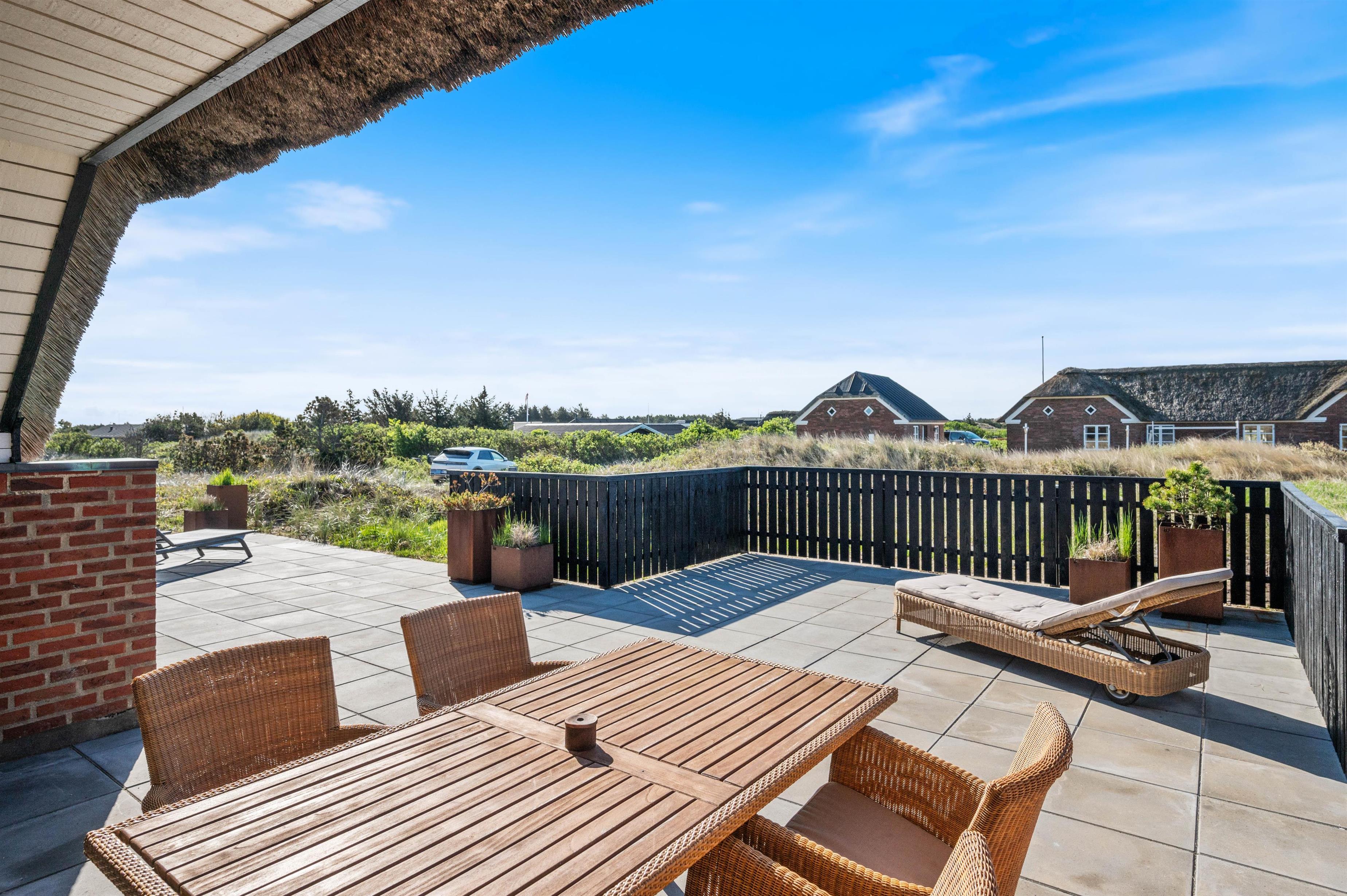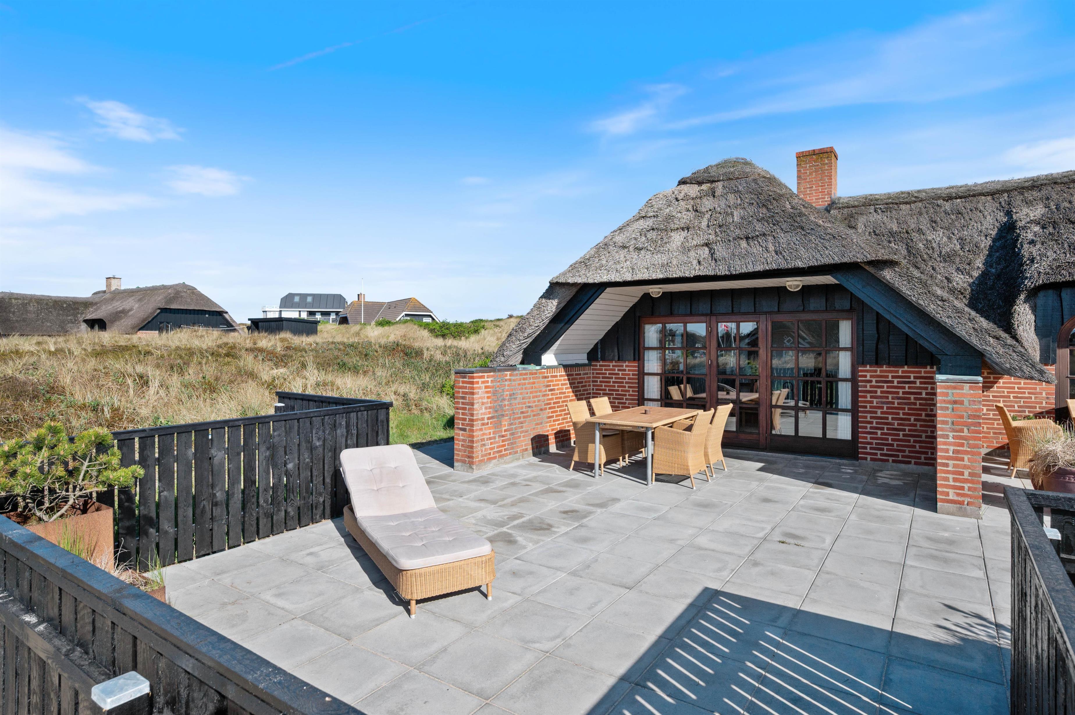 Fra opholdsrummet er der udgang til husets terrasser med en overdækket, afskærmet og åben del. Her kan I rigtig dase på de varme sommerdage med en kold drink eller læse en god bog i skyggen under den overdækkede terrasse. Om aftenen kan I tænde op i grillen, spise en dejlig middag og nyde et glas vin i den gyldne aftensol.