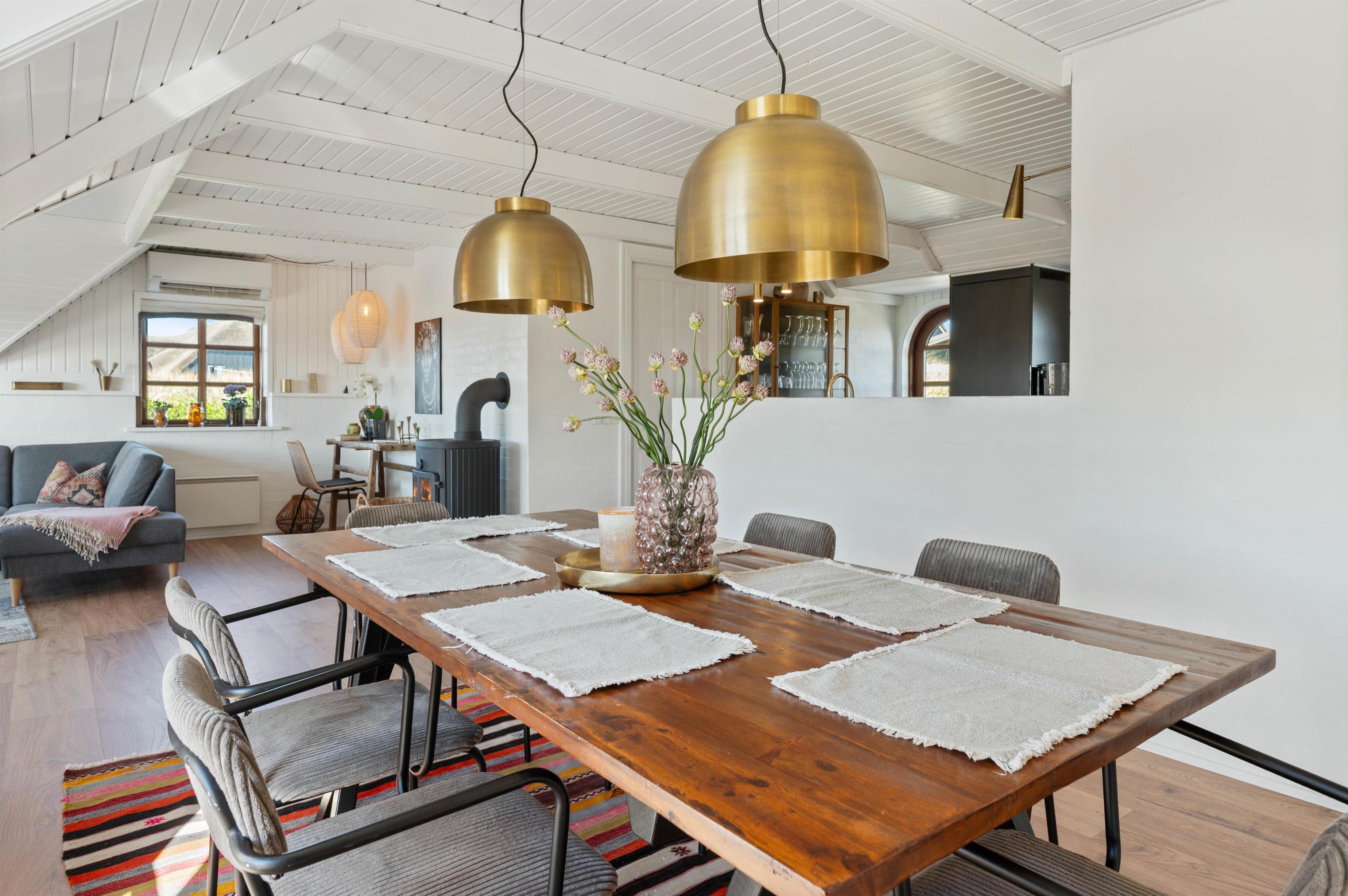 Allerede udefra udstråler det stråtækte feriehus på Nordsøvej 318 ferieidyl i stor stil, og denne atmosfære bliver fulgt op af den flotte indretning, hvor lyse farver, flot møblement og små detaljer binder hele huset sammen og skaber en harmonisk stemning. Feriehuset har både fået helt et nyt badeværelse og et nyt køkken, som ligger i åben forbindelse med stuen og spiseafdelingen. Det åbne opholdsrum inviterer til hyggelige stunder med madlavning, kortspil og afslapning på sofaen foran den knitrende brændeovn.