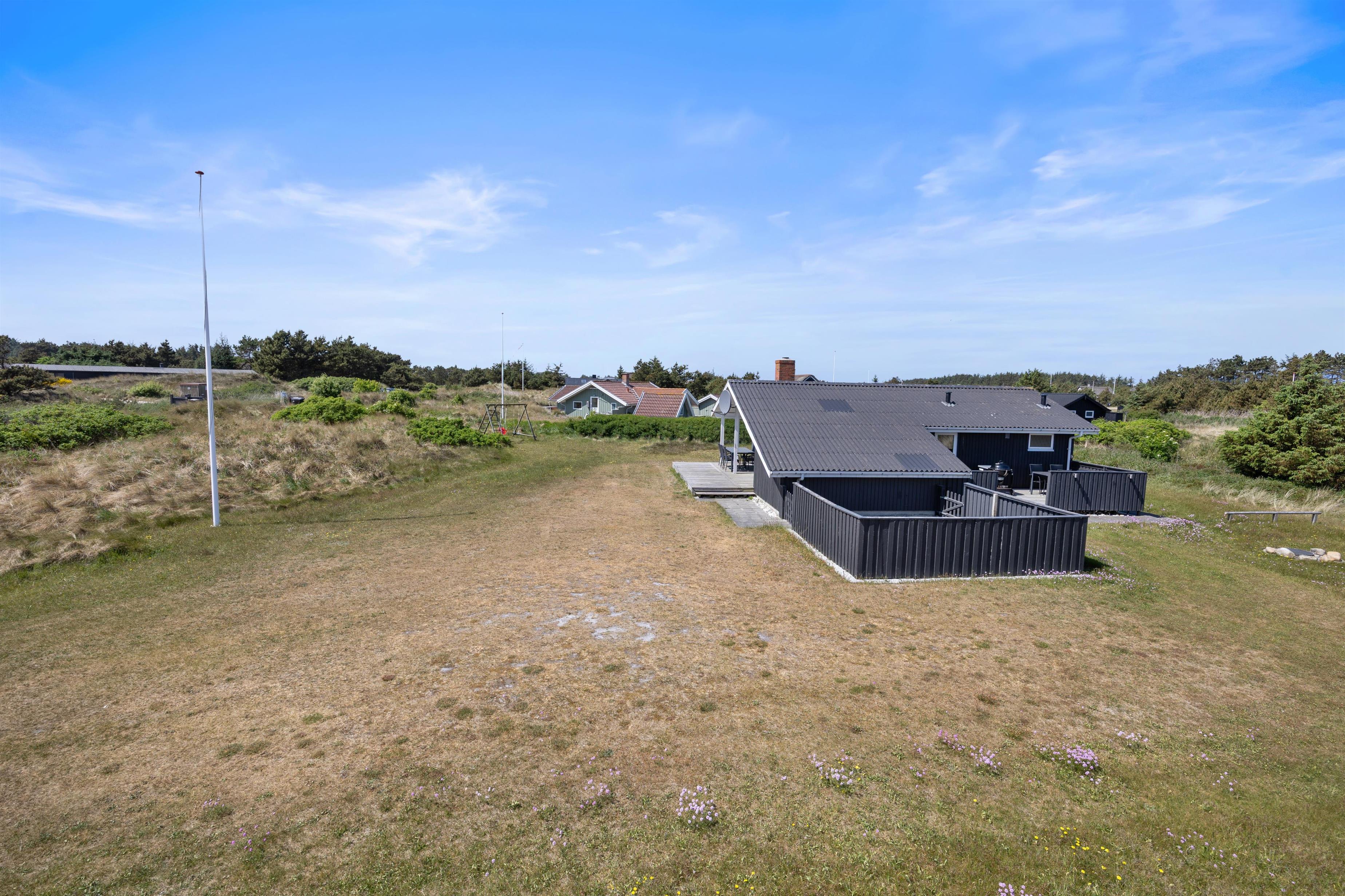 Et hit er husets terrasser. Her er mange hyggelige læ-kroge og et overdækket område, som kan forlænge udetiden på de lune sommeraftener. Grunden er åben med en stor græsplæne, og basketballkurven og fodboldmålene står klar til mange timers sjov for både store og små feriegæster.