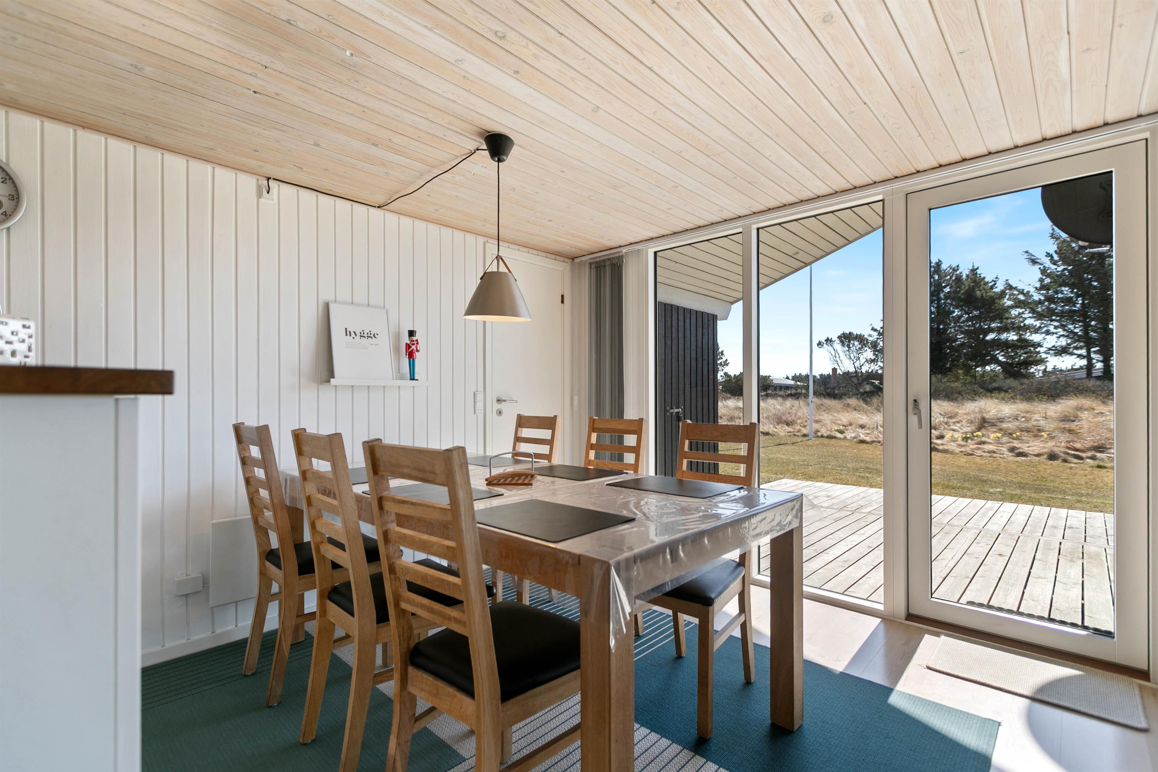 Så snart I ankommer til feriehuset, vil I mærke feriestemningen. Det fine sorte træhus ligger dejligt på en stor lys grund, hvor det dufter af hav, lyng og fyrretræer. Feriehuset er blevet renoveret i 2019, og det fremstår rigtig hyggelig og lyst med et flot nyt køkken, hvor der er alt hvad man kan forvente med bl.a. opvaskemaskine og induktionskogeplade. Køkkenet er i åben forbindelse til stuen, som har brændeovnen til at skabe den helt rigtige feriestemning. Her er også to dejlige sofaer, hvor I kan nyde fredagsslikket, imens I streamer jeres yndlingsfilm via Chromecasten.