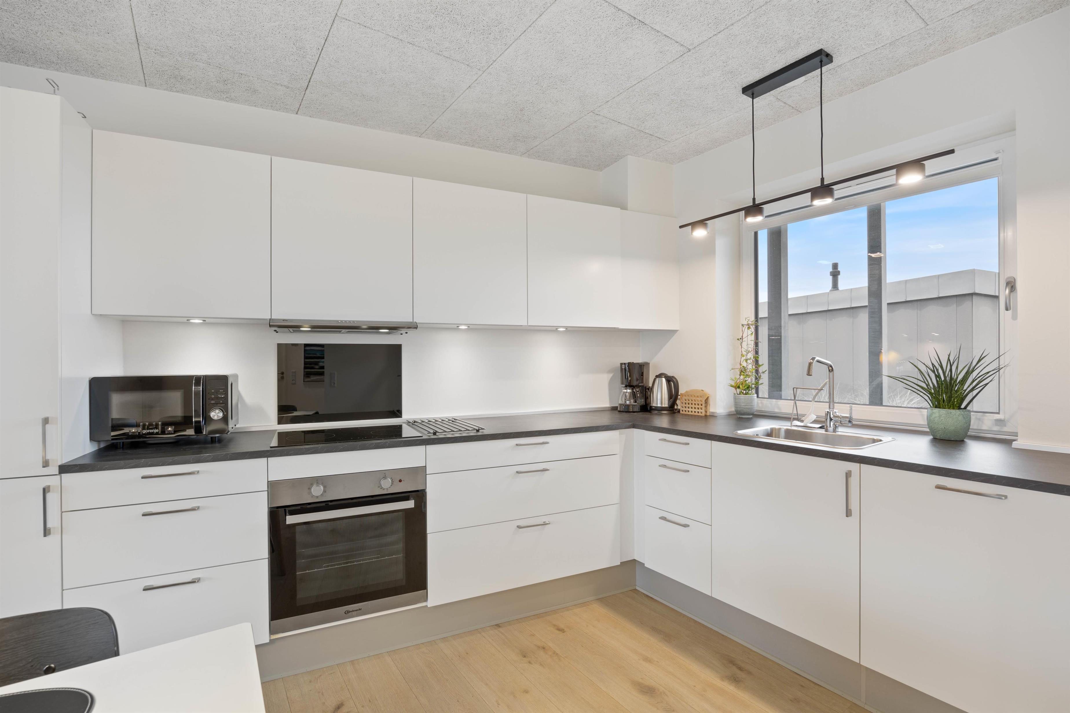 Opholdsrummet er nydeligt indrettet med moderne interiør i sorte og hvide nuancer med enkelte farvedrys, der bryder den flotte monokrome stil. Alt i rummet oser af god smag og god kvalitet. Lige fra valget af køkkenlåger til møbler og brugsgenstande.