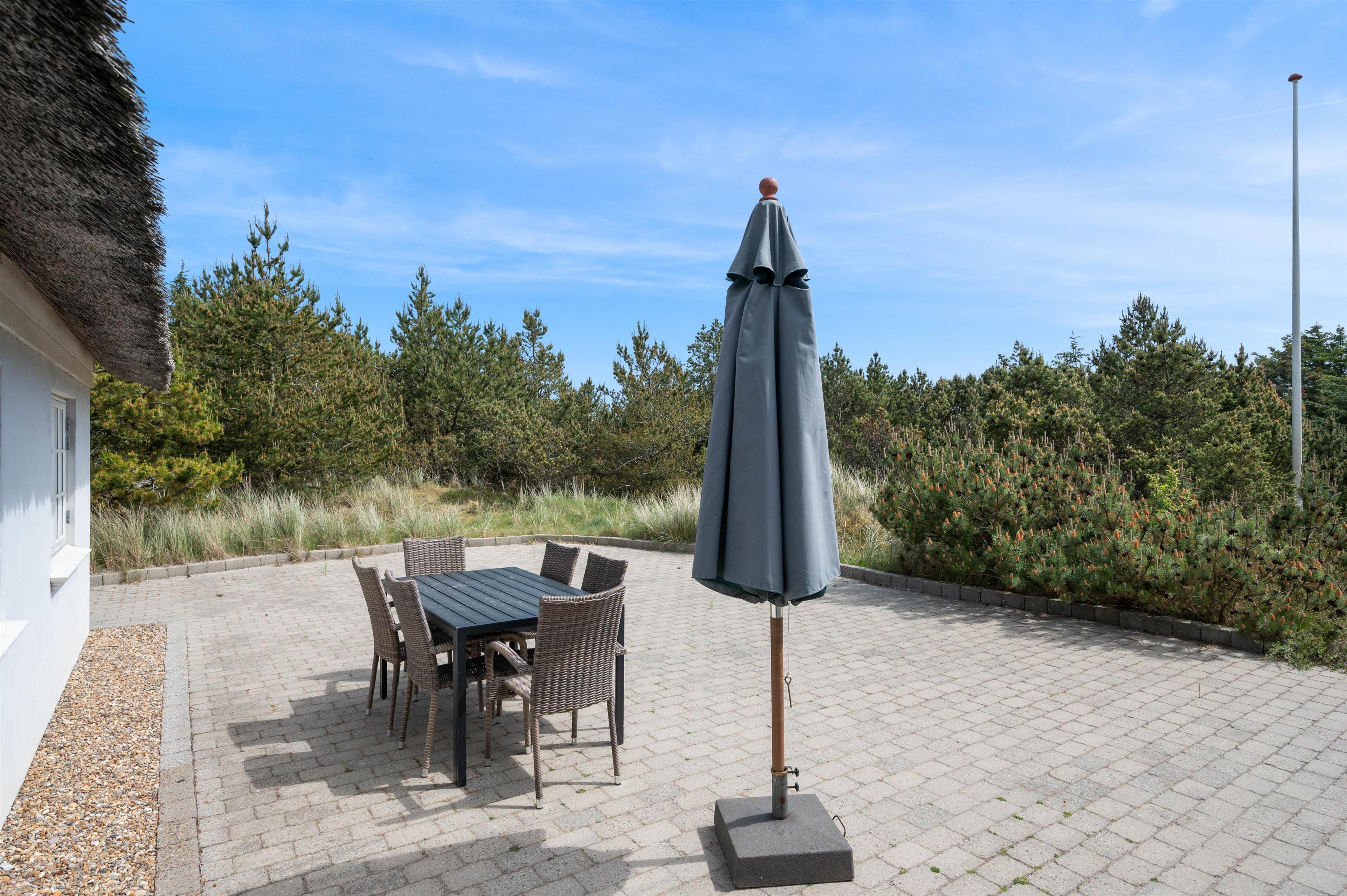 Omkring sommerhuset løber en stor fliselagt terrasse, så her kan I nyde solen hele dagen lang. For at I kan få mest muligt ud af de varme dage, står der både havemøbler og liggestole klar til jer. På grillen kan I tilberede en lækker middag, som selvfølgelig også skal nydes på terrassen.