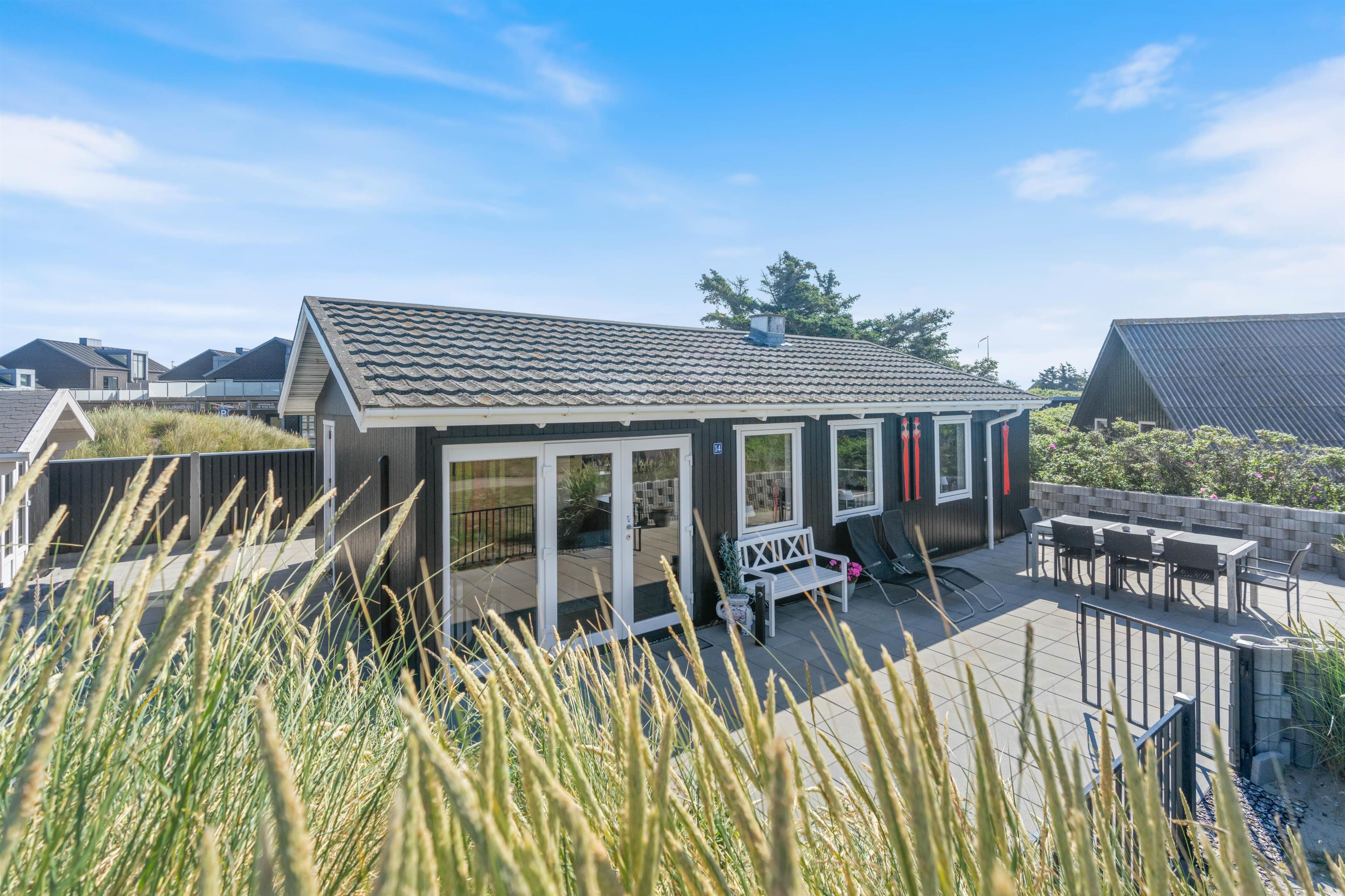Fra stuen og det ene af feriehusets soveværelser er der udgang til en stor lukket og delvist overdækket terrasse, hvor I kan nyde de gode solskinsdage og den friske, vestjyske luft i fulde drag.