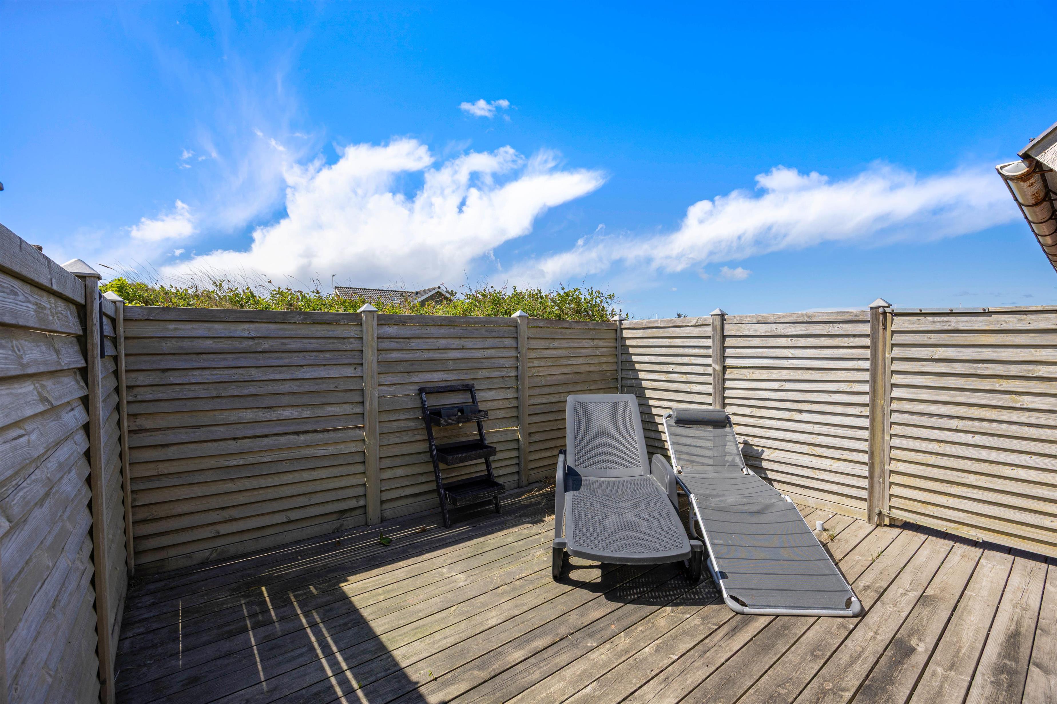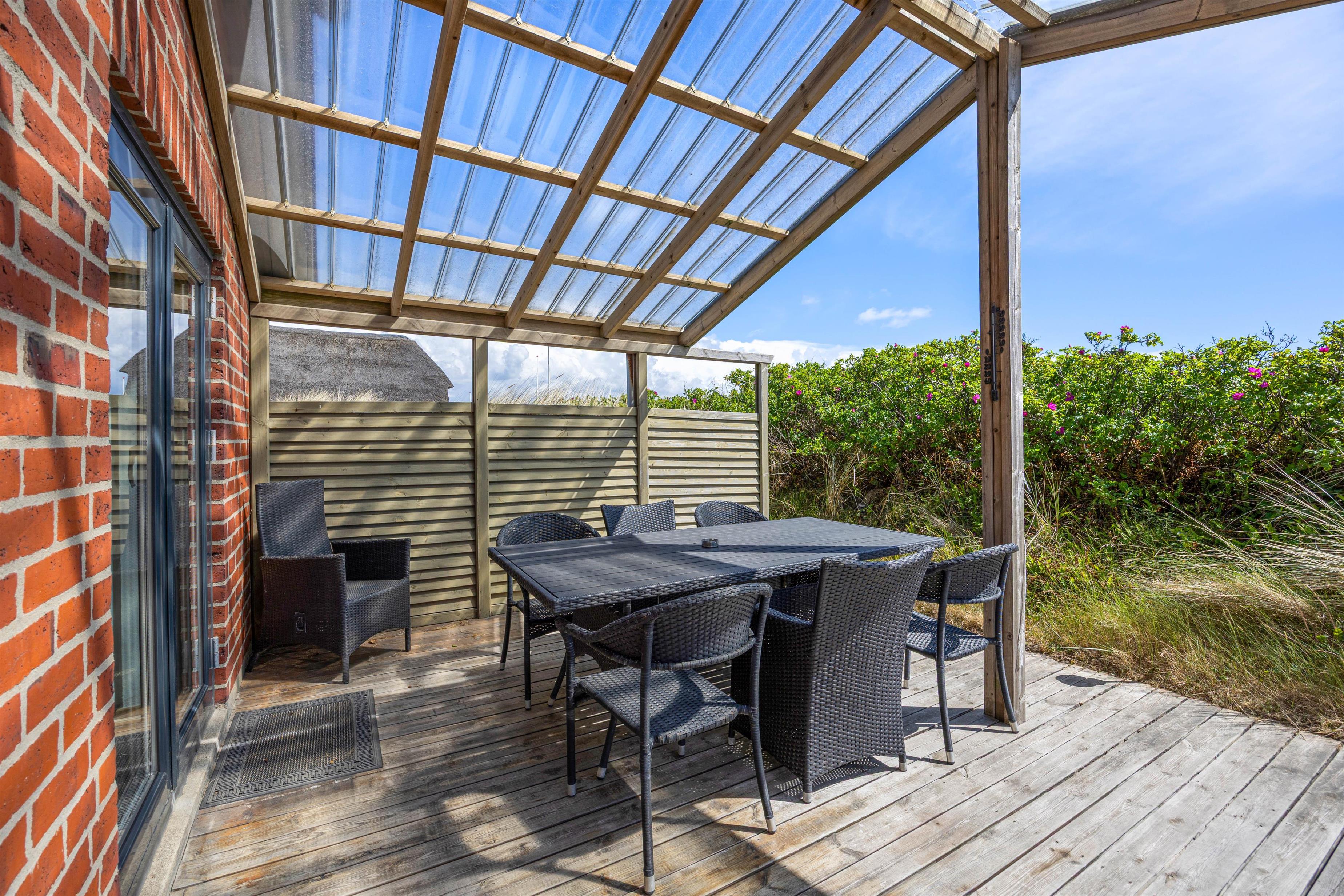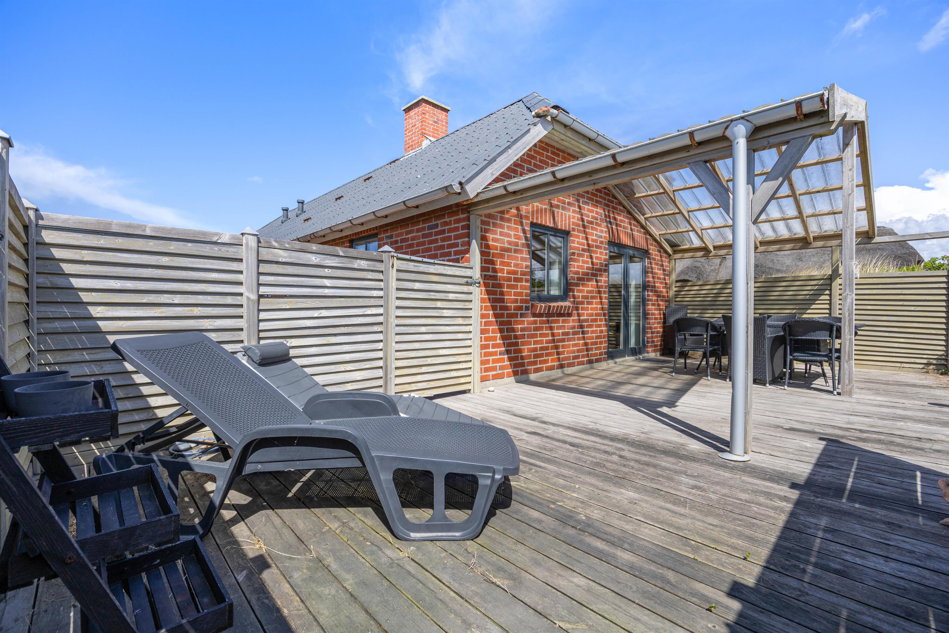 Fra stuen kommer I ud på terrassen, hvor I kan nyde den friske havluft i stort set al slags vejr. Den overdækkede del af terrassen gør, at I kan sidde i ly for regnen, og når vejret melder fuld sommersol, kan I helt uforstyrret dase på solsengene takket være den gode afskærmning.