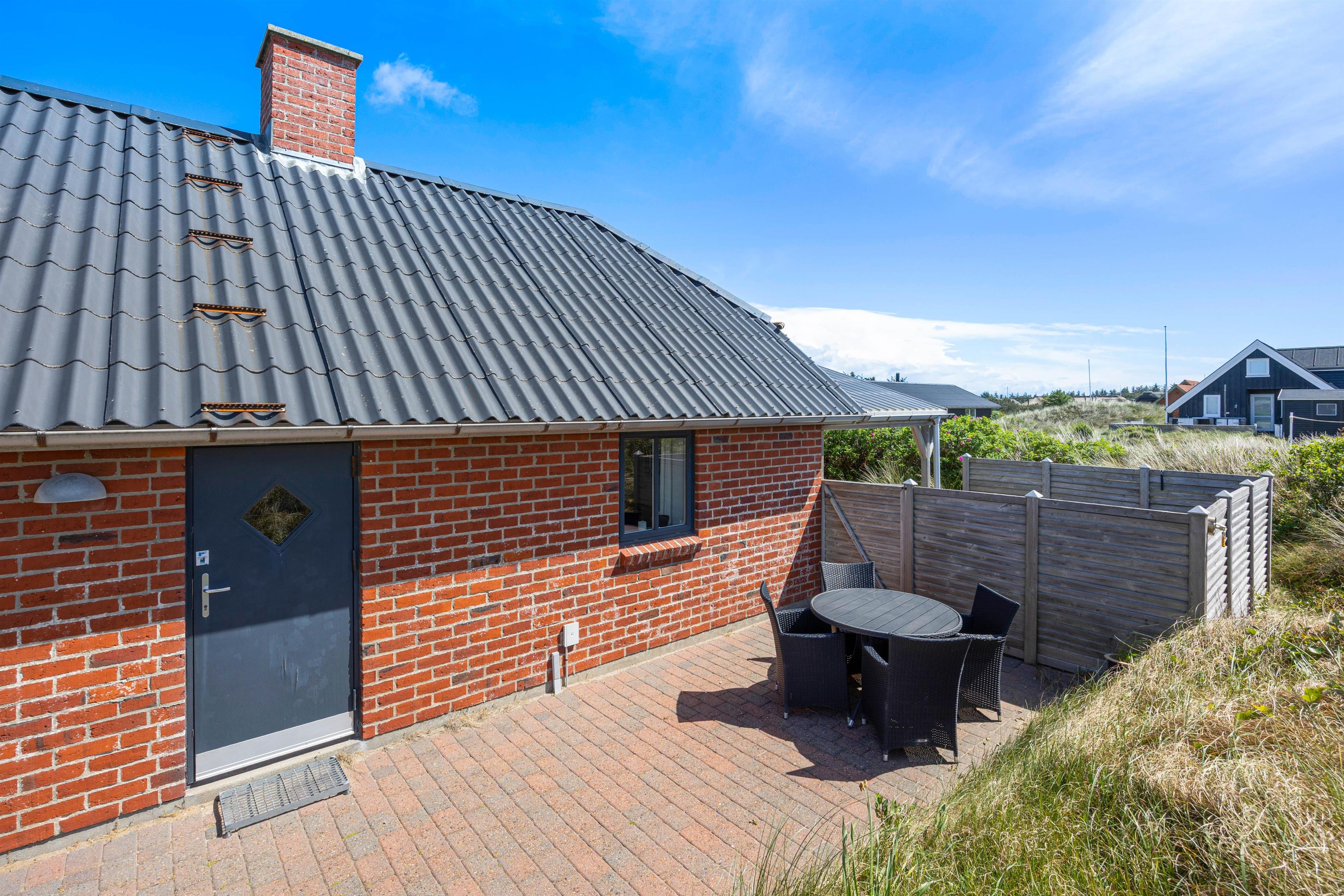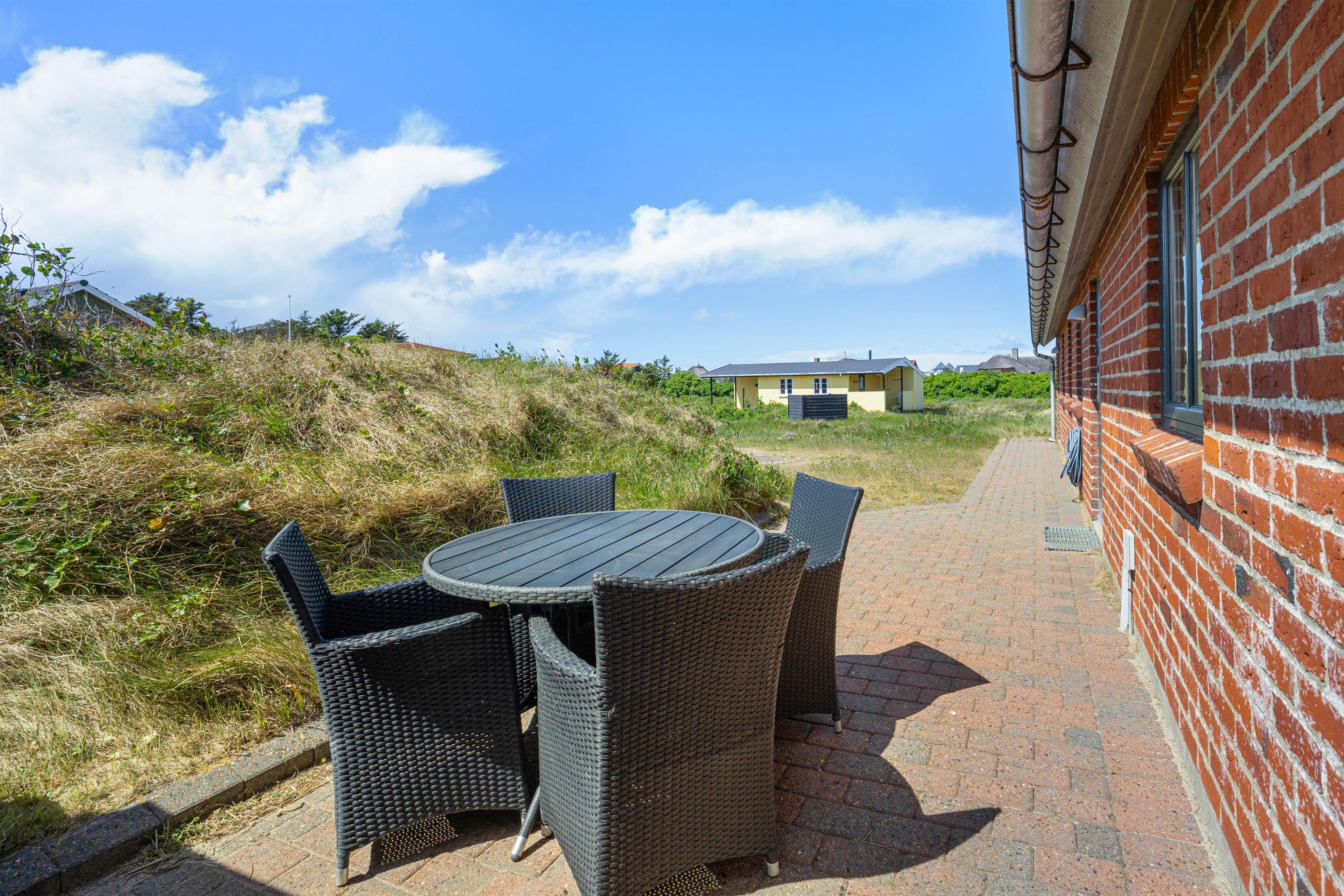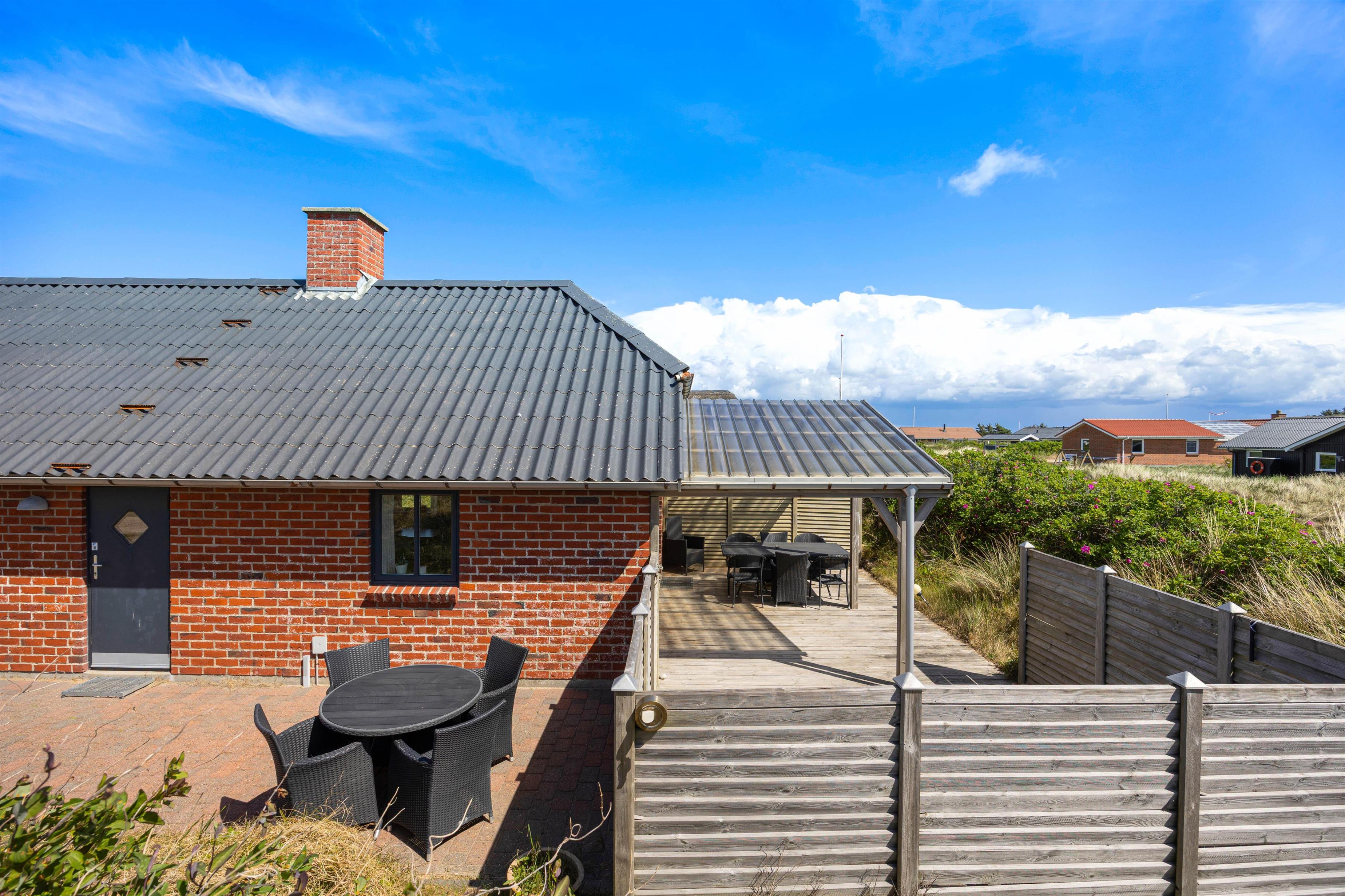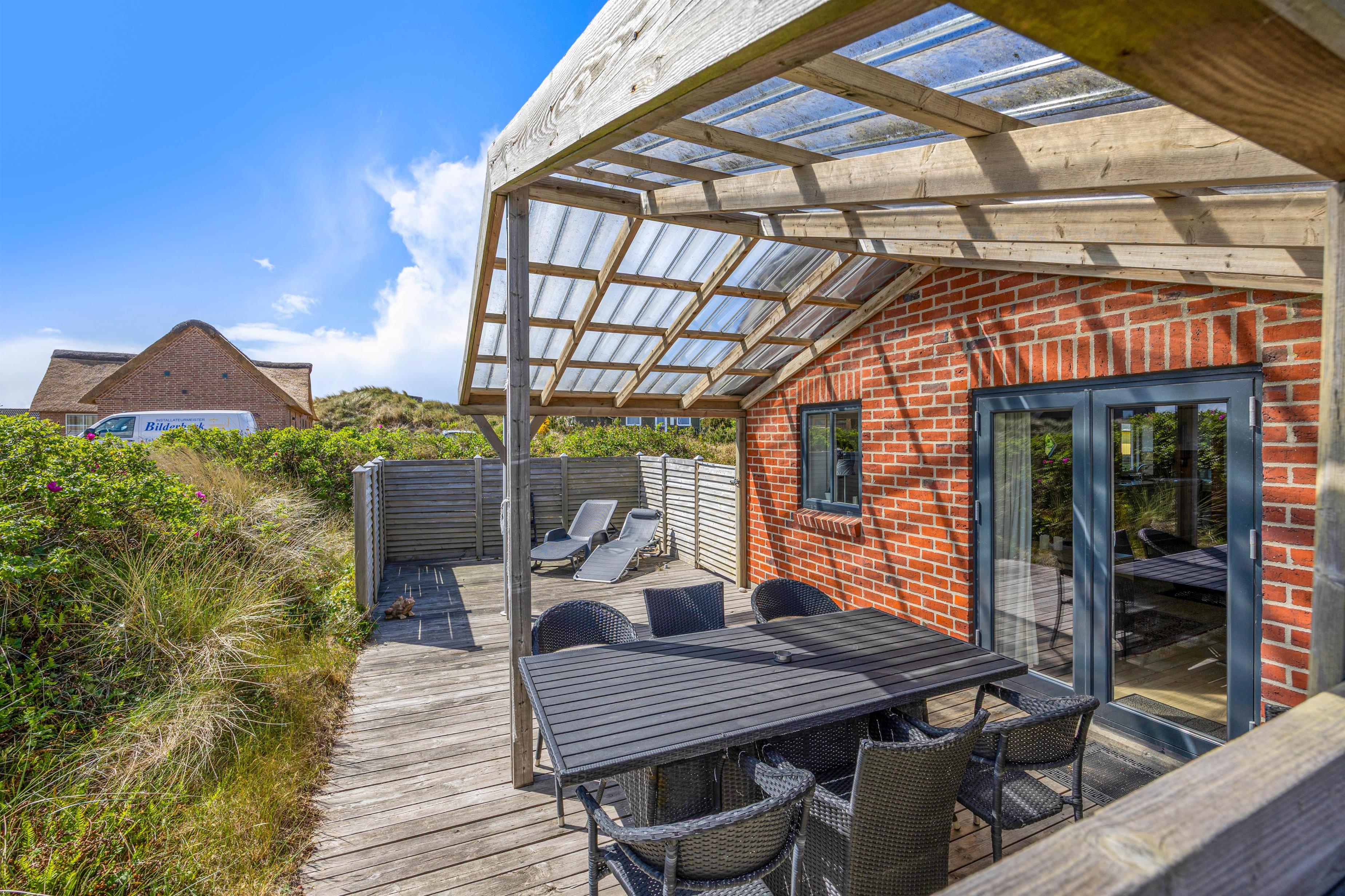 Fra stuen kommer I ud på terrassen, hvor I kan nyde den friske havluft i stort set al slags vejr. Den overdækkede del af terrassen gør, at I kan sidde i ly for regnen, og når vejret melder fuld sommersol, kan I helt uforstyrret dase på solsengene takket være den gode afskærmning.