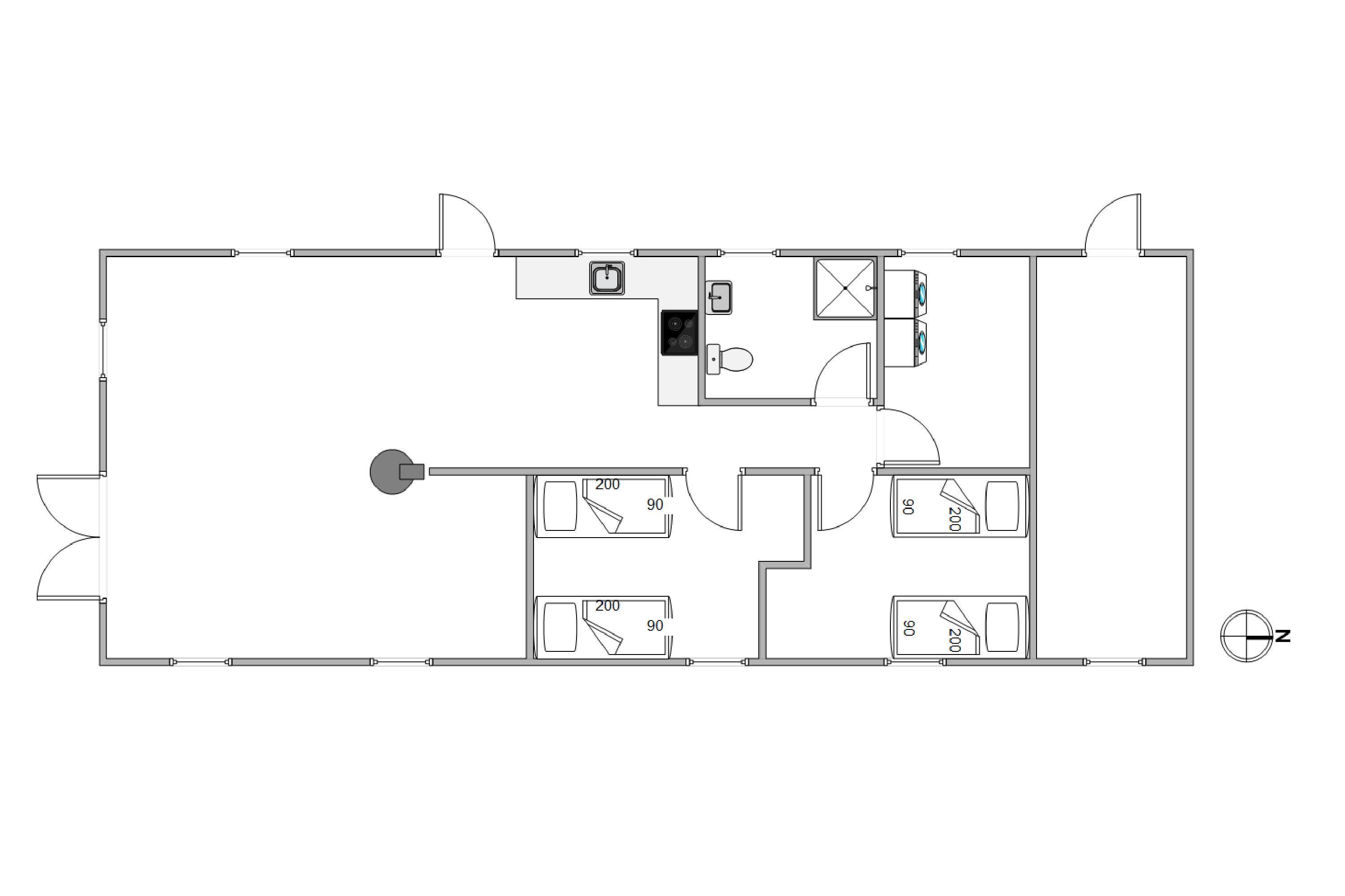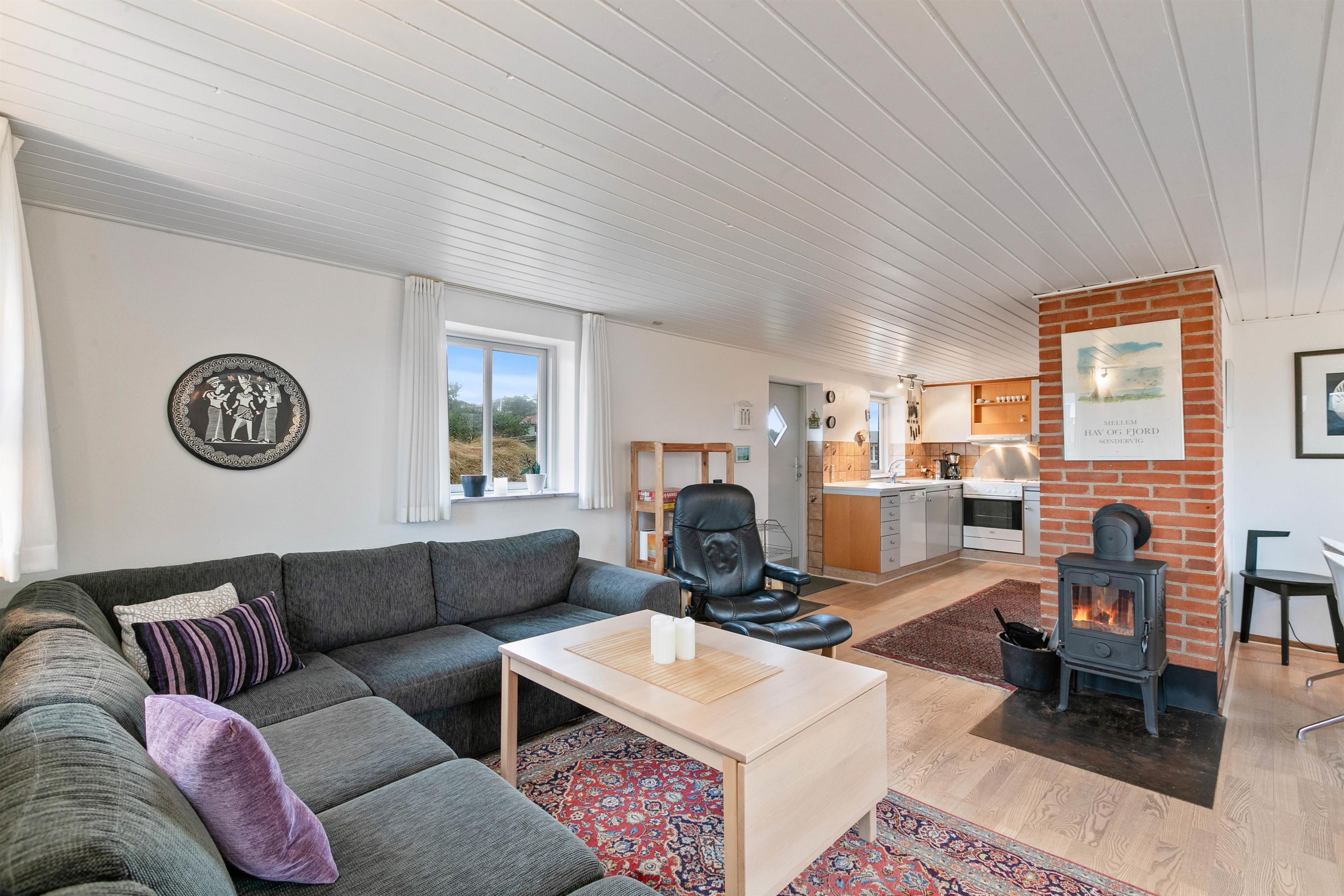 Huset er indrettet til 4 personer, og med et boligareal på 84 m² har I god plads at brede jer ud på. Især i det kombinerede opholdsrum, hvor stue, spiseafdeling og køkken smelter sammen i ét og udgør et hyggeligt mødested. Her kan I få dagene til at gå med afslapning på den dejlige hjørnesofa og sene aftener rundt om spisebordet med et glas rødvin - alt imens brændeovnens knitren høres i baggrunden.