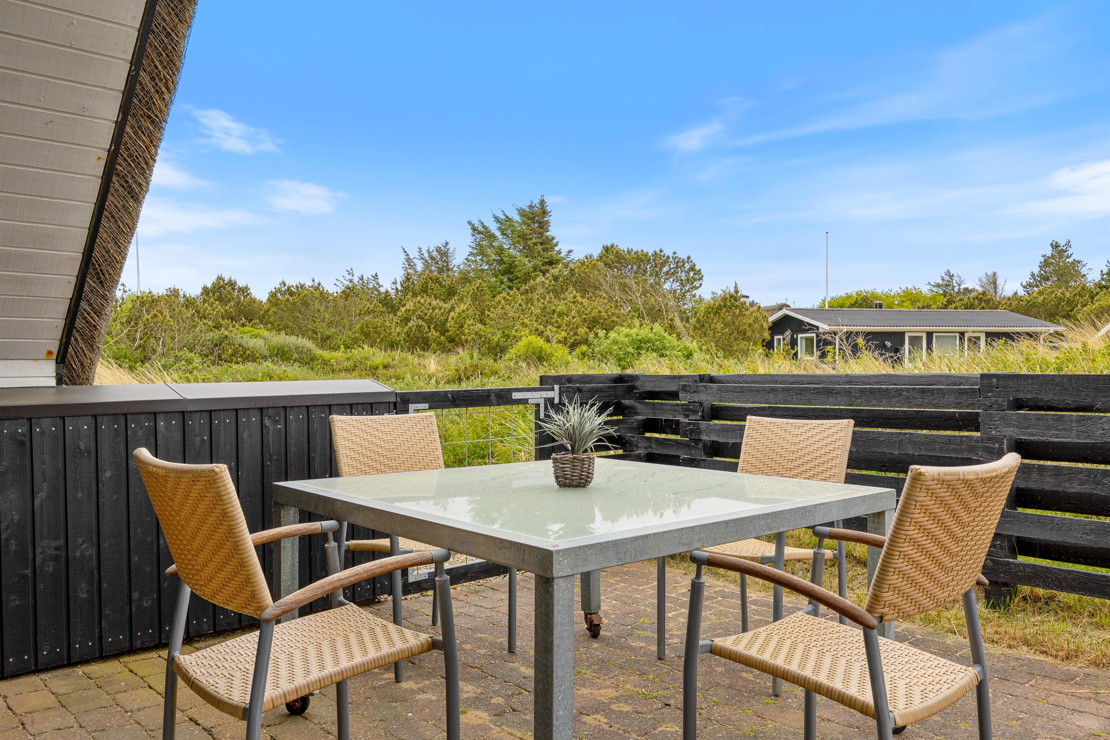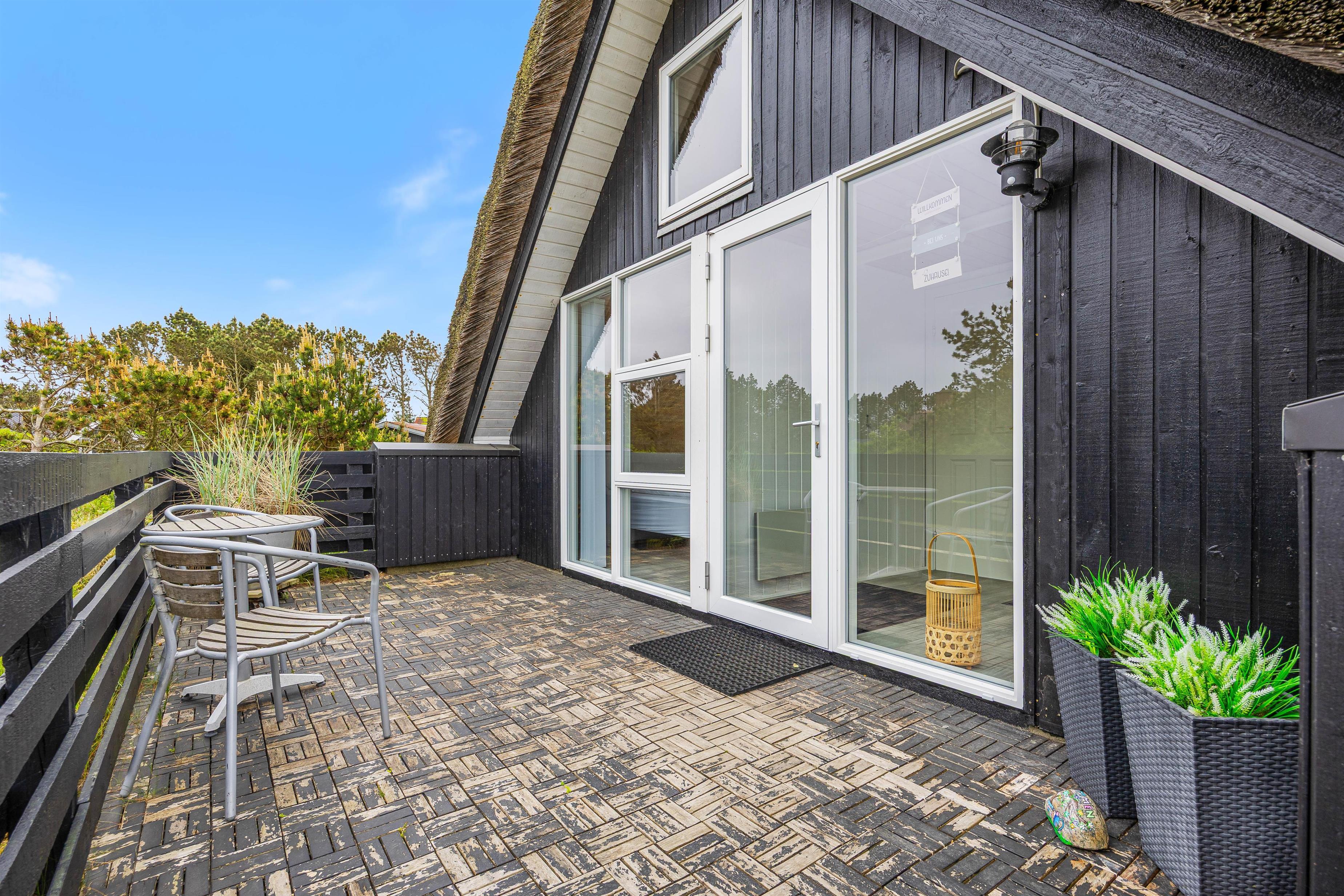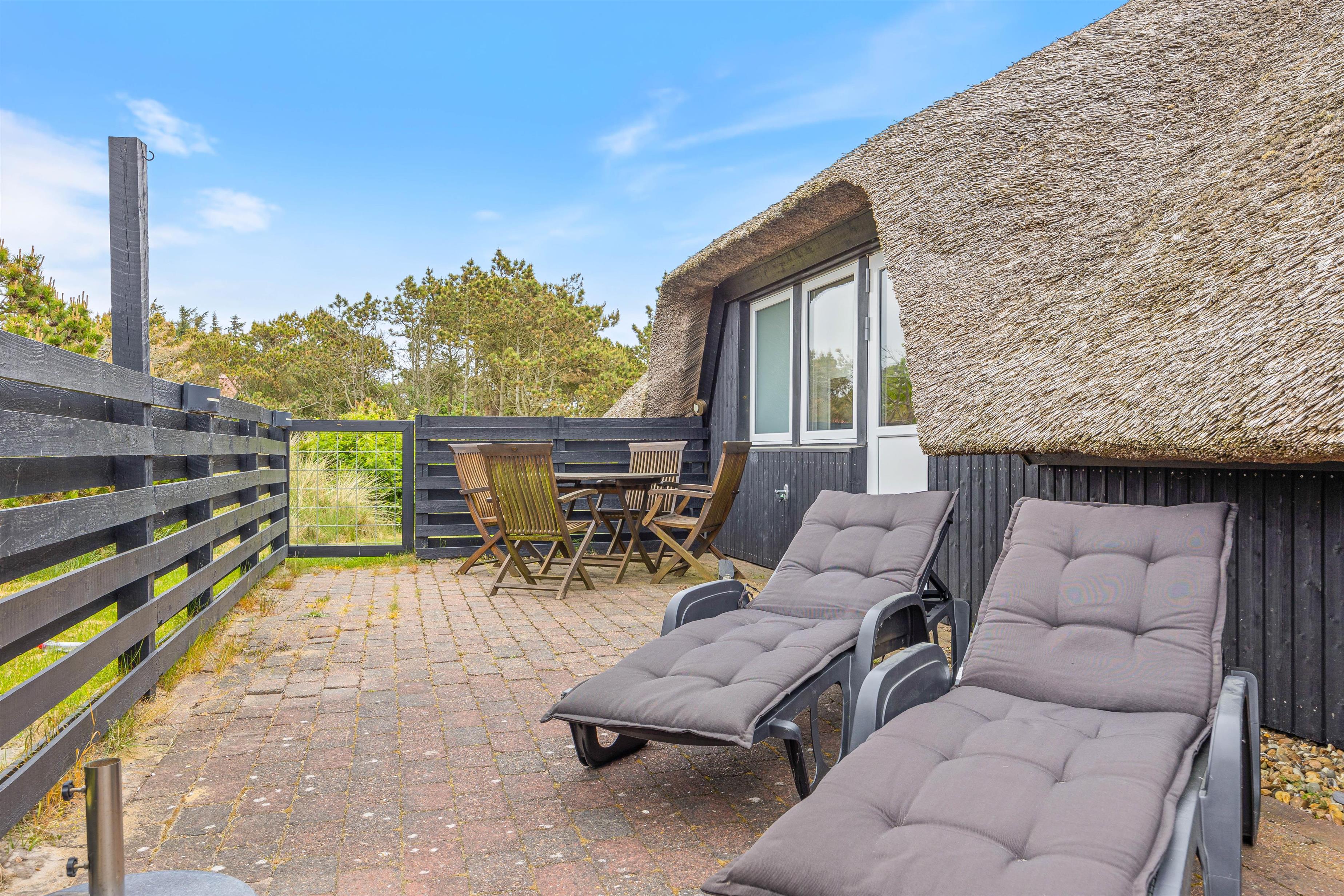 Til sommerhuset er der 2 gode terrasser. Den ene terrasse er en større en af slagsen. Den store terrasse er afskærmet og delvist overdækket, så her har I mulighed for at sidde i både ly og læ. Selvfølgelig kan I også nyde solen og dens varme stråler fra terrassen, hvor I har havemøbler og liggestole til rådighed. På den lukkede terrasse kan I trygt slappe af på liggestolene imens jeres børn og hund frit kan lege.