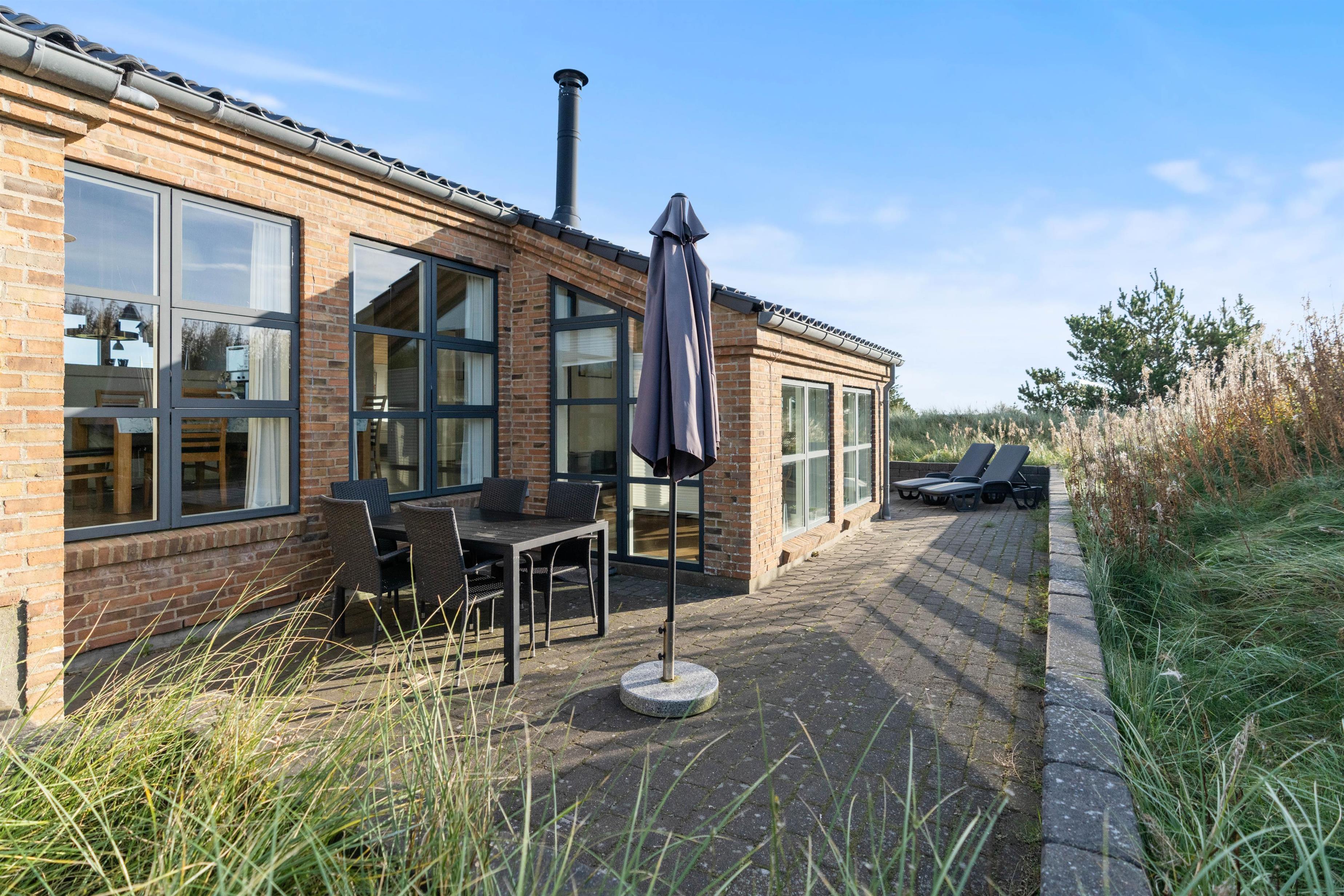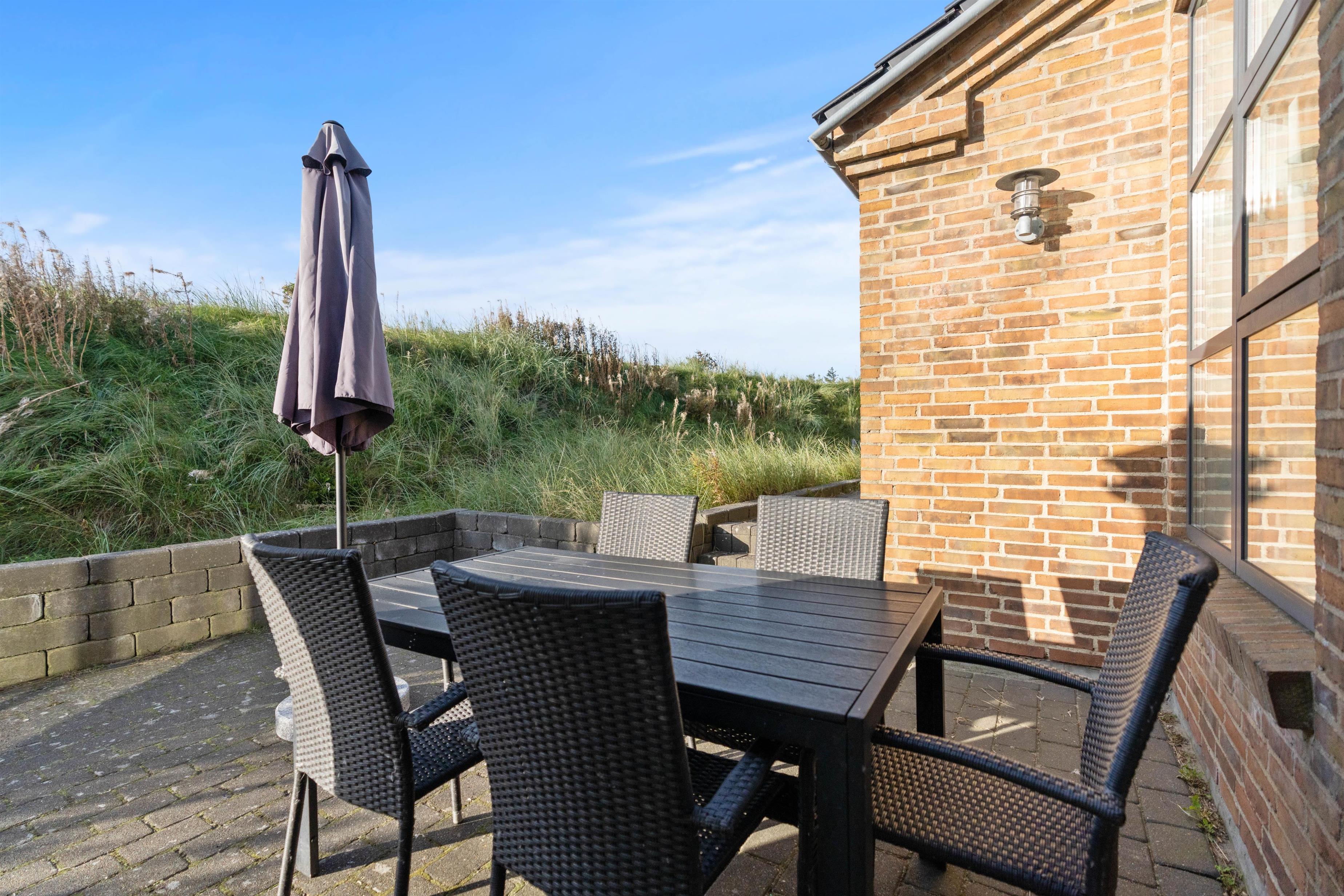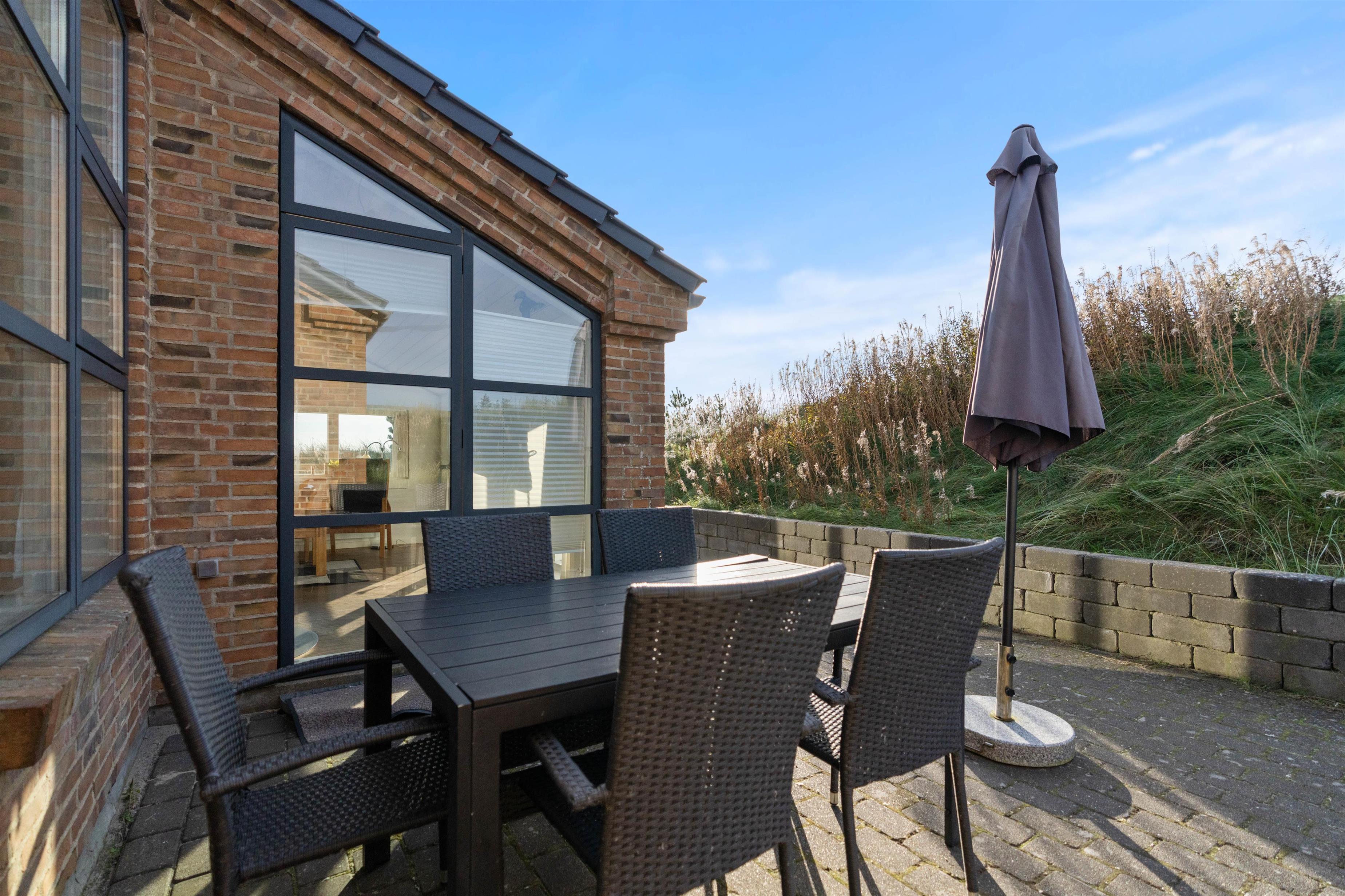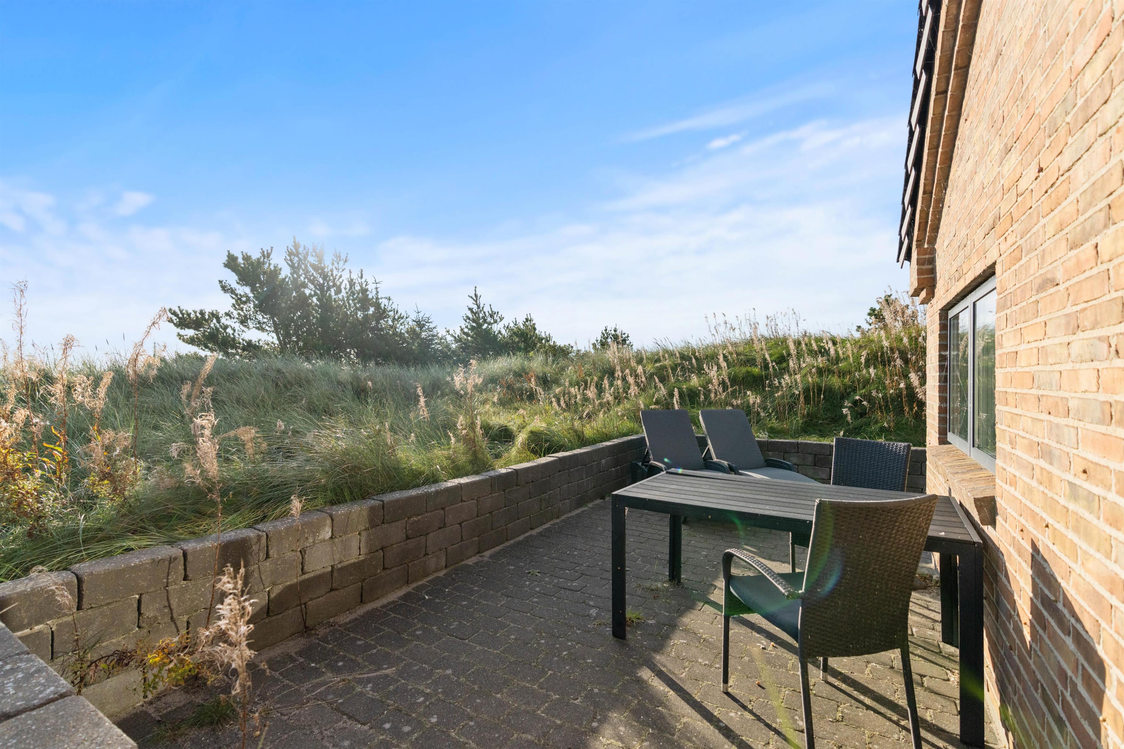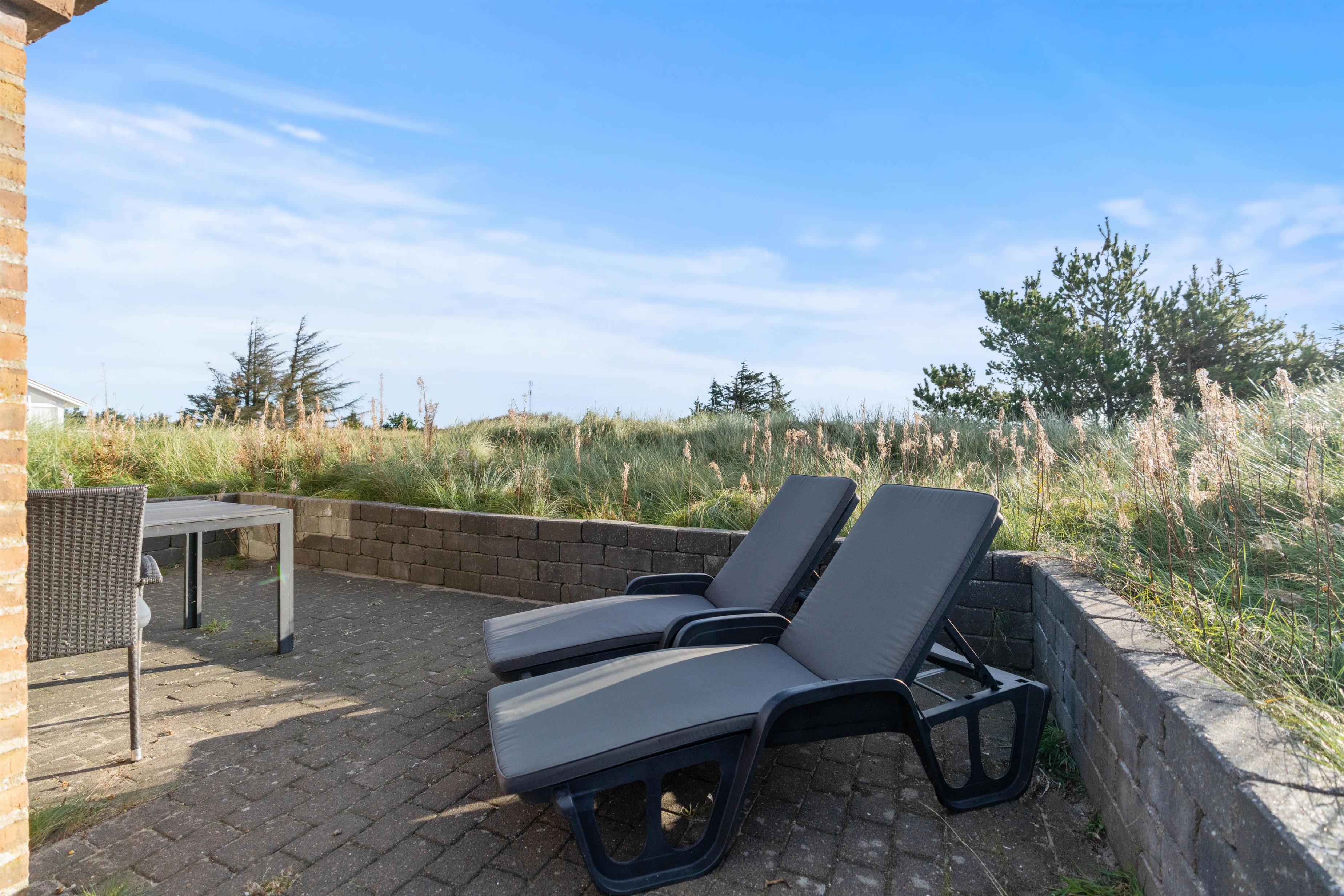 Sommerhuset har en stor nedsænket terrasse, der vender mod sydøst, hvor I kan nyde feriens solrige dage i fulde drag. Med havemøbler og liggestole til rådighed mangler I ikke noget for at tilbringe en dejlig dag i solens stråler. Som afslutning på en feriedag i det fri kan I tænde op i grillen og nyde en lækker middag på terrassen.