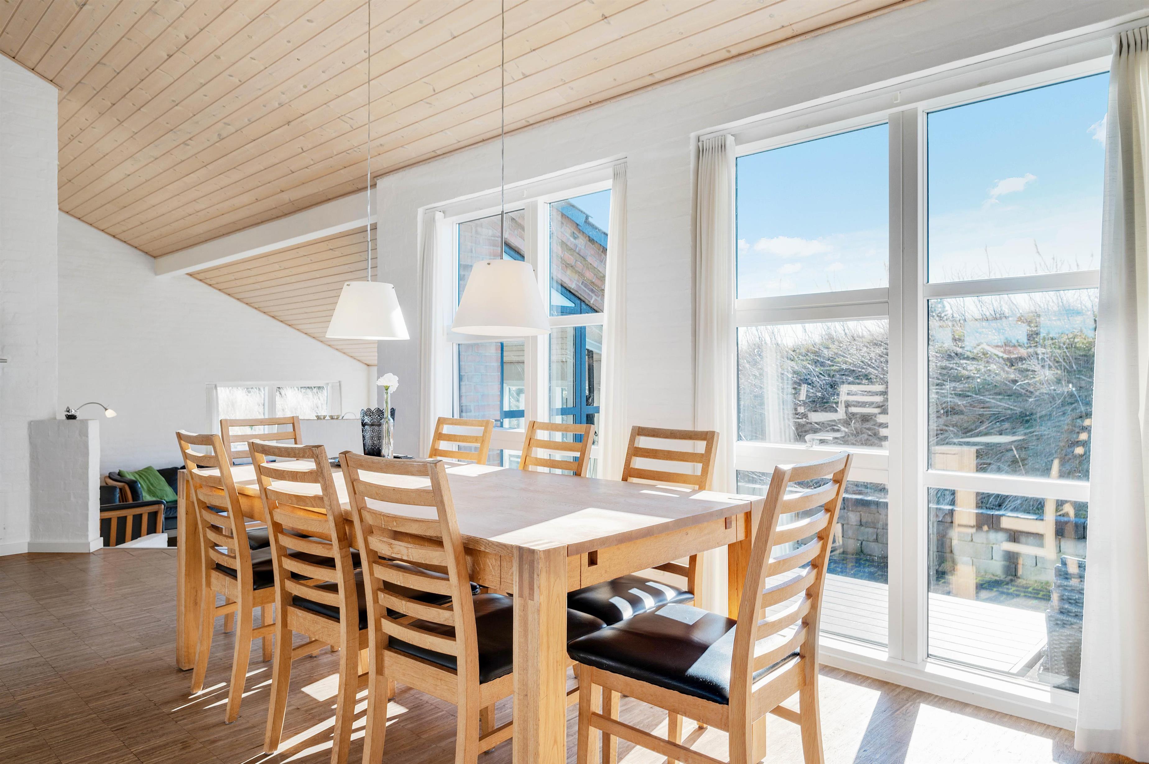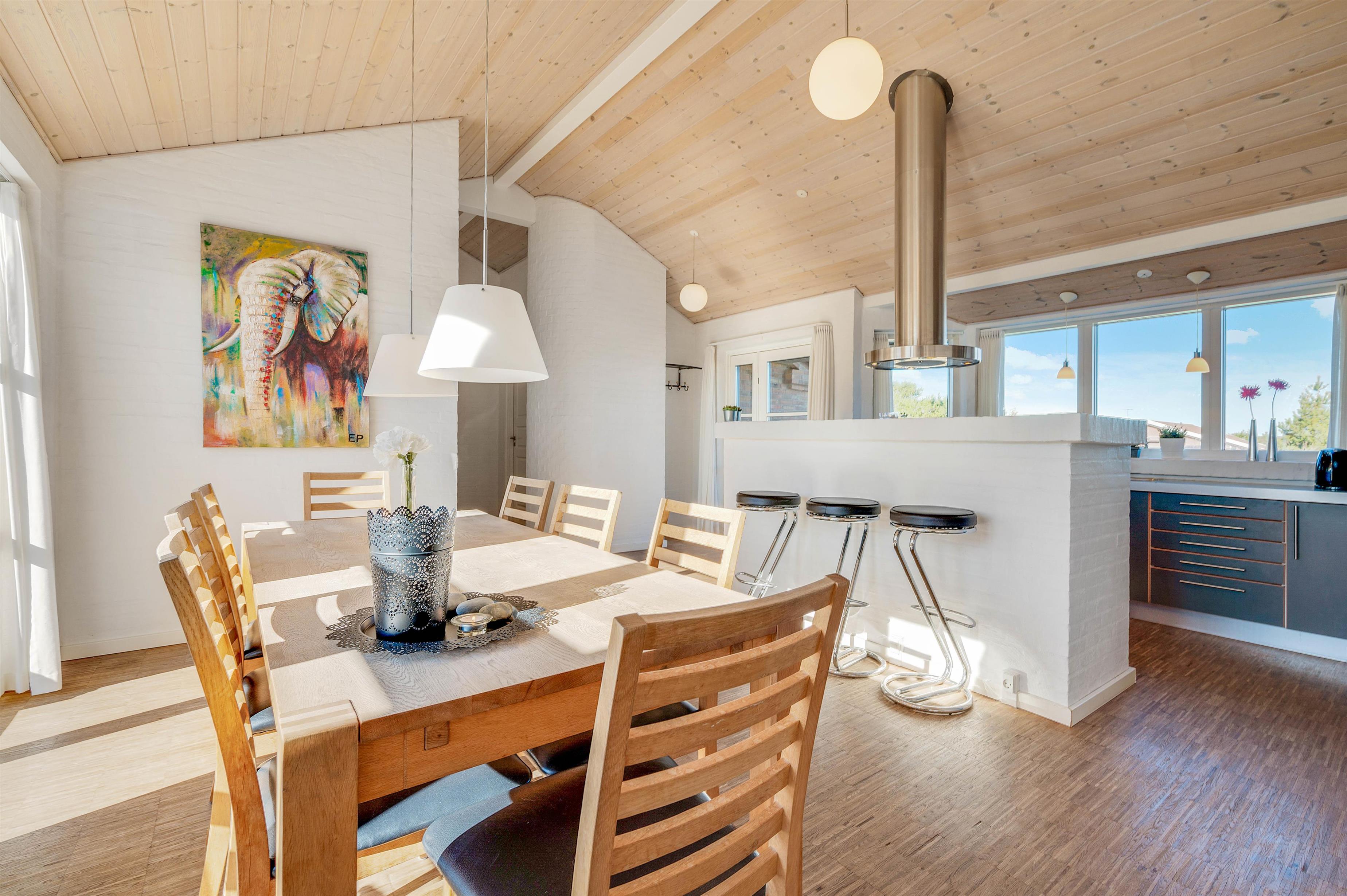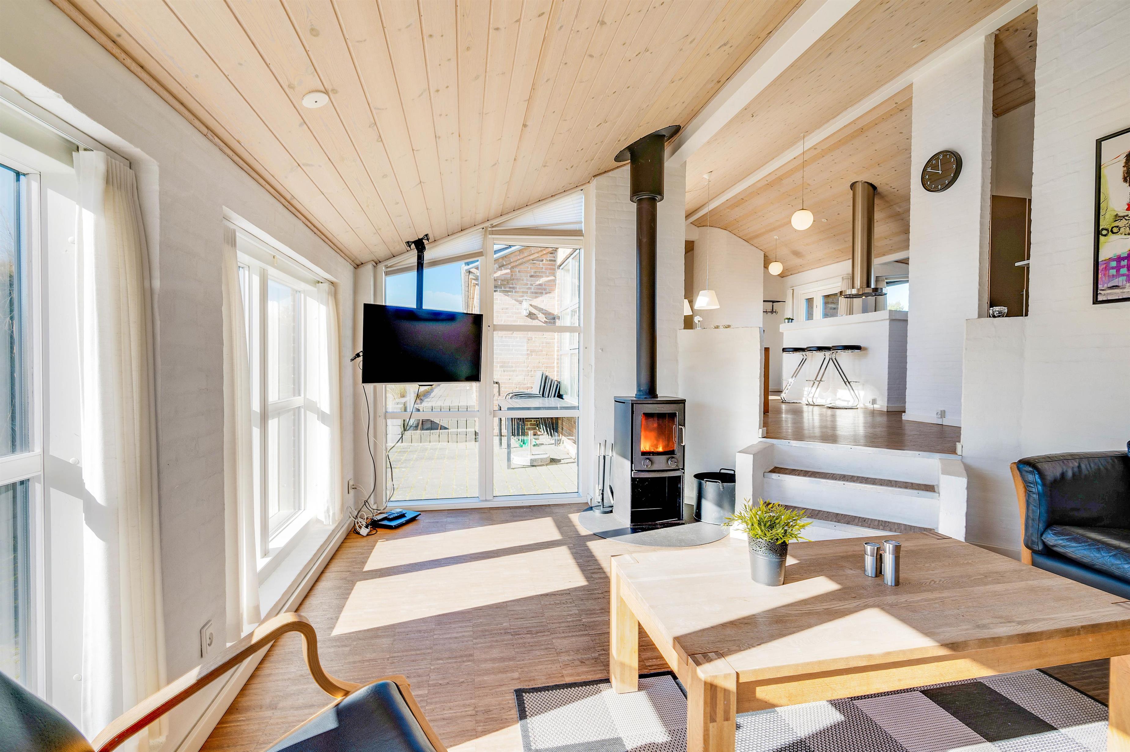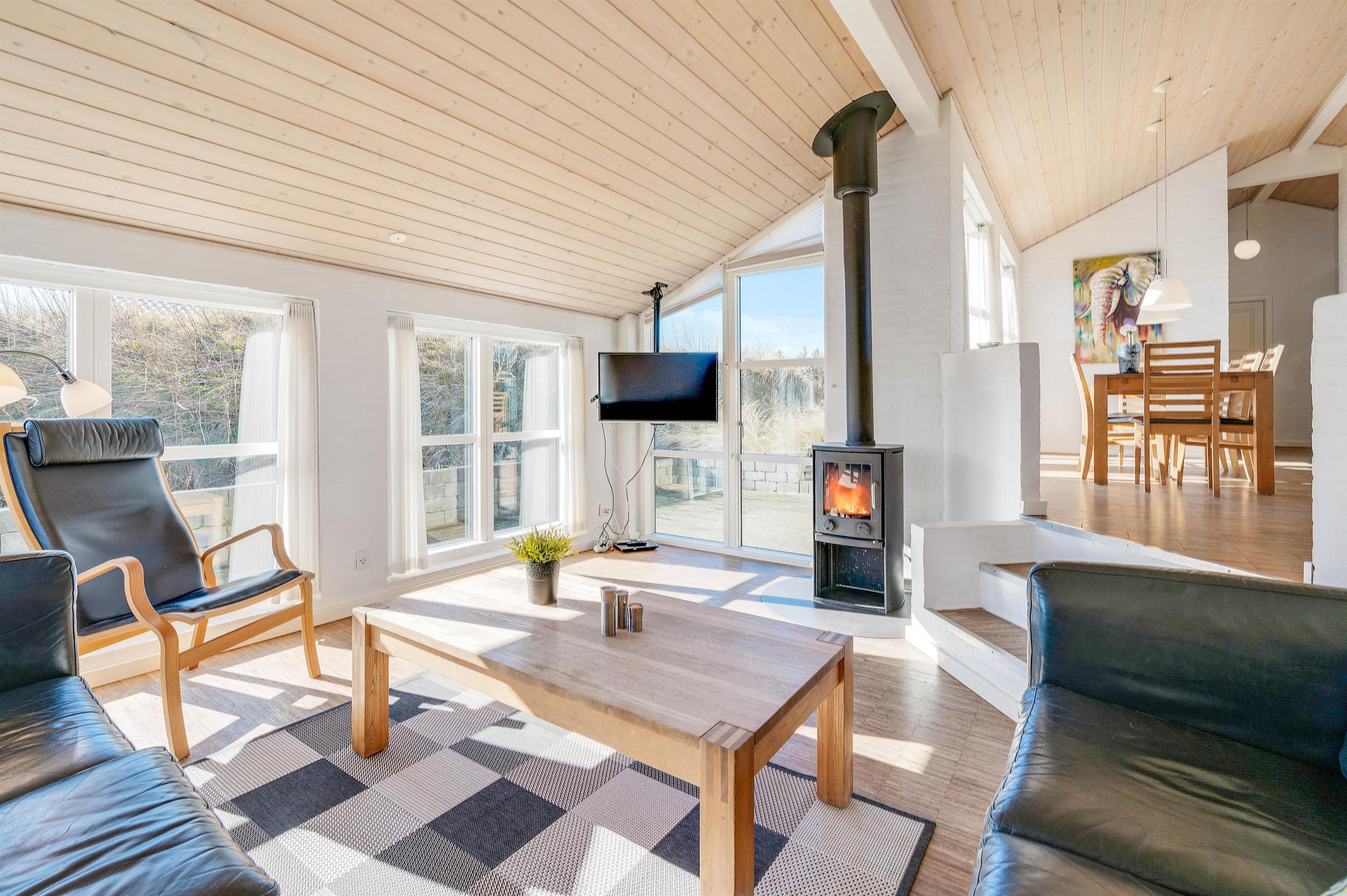 Feriehuset har god plads til alle 7 personer med sovepladser fordelt på 4 værelser. Når familien skal samles til hyggelige feriestunder, er det i opholdsstuen, det sker. I den nedsænkede stue kan I samles i sofaerne til en god film eller et sjovt spil. Brændeovnen varmer og sender stemningen i top.