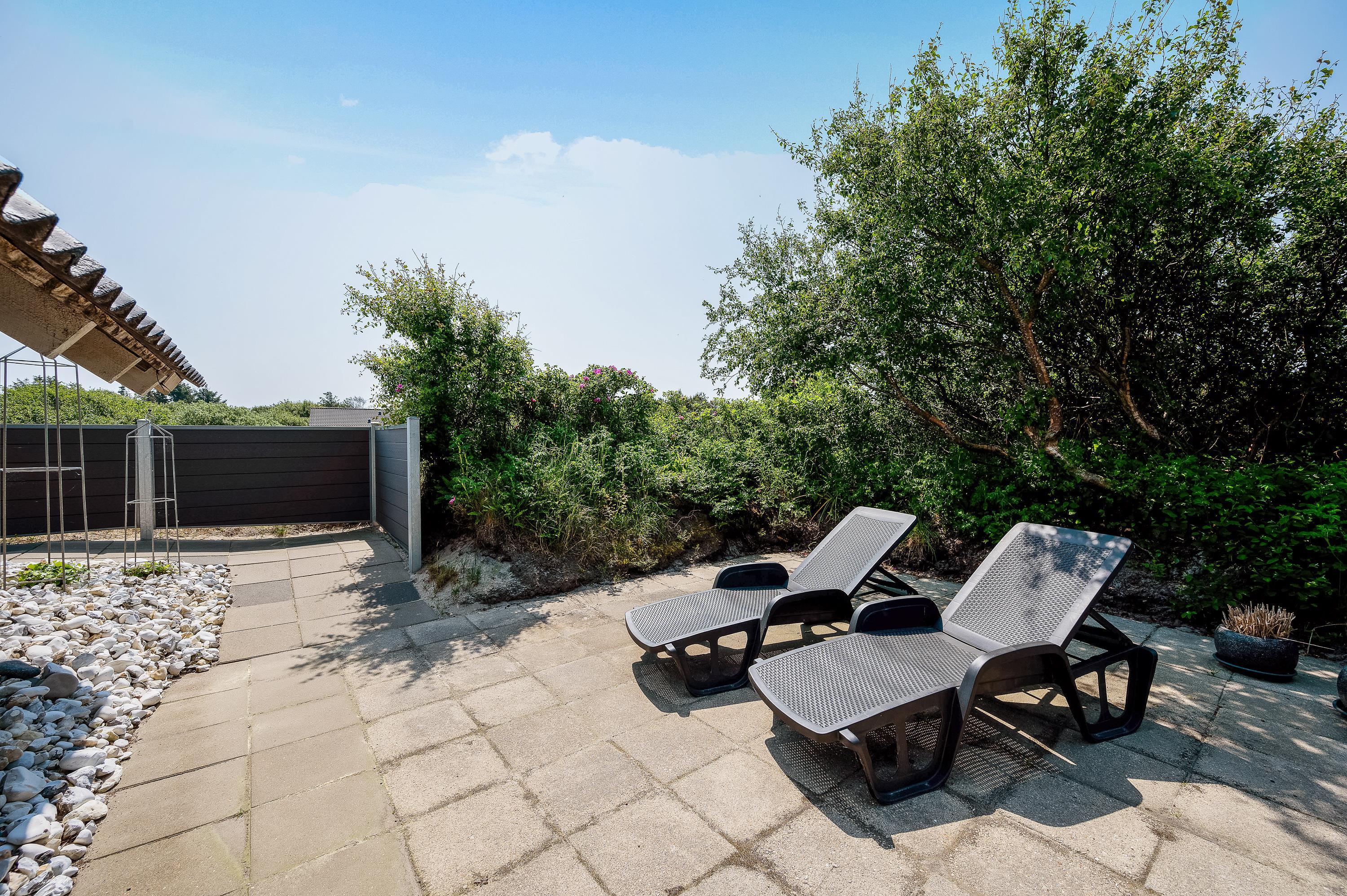 Gennem terrassedøren kommer I ud på den overdækkede og afskærmede terrasse mod syd. Ud over den sydvendte terrasse finder I rundt om sommerhuyset flere andre gode og afskærmede terrasser, så I næsten altid kan finde en plads i læ og følge solen rundt. Her lægges op til mange hyggelige grillaftener under åben himmel.