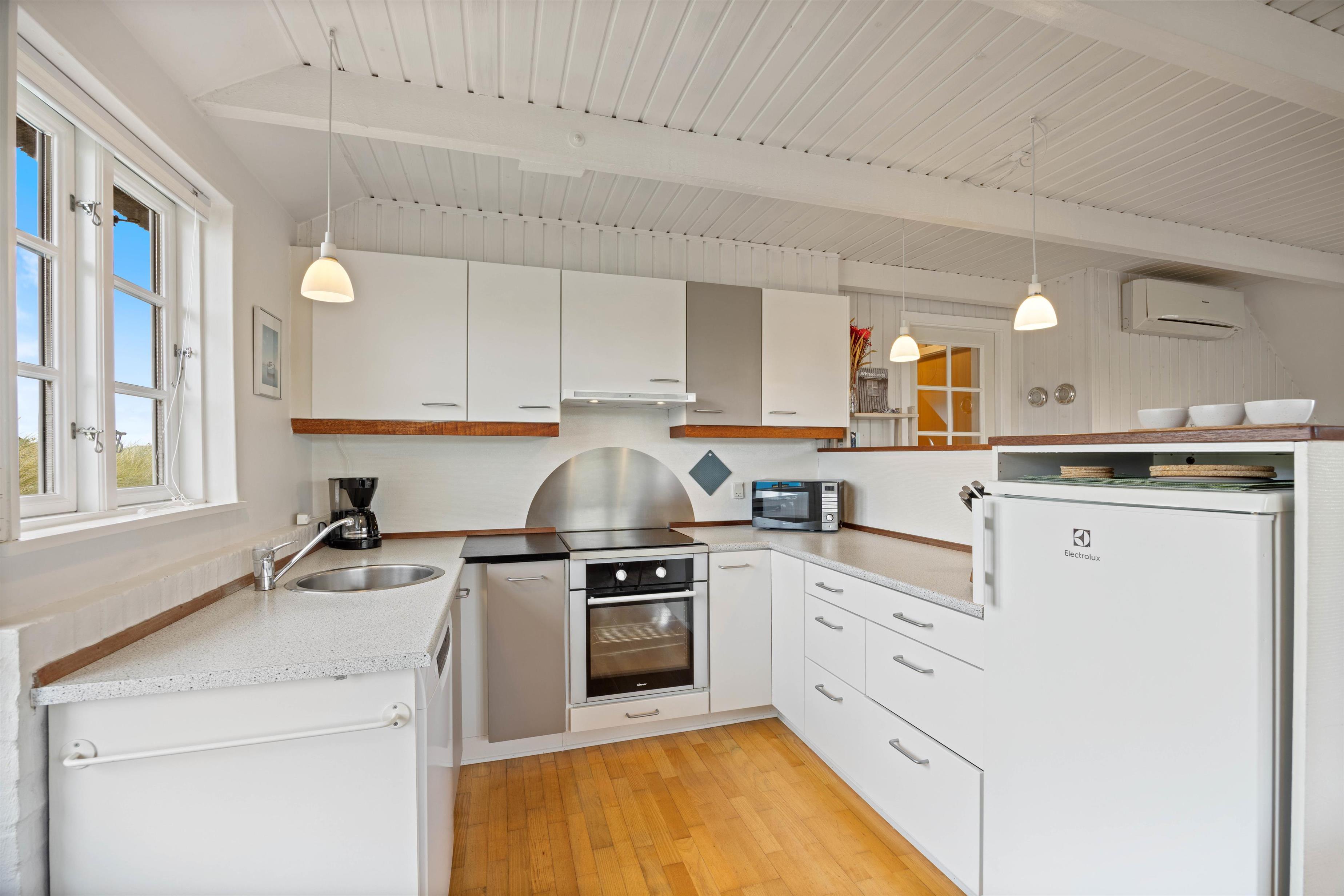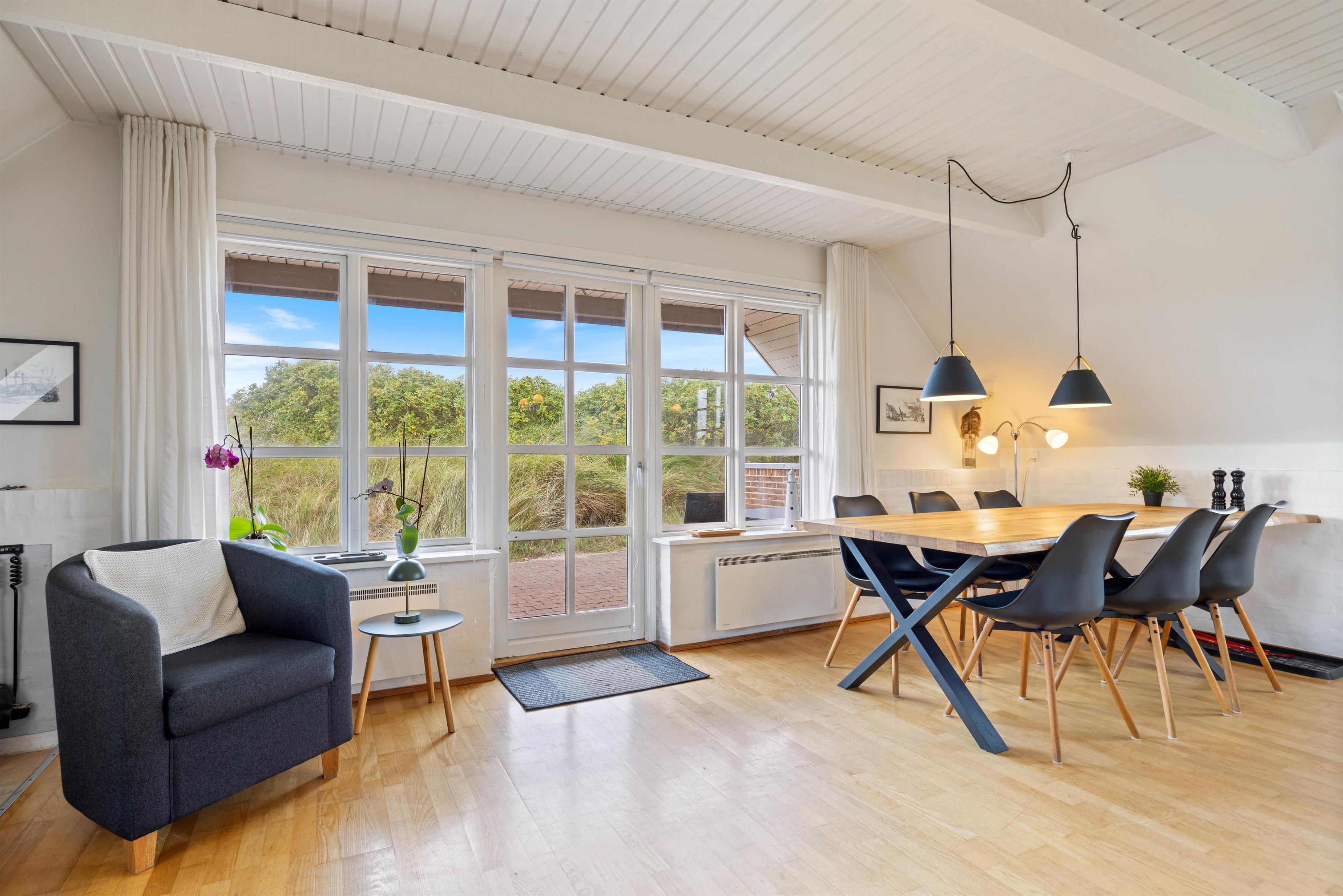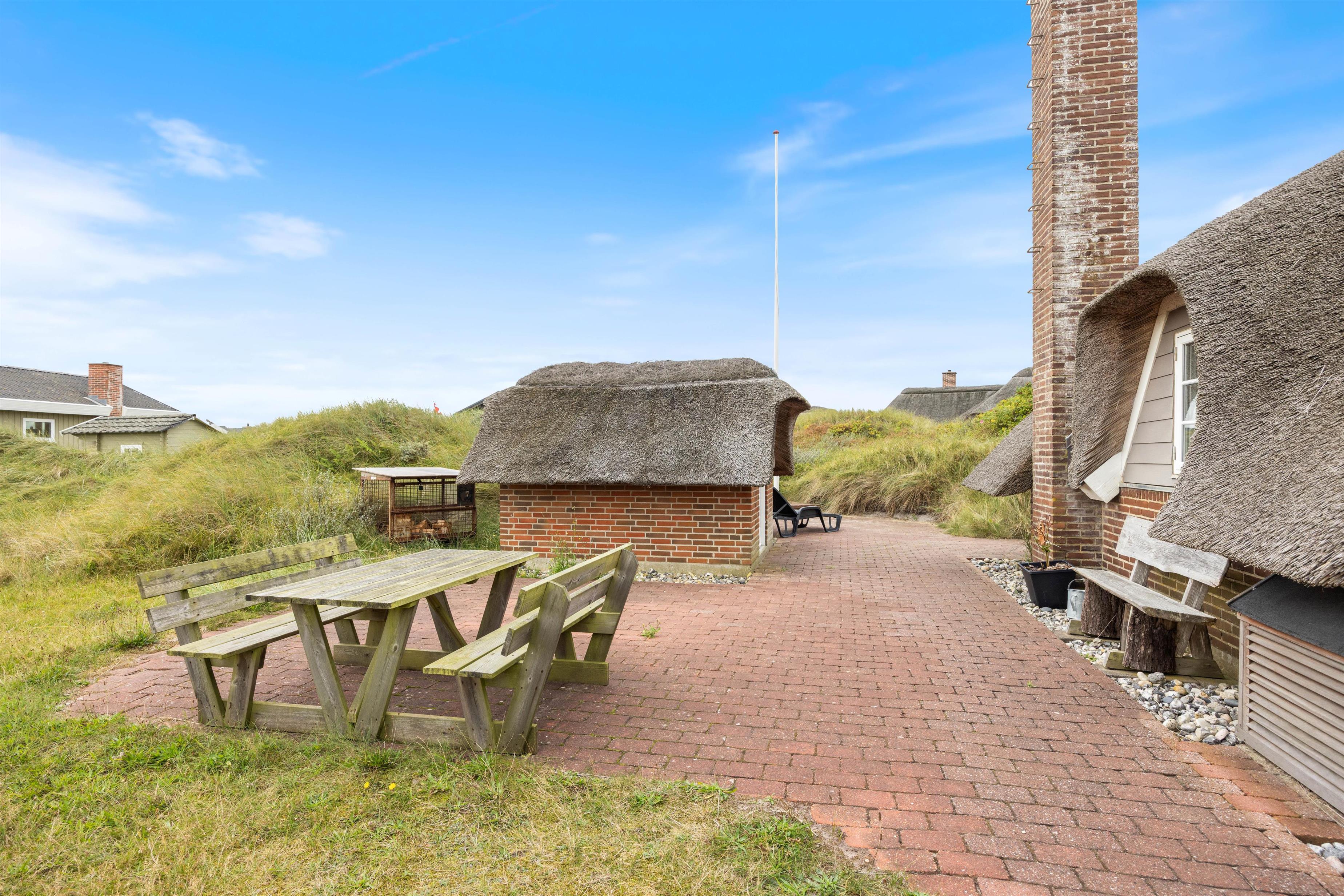 Det stråtækte feriehus med det vestjyske klitlandskab i baggrunden emmer af charme, og rammerne er sat for en idyllisk sommerhusferie i naturskønne omgivelser. I vil straks blive budt velkommen af den lyse og hyggelige indretning med fine, personlige detaljer, der skaber en ekstra indbydende ferieatmosfære. De lyse lofter og vægge skaber en dejlig atmosfære. Den gode atmosfære styrkes kun af husets brændeovn, der bidrager med varme og hygge til den gode atmosfære.