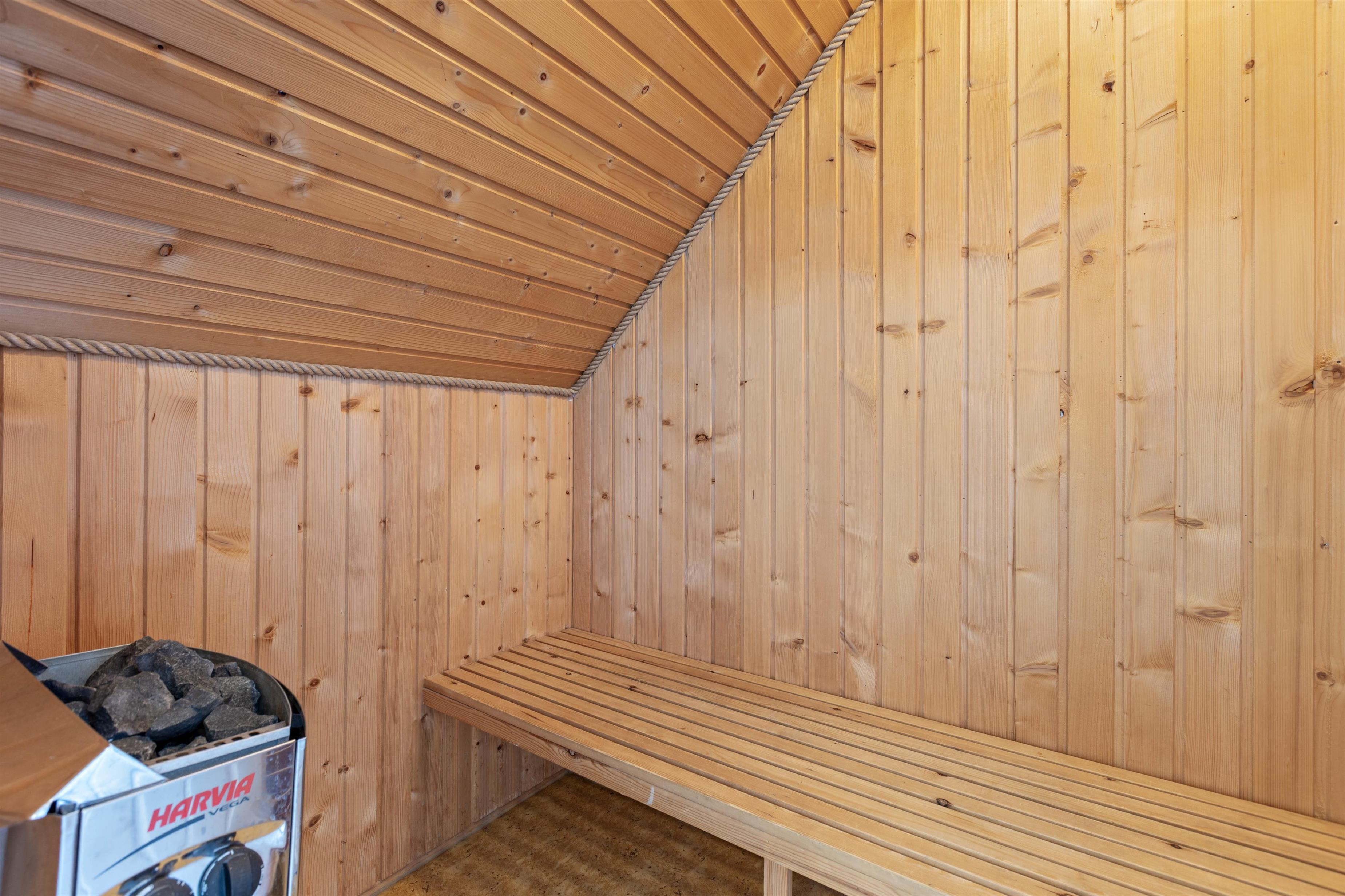 På badeværelset har I adgang til jeres helt egen sauna, hvor I kan forkæle jer selv lidt ekstra på ferien. Tank nye kræfter efter en oplevelsesrig feriedag, eller få varmen efter en gåtur i den friske, salte havluft.