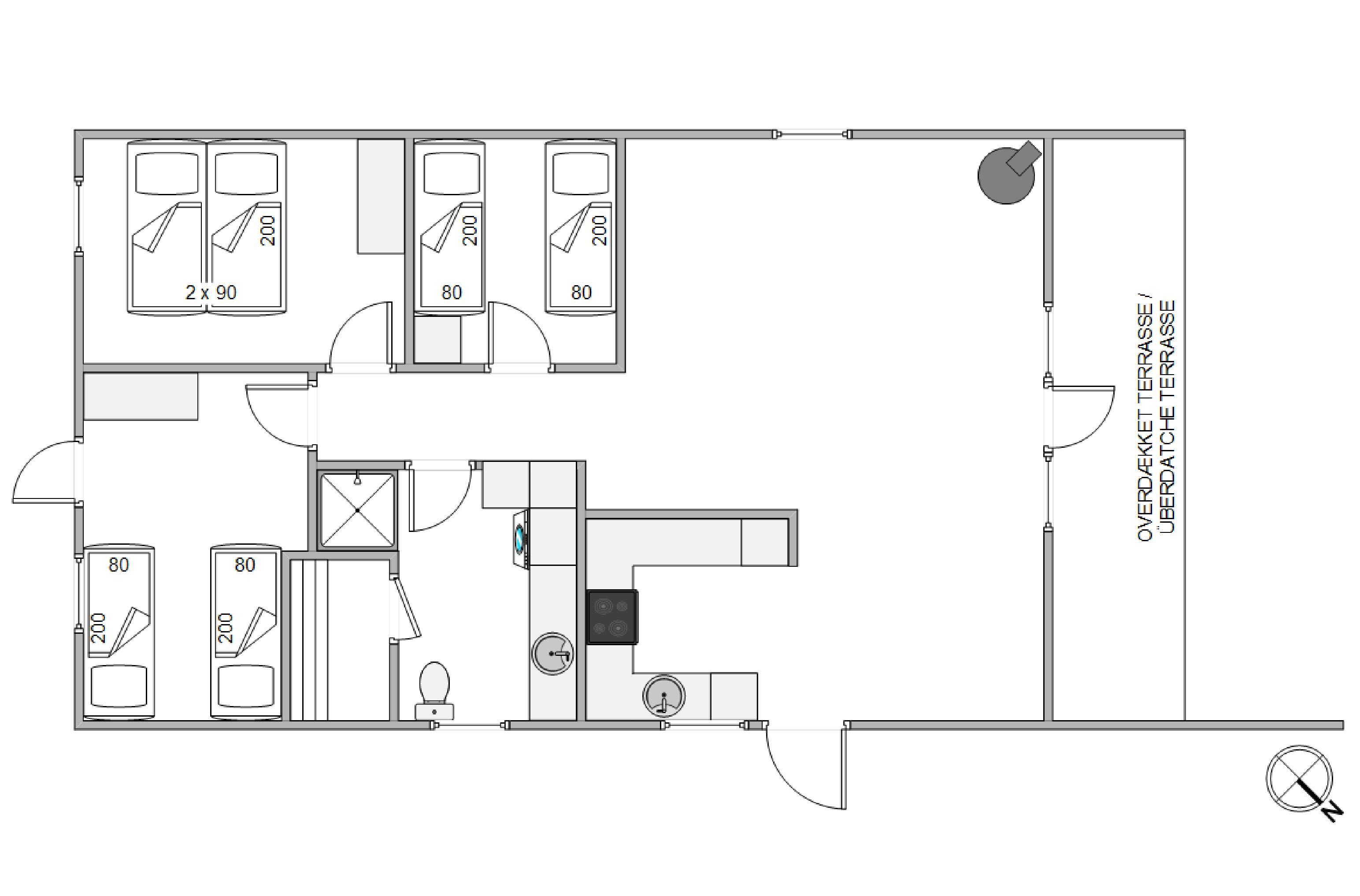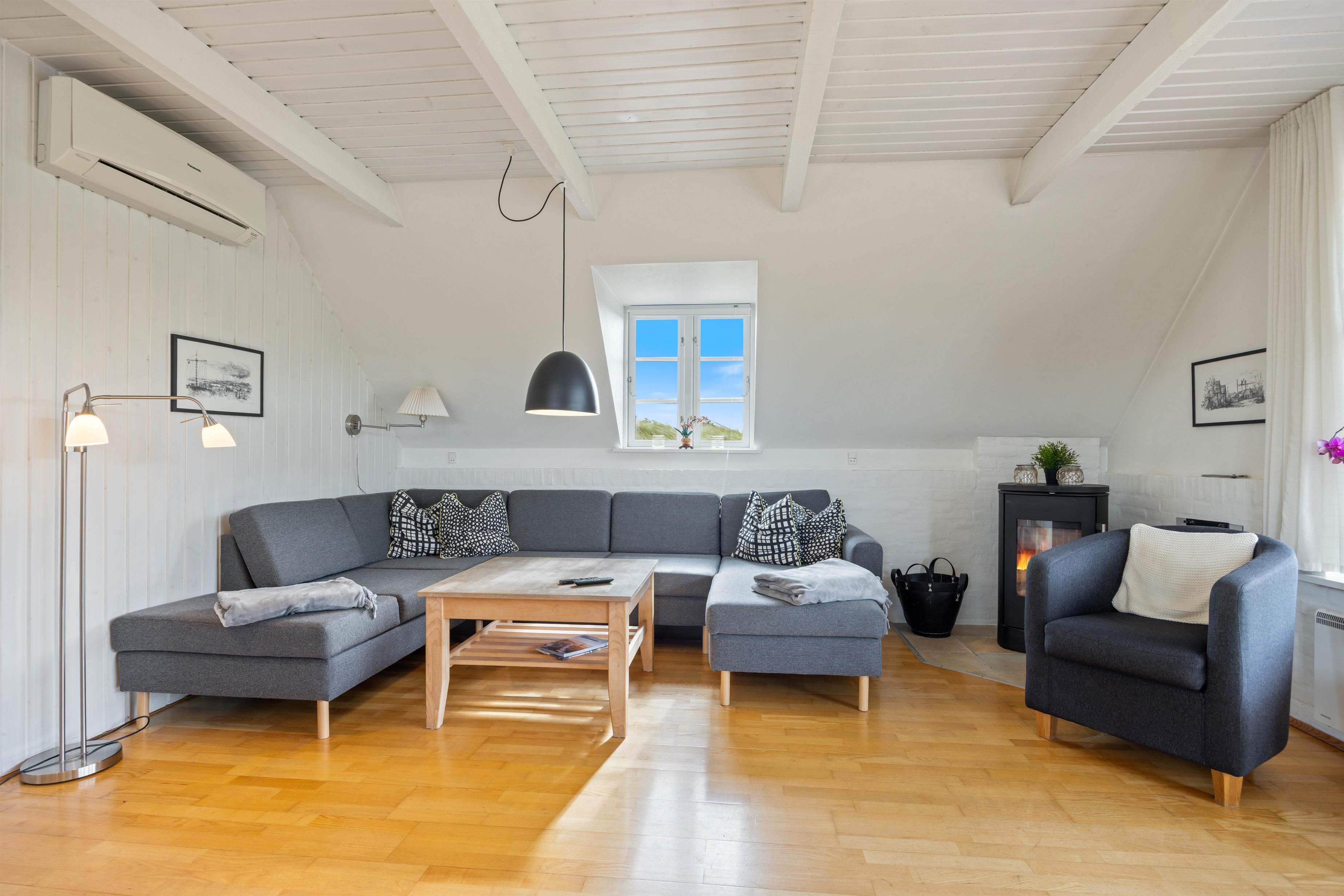 Huset rummer plads til seks personer fordelt på tre fine soveværelser. Køkkenet og stuen er åbnet op og slået sammen til ét stort opholdsrum, hvor hele familien kan samles om hyggen. I hjørnet står den klassiske brændeovn, som spreder varme og god stemning på sene aftener og kølige feriedage.