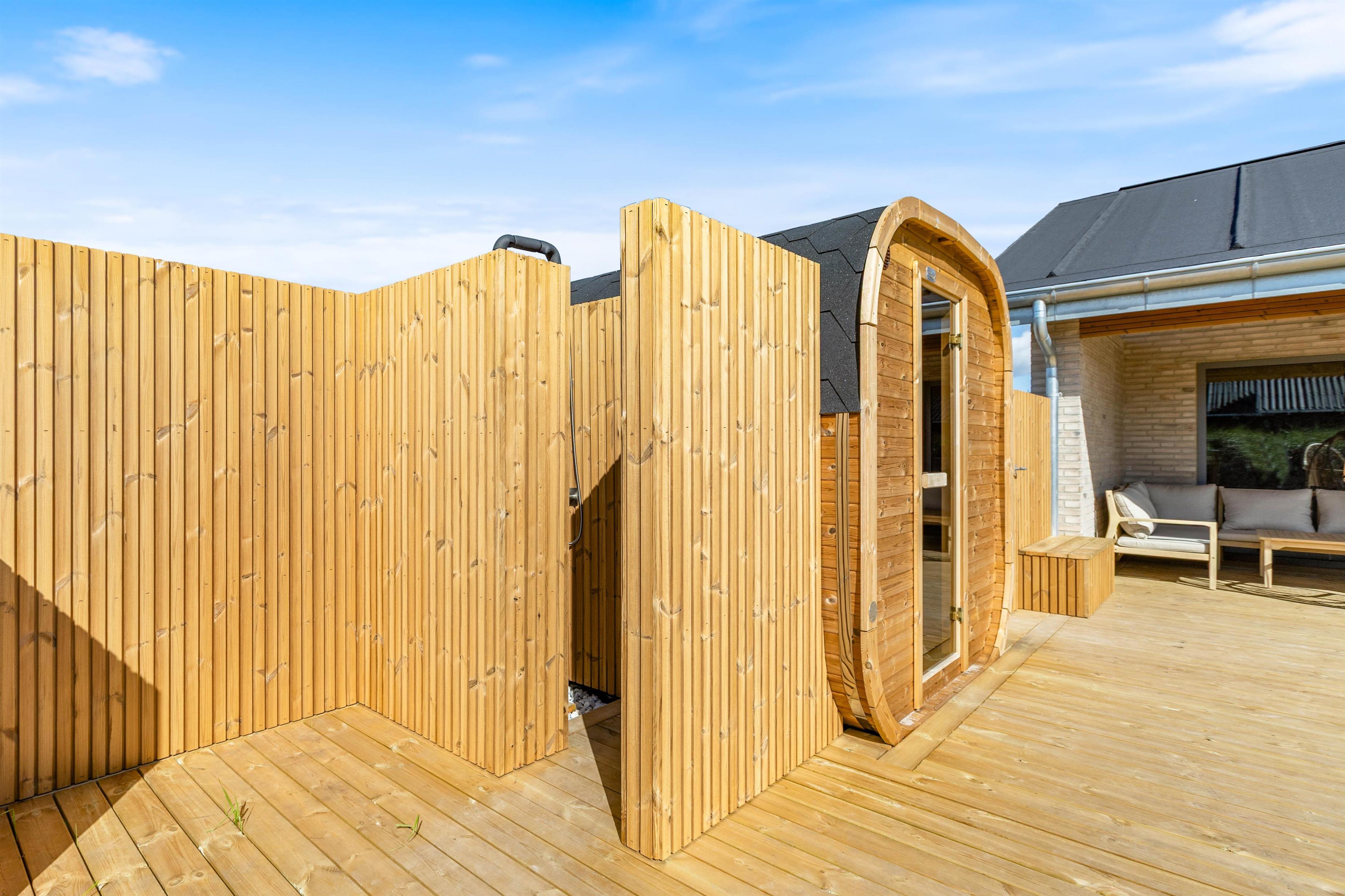 Når aftenen falder på, kan det varmt anbefales at hoppe i udespaen og lade det varme, dejlige vand give fuld afslapning. På terrassen finder I også en skøn udesauna, der kan varme jer godt igennem og give en forfriskende oplevelse.
