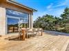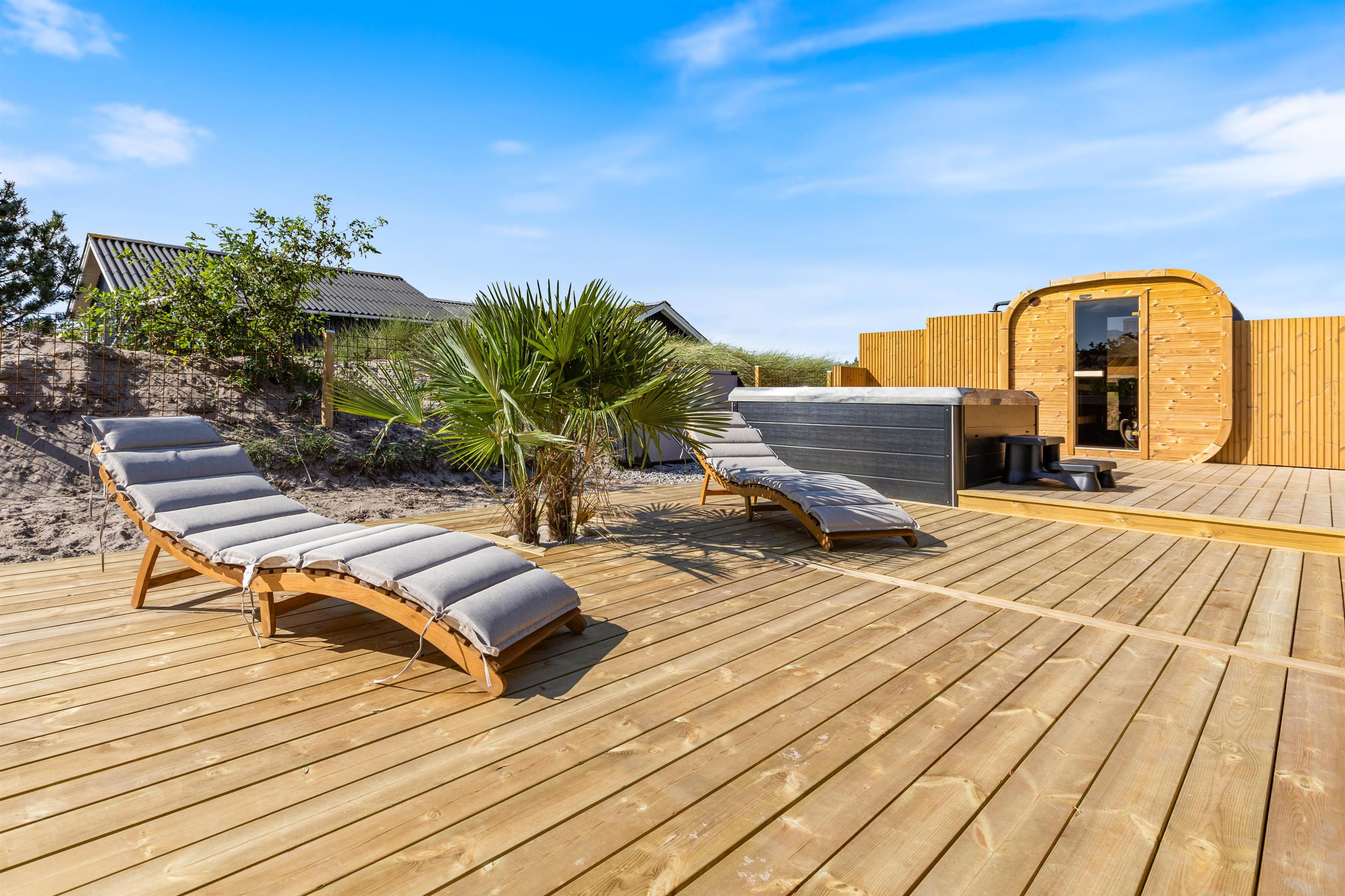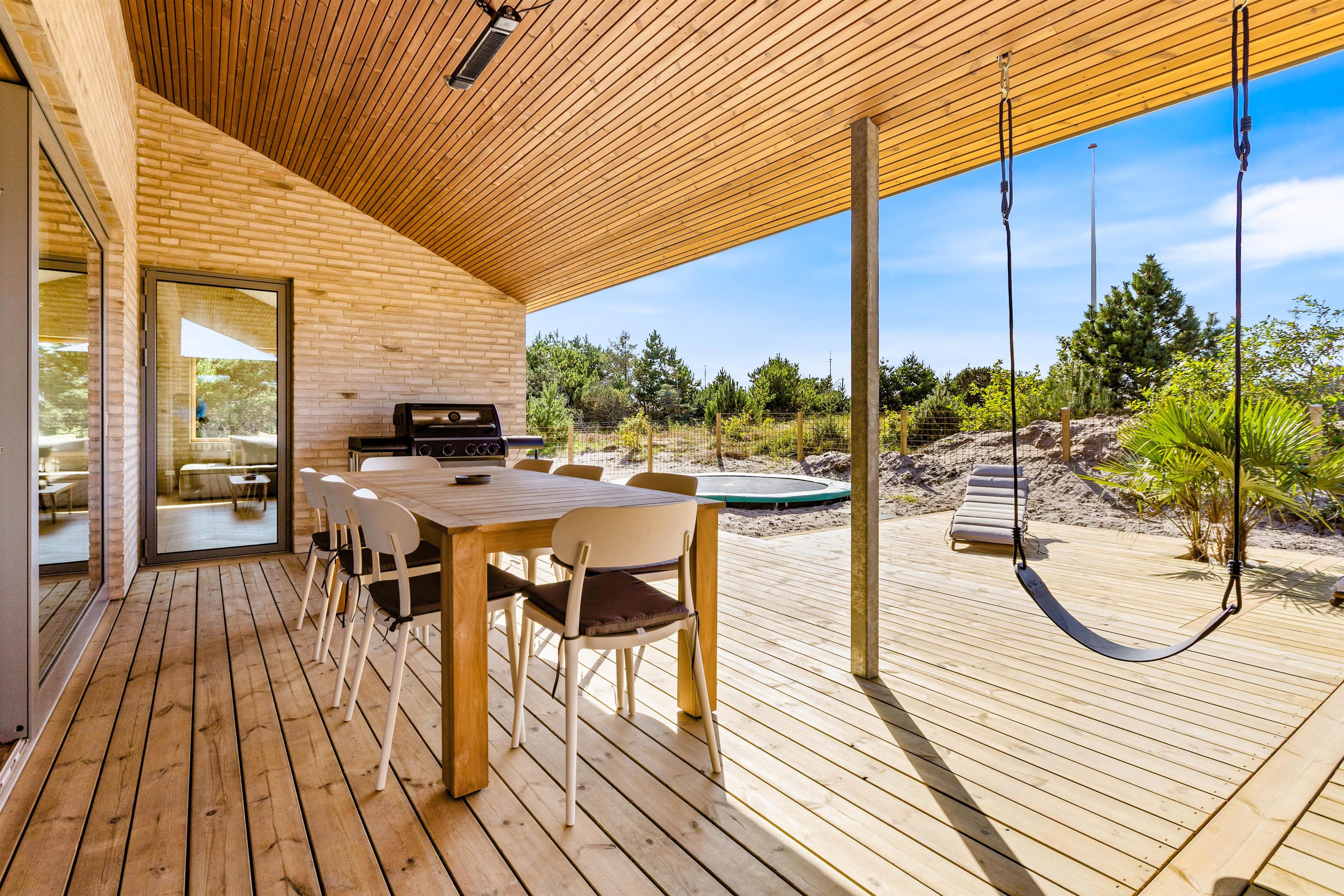Rundt om feriehuset finder I en dejlig stor terrasse, der består af en lukket, en åben og en afskærmet del, så I kan vælge plads efter sol, skygge eller læ for vinden. Terrassen er møbleret med komfortable havemøbler og solsenge og indbyder til lange, afslappende timer udendørs på varme sommerdage.