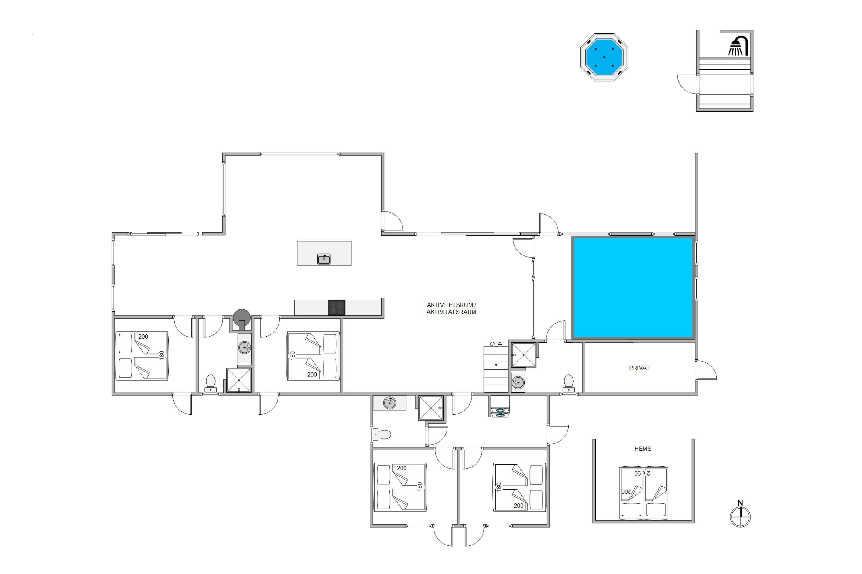 Sommerhuset byder på 4 rummelige soveværelser, alle indrettet med komfortable dobbeltsenge, så både afslapning og nattesøvn er i top. Hvert værelse har direkte adgang til terrassen gennem store terrassedøre, hvilket giver mulighed for at nyde den friske luft, morgensolen eller blot lade dagslyset strømme ind. Hertil kommer 3 moderne badeværelser, så alle nemt kan komme til om morgenen uden lange køer.