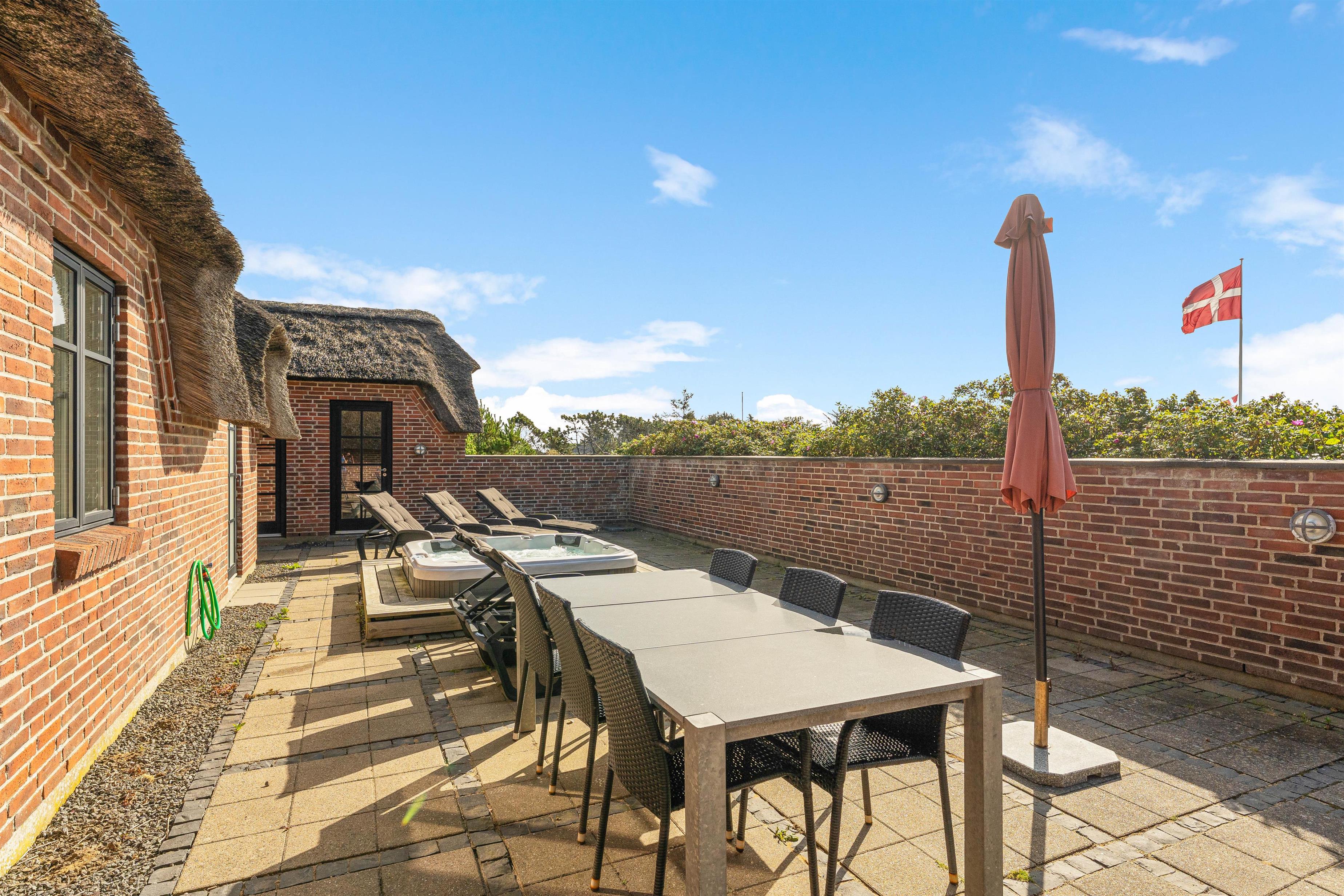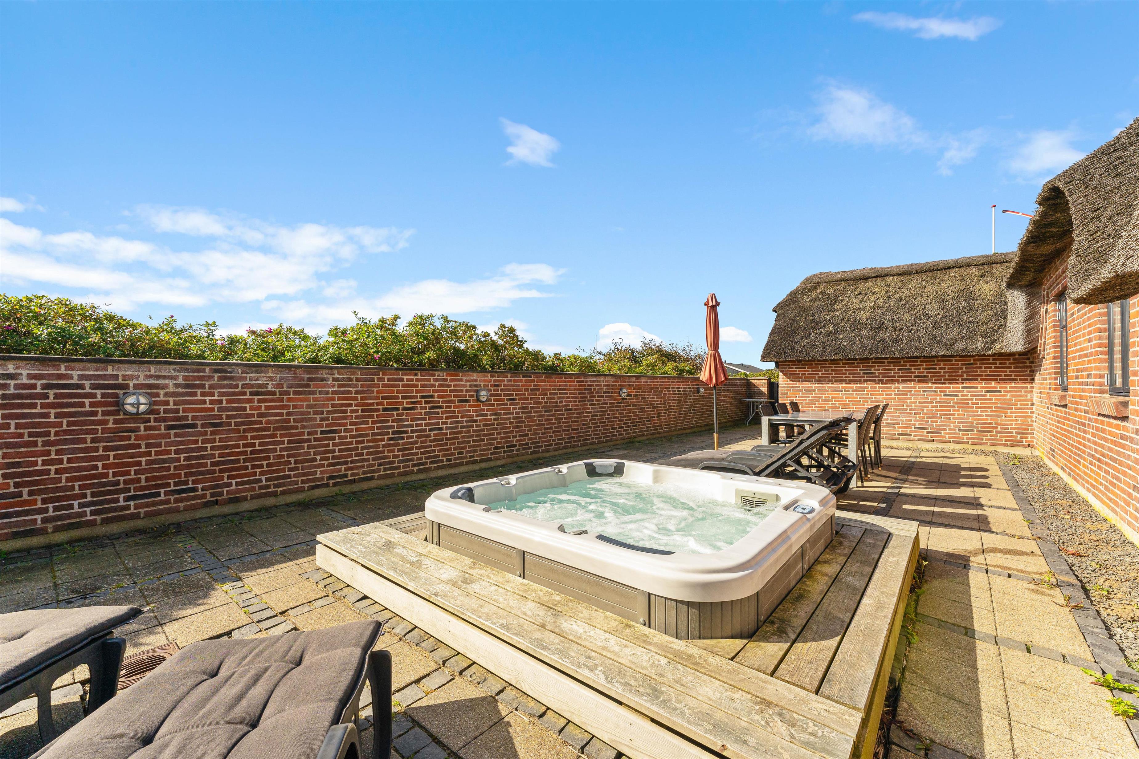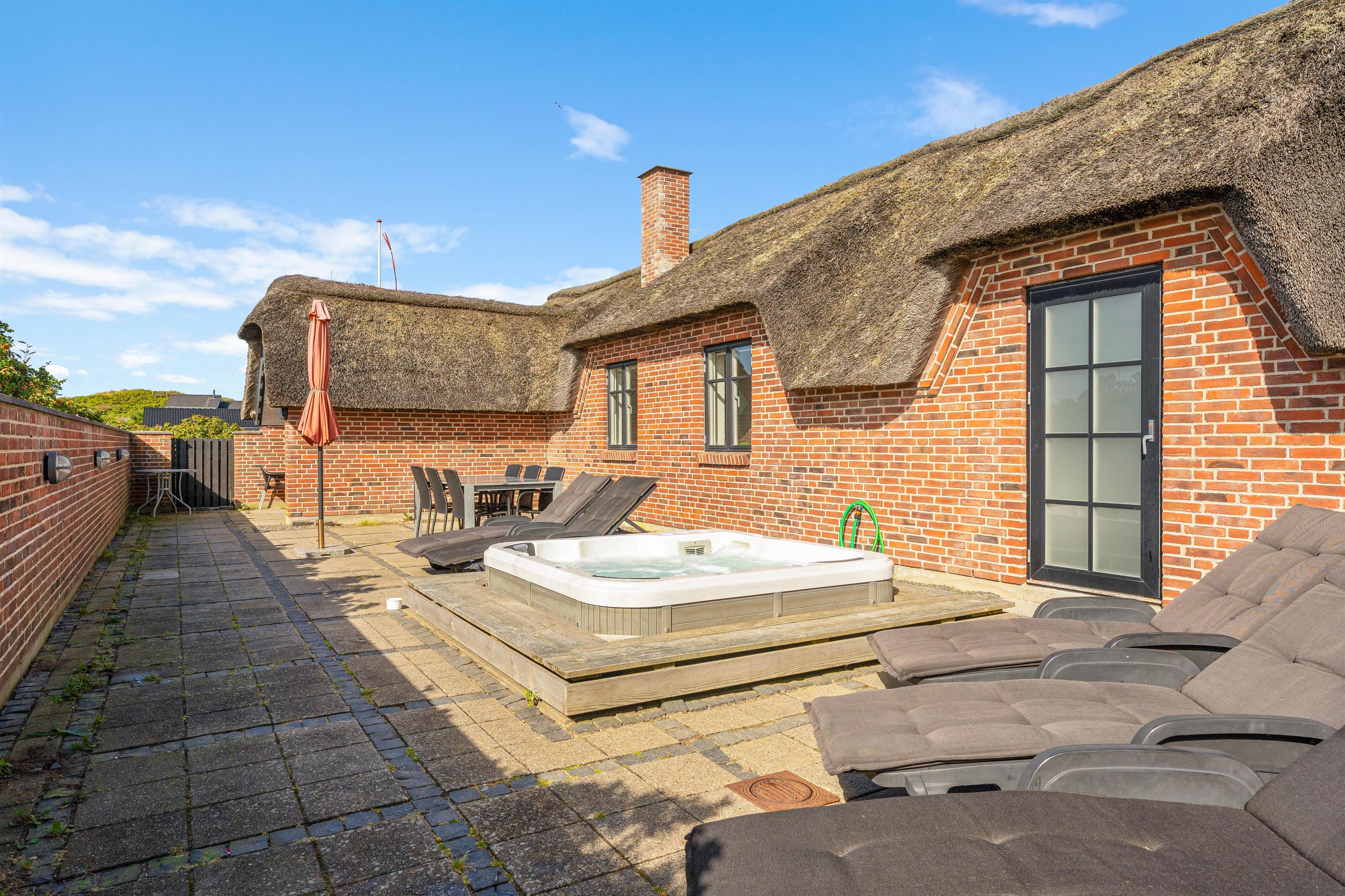 Den lukkede terrasse mod syd er ideelt til al udeaktivitet, og her kan man roligt lade børn og hund lege. Her er sol og ofte læ – og en tur i udespaen er altid et hit. Herfra kan man nyde solnedgangen en dejlig sommeraften, og i den mørke tid kan man sidde i det lune vand og se den flotte stjernehimmel.