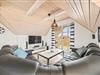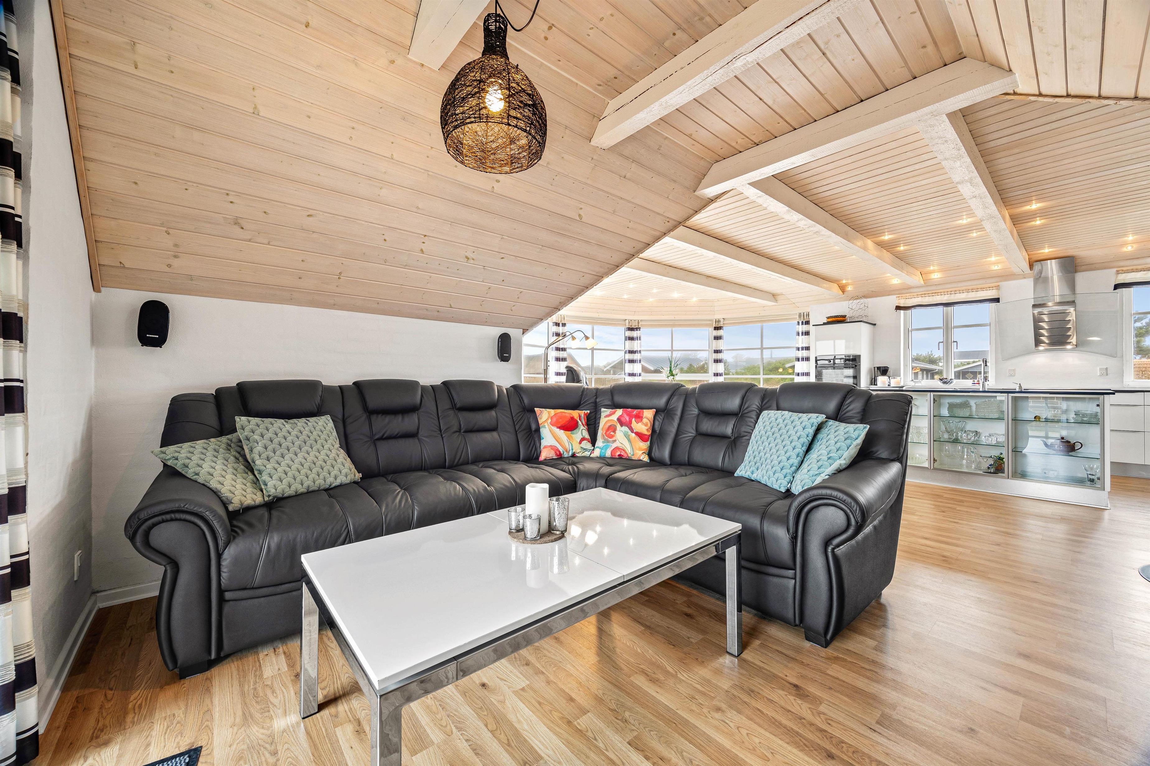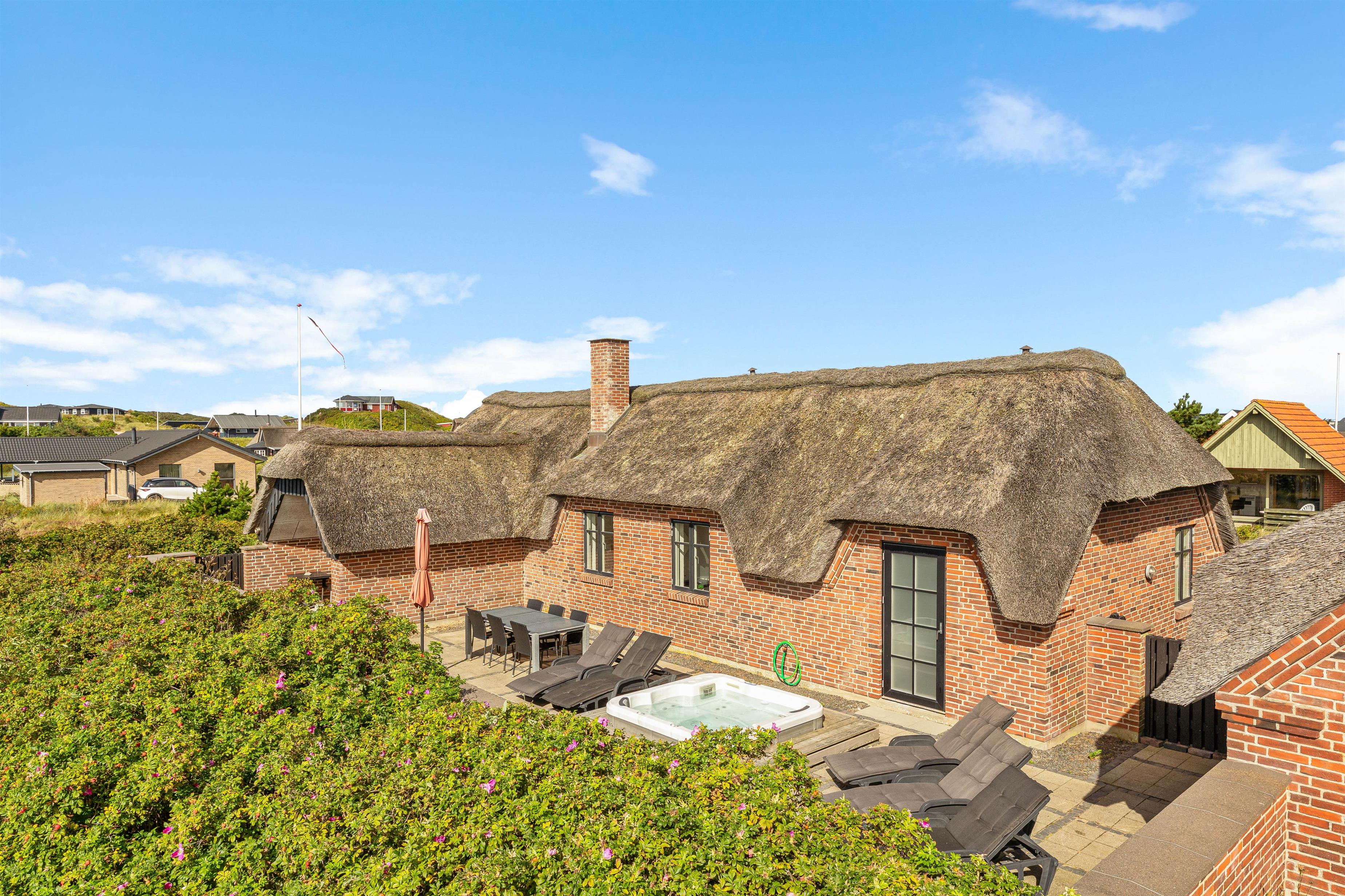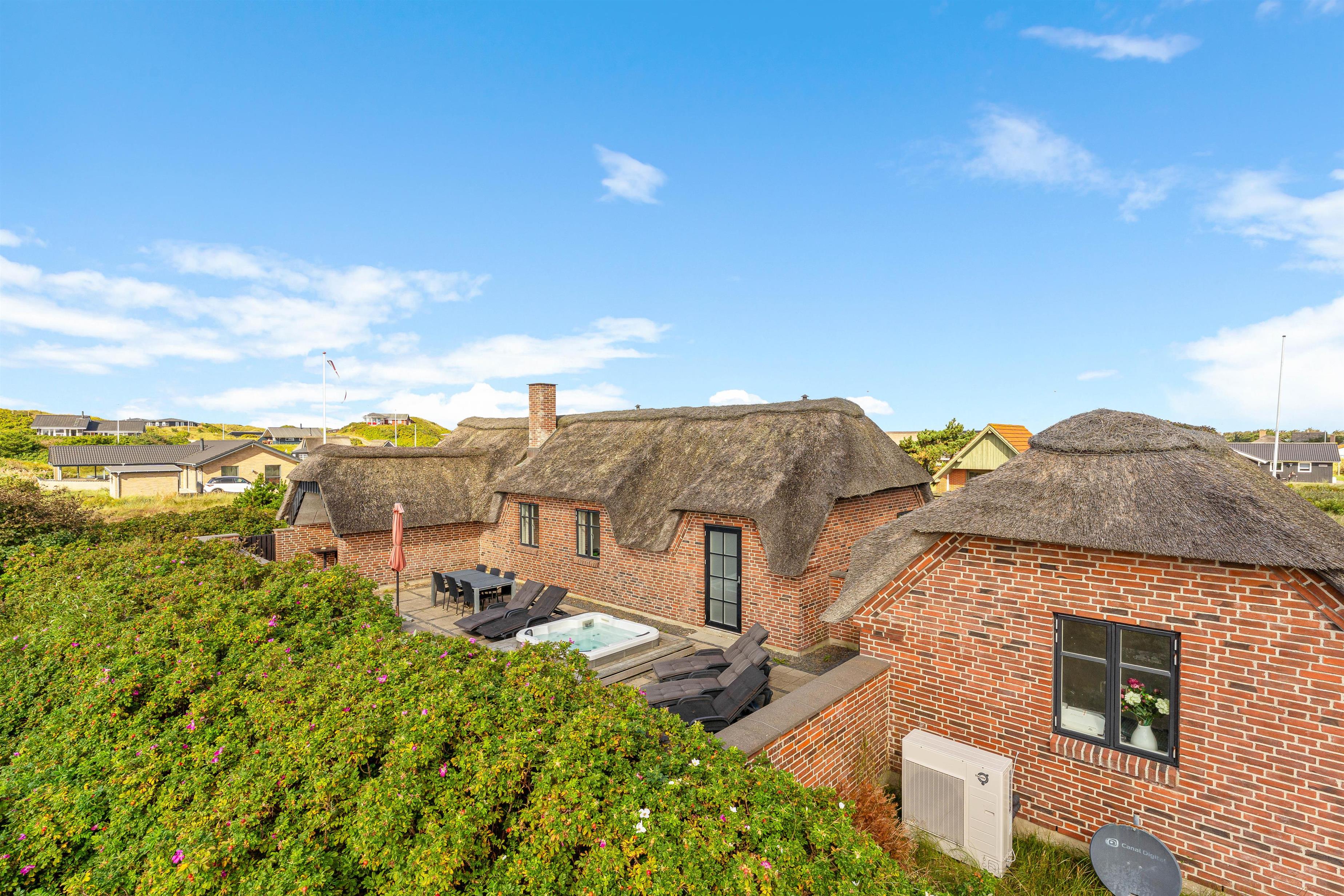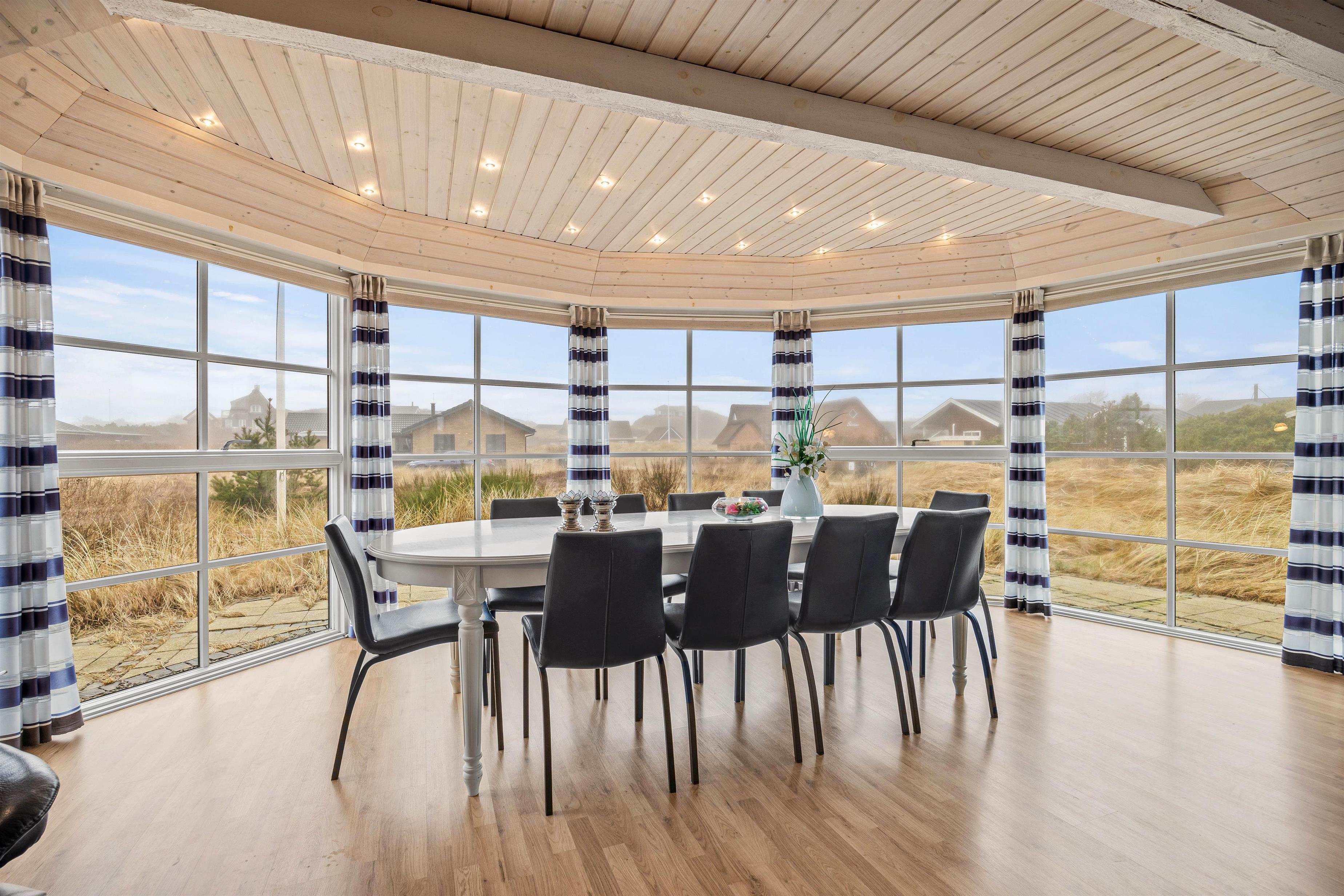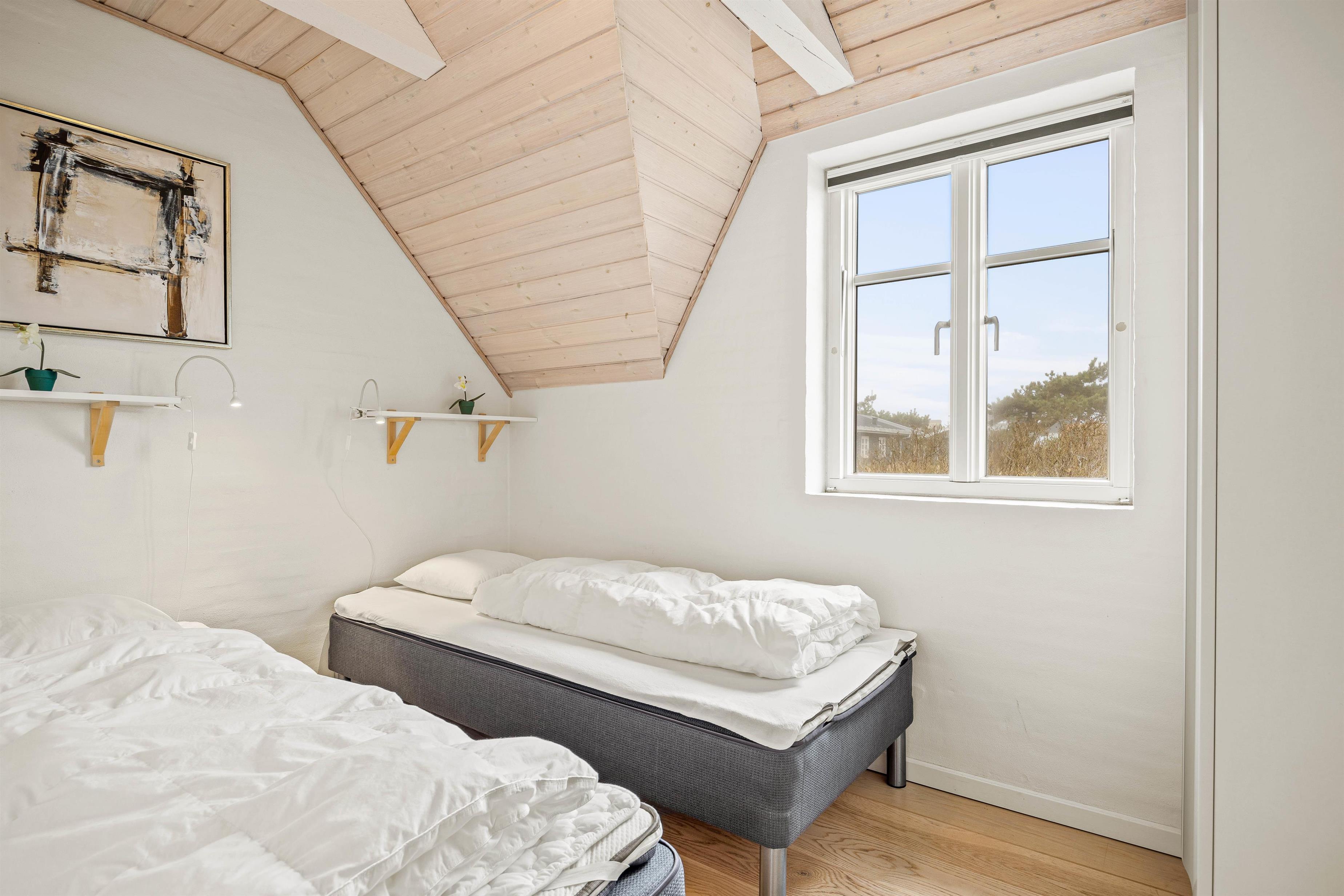 Sommerhuset er smagfuldt og lækkert indrettet i lys og skandinavisk stil. En karnap mod vest med et stort vinduesparti gør, at man føler, at man nærmest ”sidder midt ude i naturen”, når man sidder ved spisebordet. Det giver samtidigt et fantastisk lys ind i huset. Herfra kan man også se aftensolen og solnedgangen over klitterne.