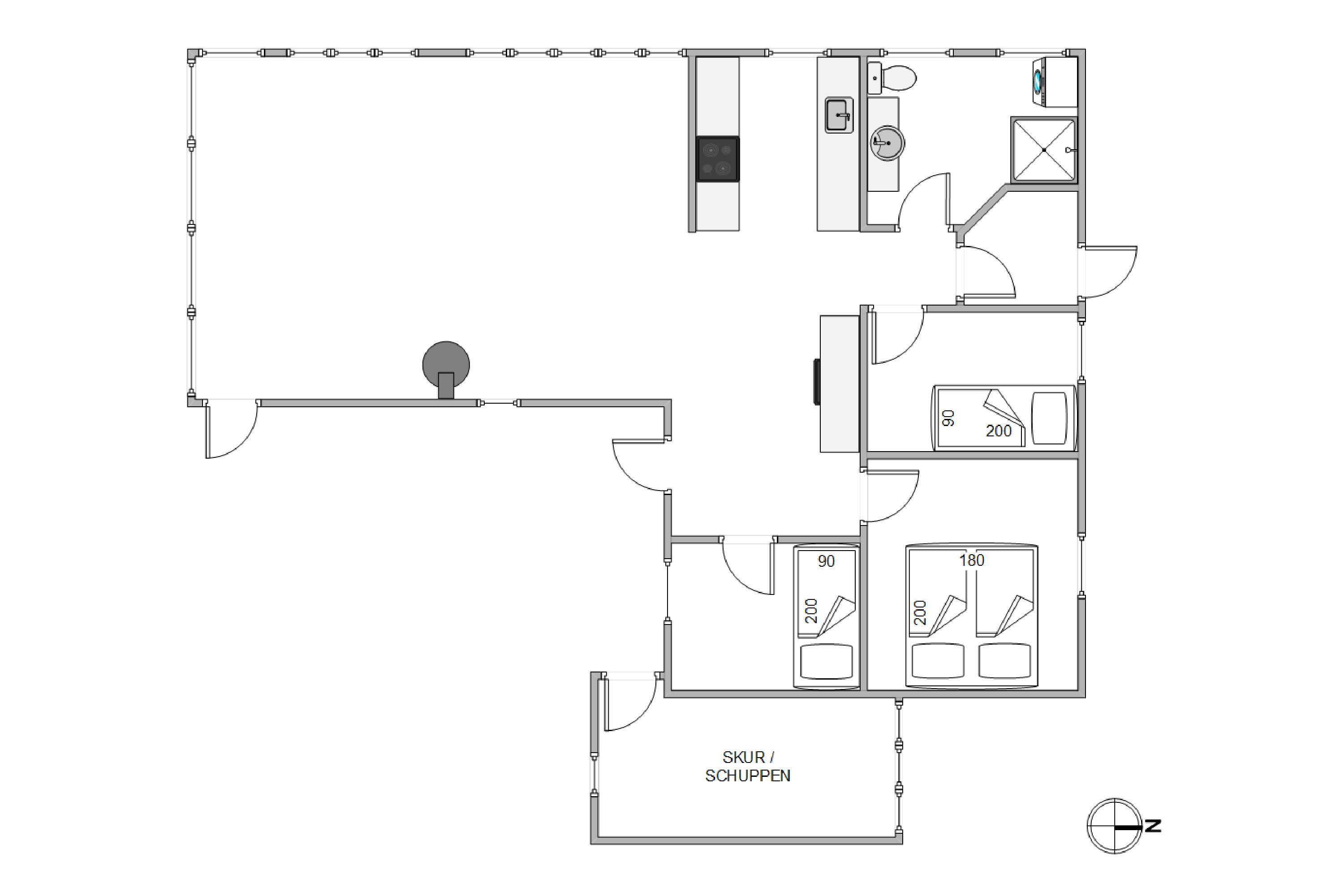 De 3 soveværelser er praktisk indrettet med 1 dobbeltseng samt 2 enkeltsenge, hvilket gør huset oplagt til både familier og vennepar. Fra stuen inviterer de store panoramavinduer naturen helt ind i rummet og skaber et fantastisk lysindfald dagen igennem. På de kølige aftener kan I samles foran brændeovnen, der spreder varme og ægte feriehygge.