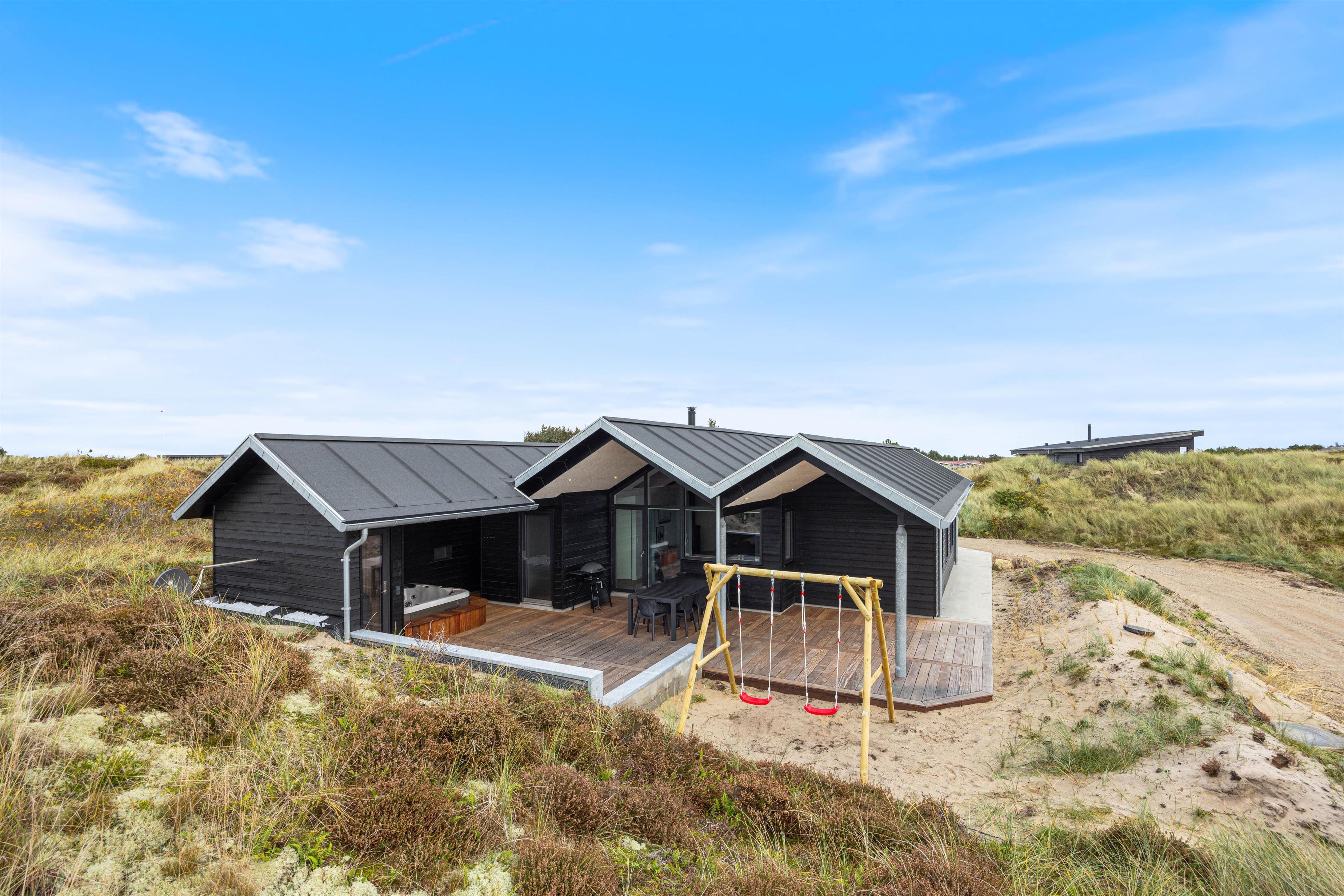 Feriehuset på Nordsøvej 279 i Søndervig ligger på en ca. 1500 m2 stor natur- og klitgrund. Feriehusets terrasseområde er delvist åbent, afskærmet og overdækket, så alle kan finde deres yndlingsplads i al slags vejr. Mens I hygger jer på terrassen, kan børnene gå på opdagelse på grunden eller boltre sig på gyngen. Der er også en sandkasse til rådighed for dine børn. Udendørssaunaen og det udendørs boblebad på terrassen giver også anledning til en ekstra dosis afslapning.