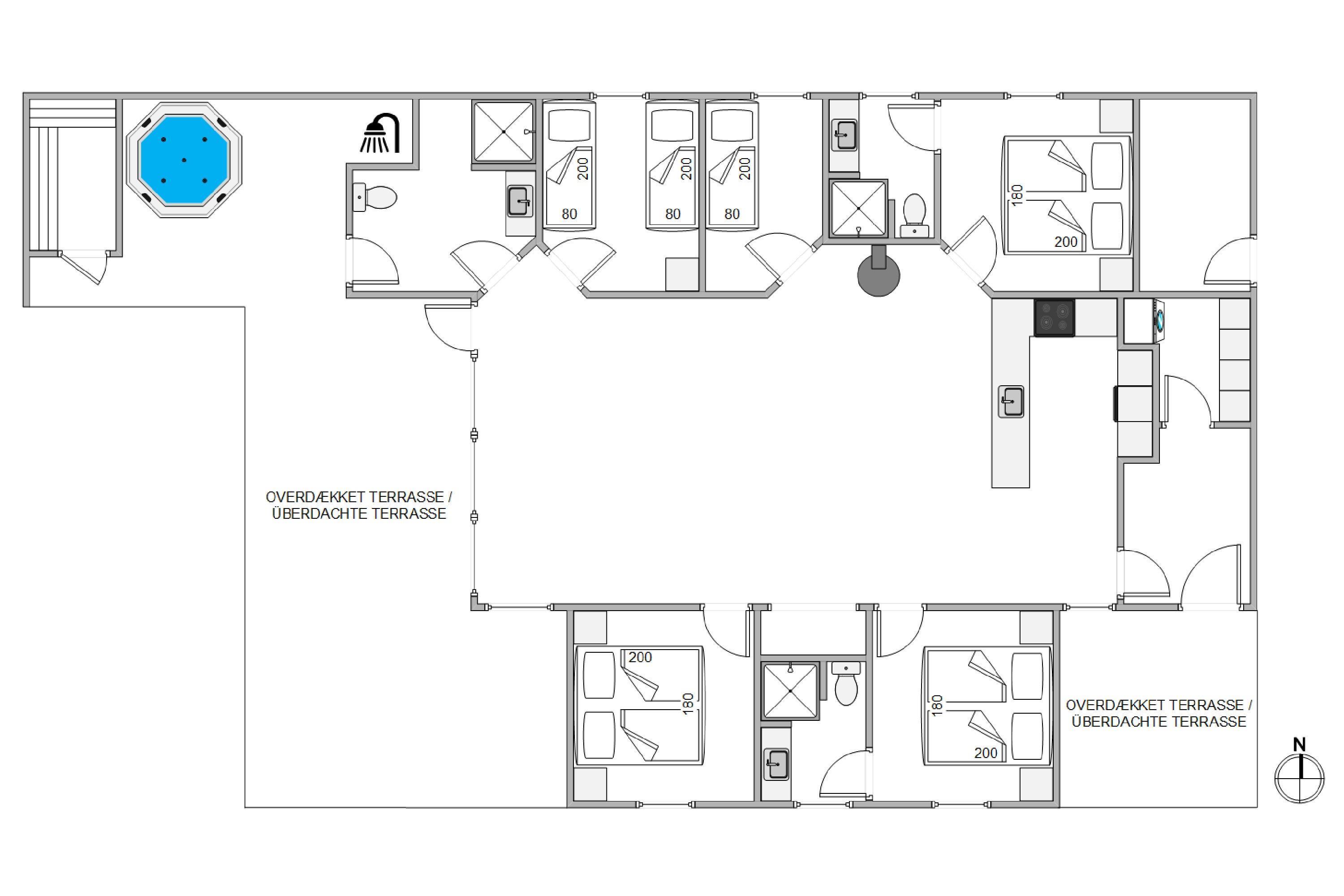For at I ikke skal bekymre jer om de huslige pligter, er der installeret en vaskemaskine med kombineret tørretumbler, samt der også er en opvaskemaskine i feriehuset. Desuden er der installeret gulvvarme i hele feriehuset, som drives af en energibesparende luft-til-vand-varmepumpe. Feriehusets tre badeværelser gør det særligt velegnet til en ferie med venner, eller hvis man rejser med flere familier.
