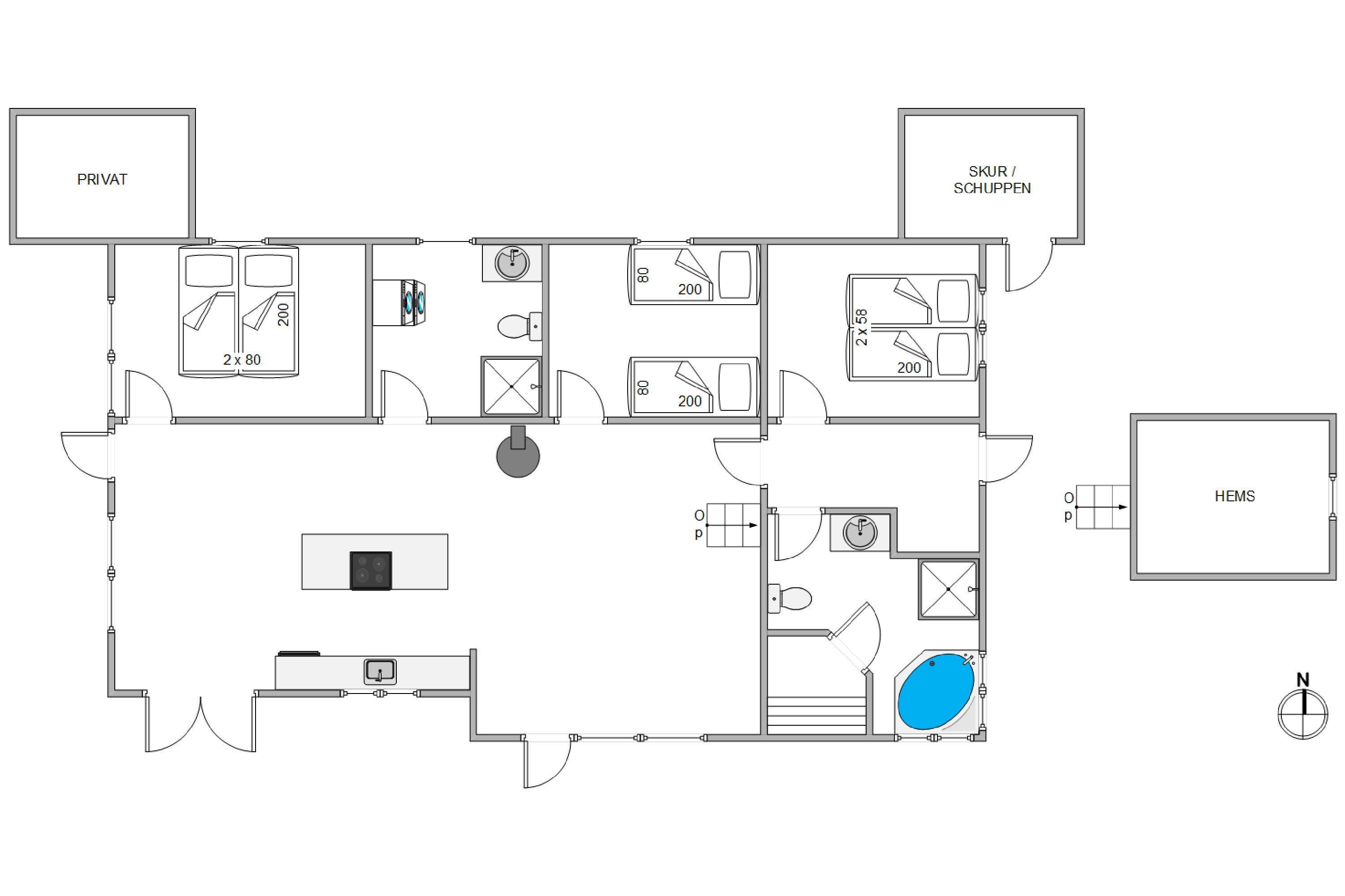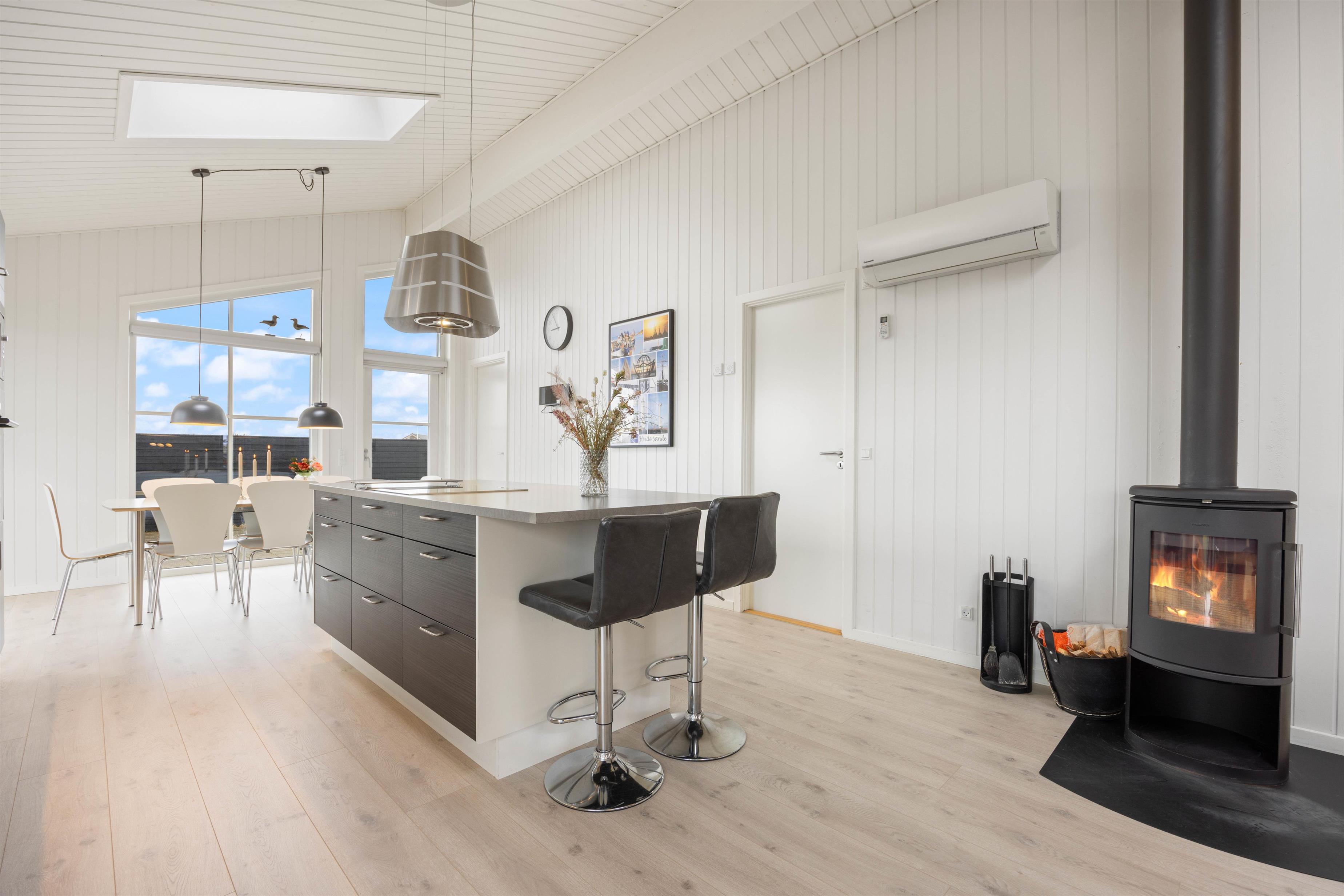 Der er to lækre badeværelser i huset, begge har gulvvarme og en bruseniche. På det mindre badeværelse er der en vaskemaskine og en tørretumbler. På det store badeværelse er der en to personers hjørnespa og en sauna. Køkkenet er placeret mod vest, mellem spiseafdelingen og selve stuen. Her er der en fryser på 225 L, en mikroovn og en opvaskemaskine. Stuen er møbleret med praktiske lædermøbler, et stort fladskærms-TV, en DVD, radio m/CD-afspiller, en brændeovn, gratis trådløst internet og en energibesparende varmepumpe. Det er tilladt at medbringe en enkelt hund i dette sommerhus.