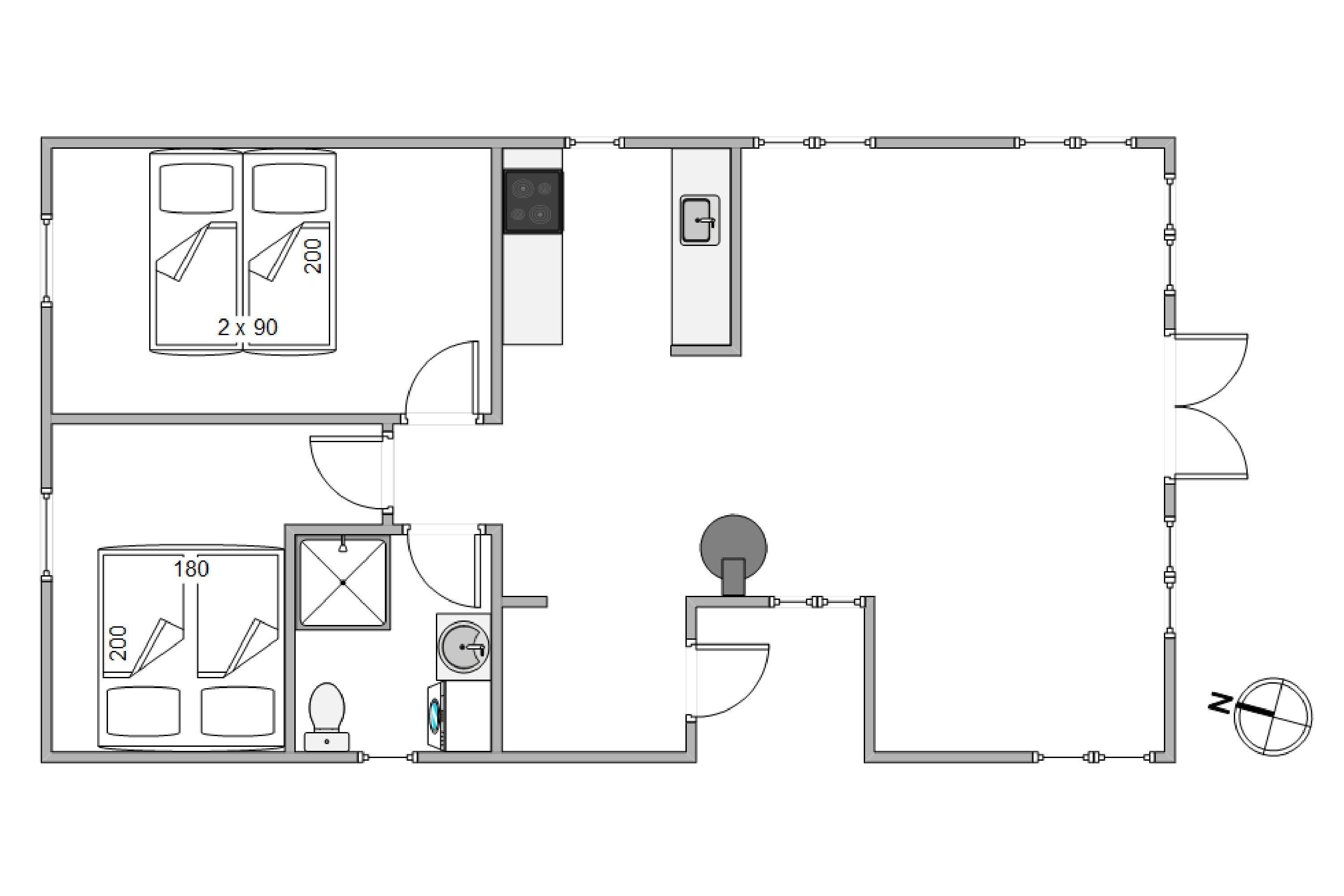 Husets 4 sovepladser er fordelt over to værelser med hver en dobbeltseng. Hjertet af huset er det åbne samtalekøkken, som gør, at I kan snakke sammen mens der trylles i køkkenet. Brændeovnens centrale placering skaber ægte hygge i sommerhuset. Sommerhusets areal på 70 m2 skaber en intim og indbydende ramme, hvor I nemt kan finde jer til rette. Her kan I for alvor nyde noget nærvær og afslapning med jeres medrejsende.