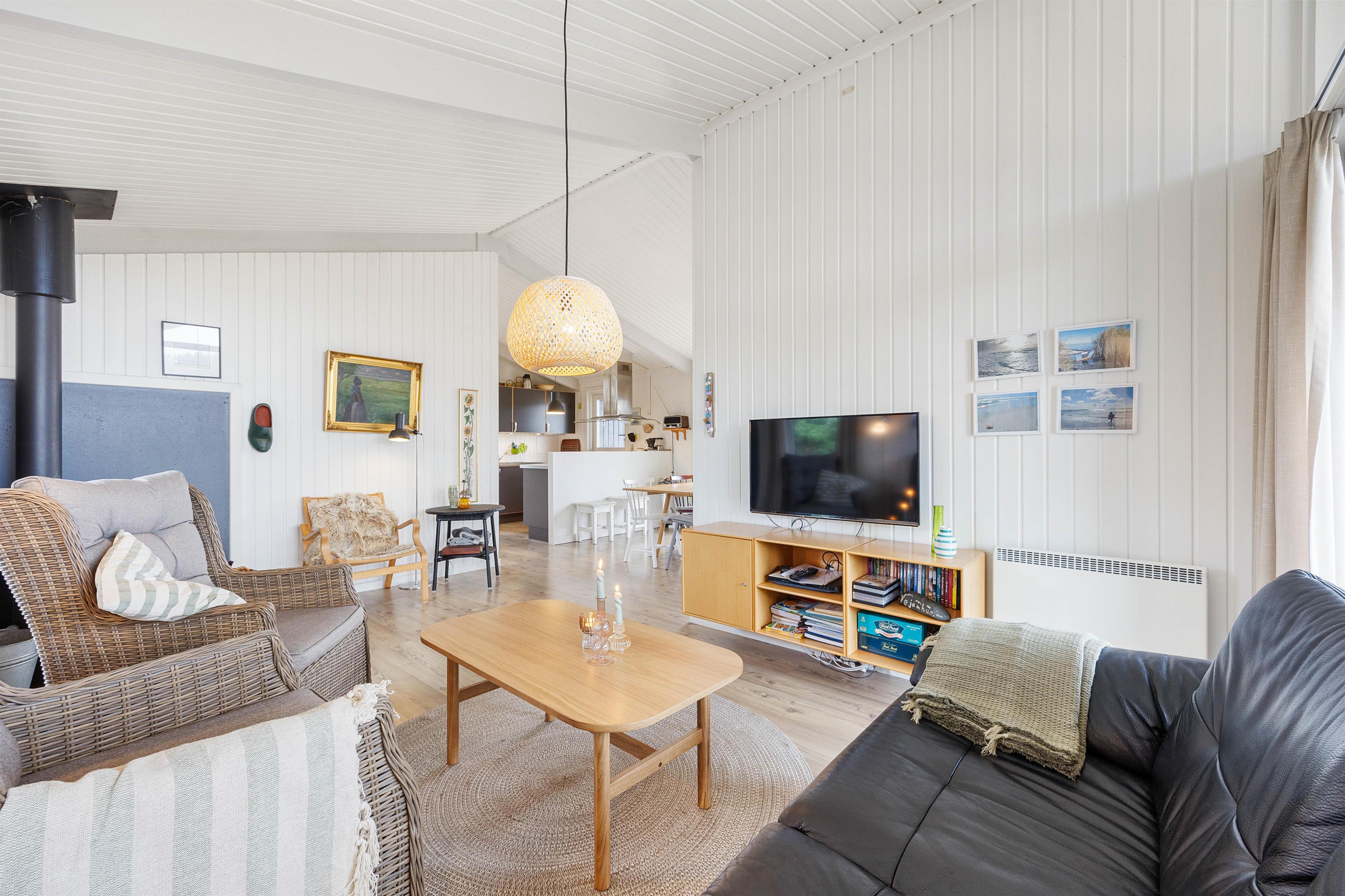 Den røde tråd går igen igennem hele huset. Hele sommerhuset er med loft til kip, hvilket giver en dejlig rumfornemmelse og samtidig giver de hvide trælofter et dejligt lyst indtryk, der er med til at I kommer i den helt rigtige feriestemning.