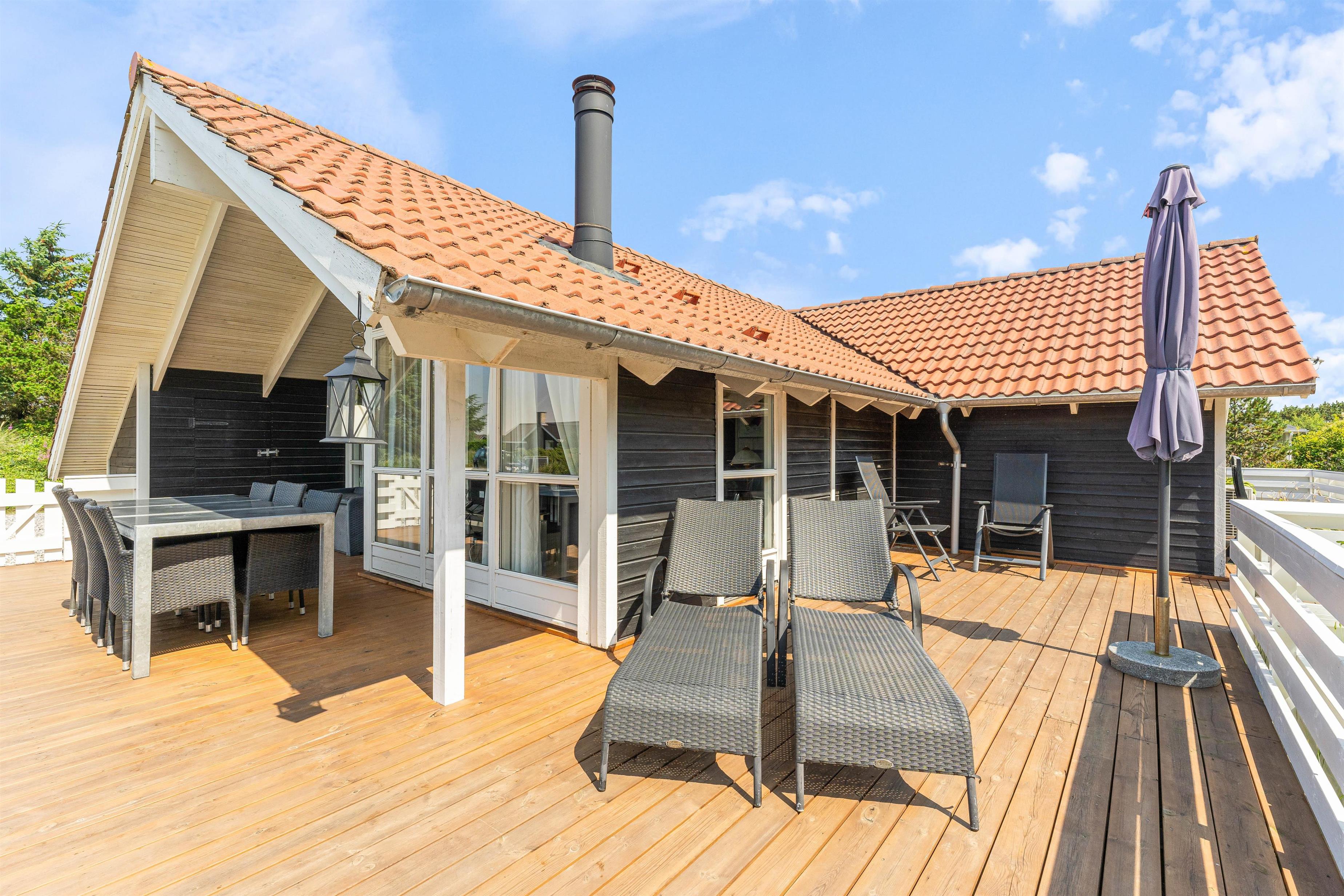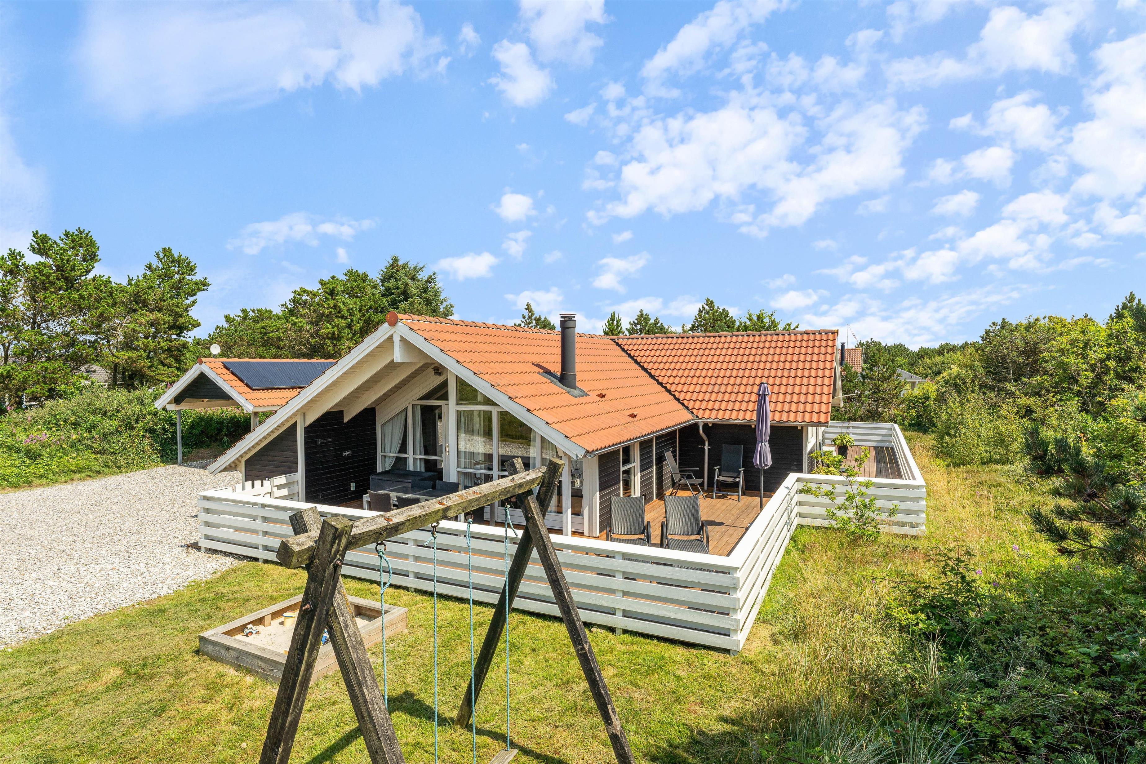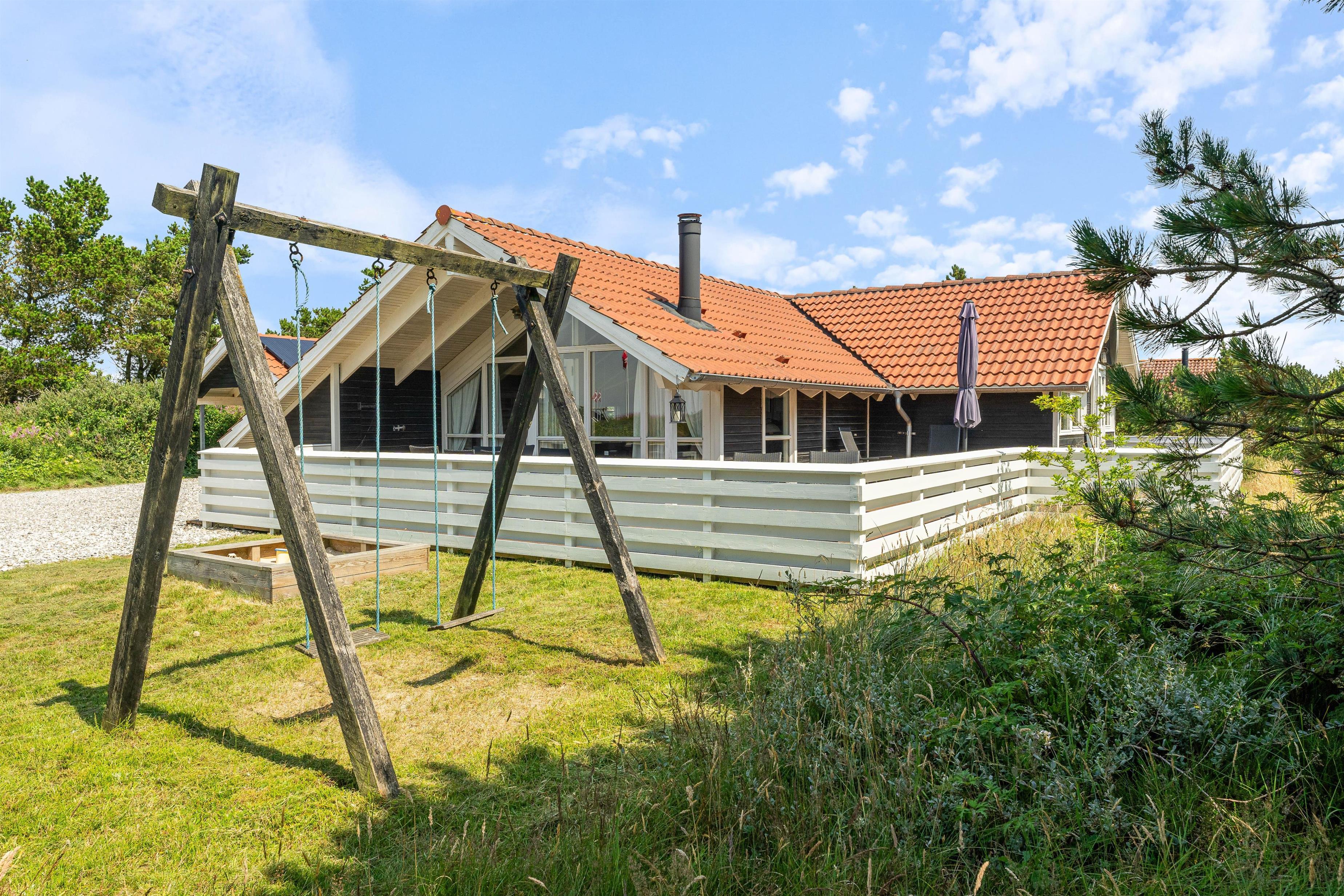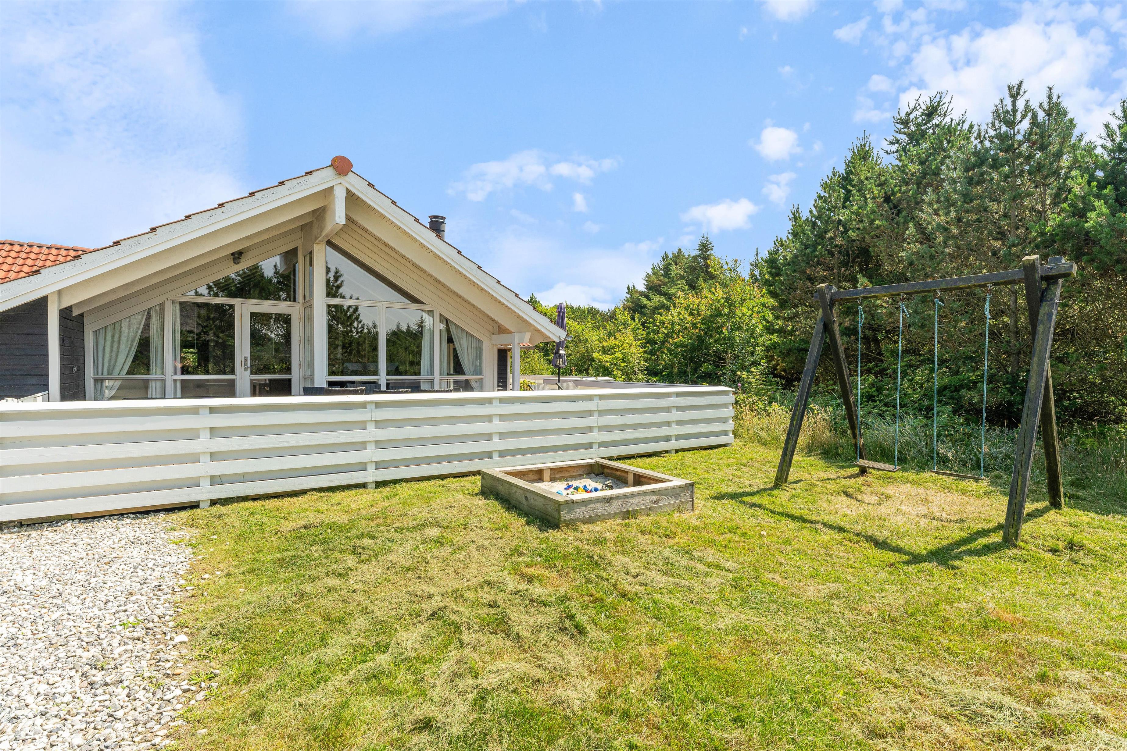 Beliggenheden på en naturgrund betyder, at I kan nyde udendørslivet fra den lukkede terrasse med havemøbler og grill. Børnene vil også elske at lege på gyngen og i sandkassen. Feriehuset er omgivet af en skøn og stor lukket terrasse, som især er perfekt, hvis der er en hund med eller mindre børn at holde øje med. Terrassen går næsten hele vejen rundt om huset, så der er rigeligt med plads til alle, og det er muligt at tilbringe det meste af dagen i solen, eller at finde gode steder med læ. Selv hvis det drypper lidt, kan I stadig noget udeliv, for dele af terrassen er også overdækket.