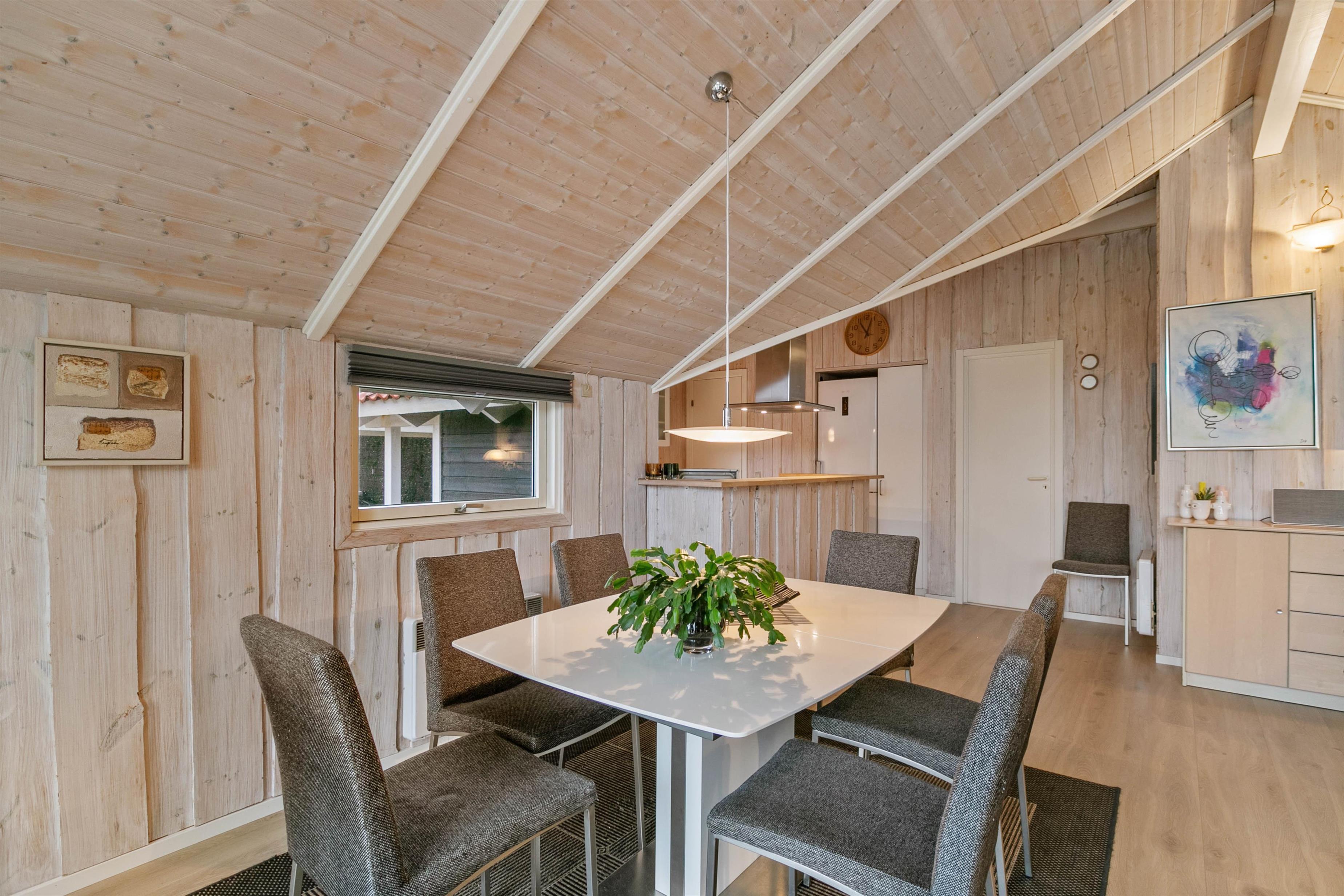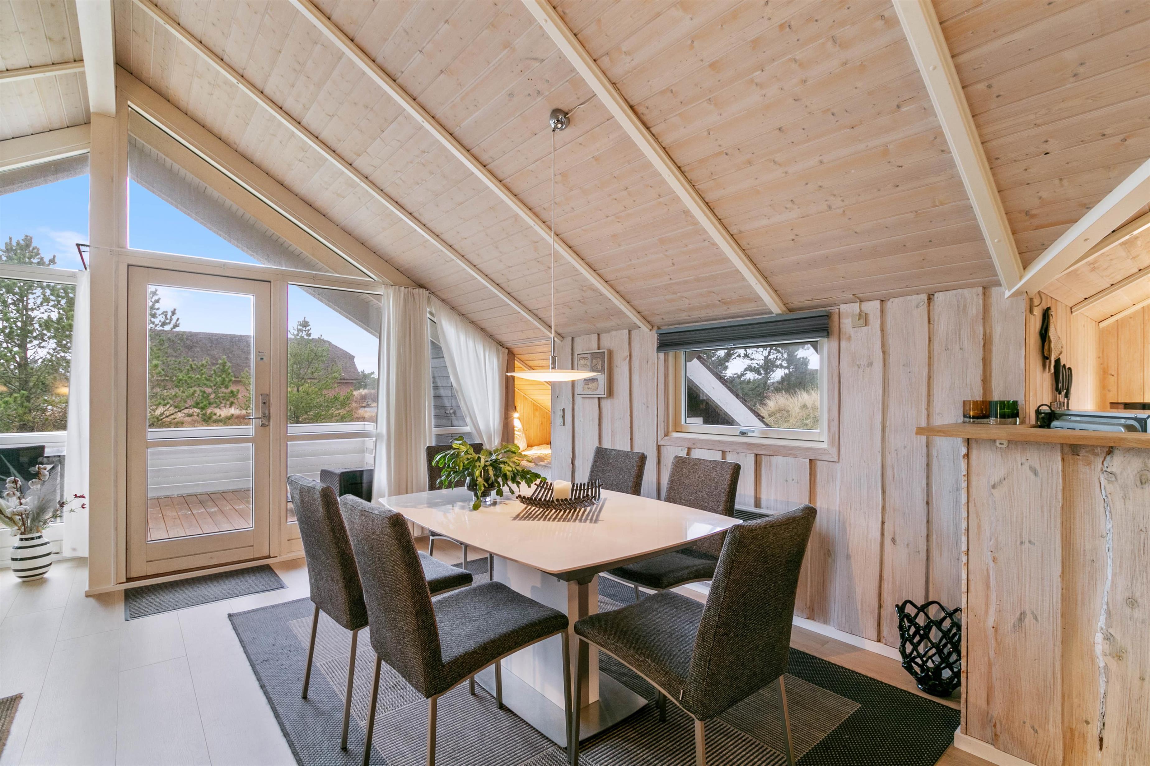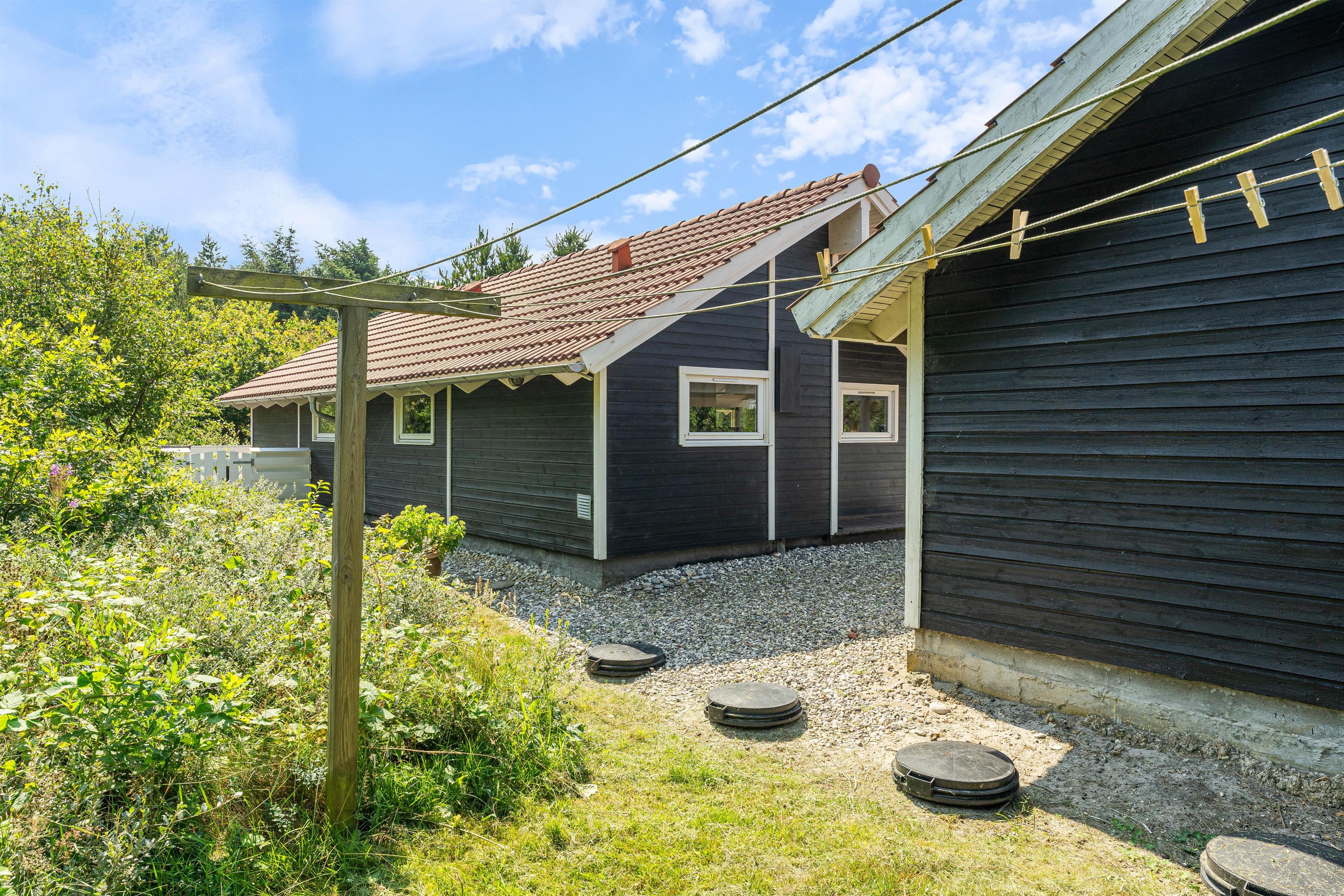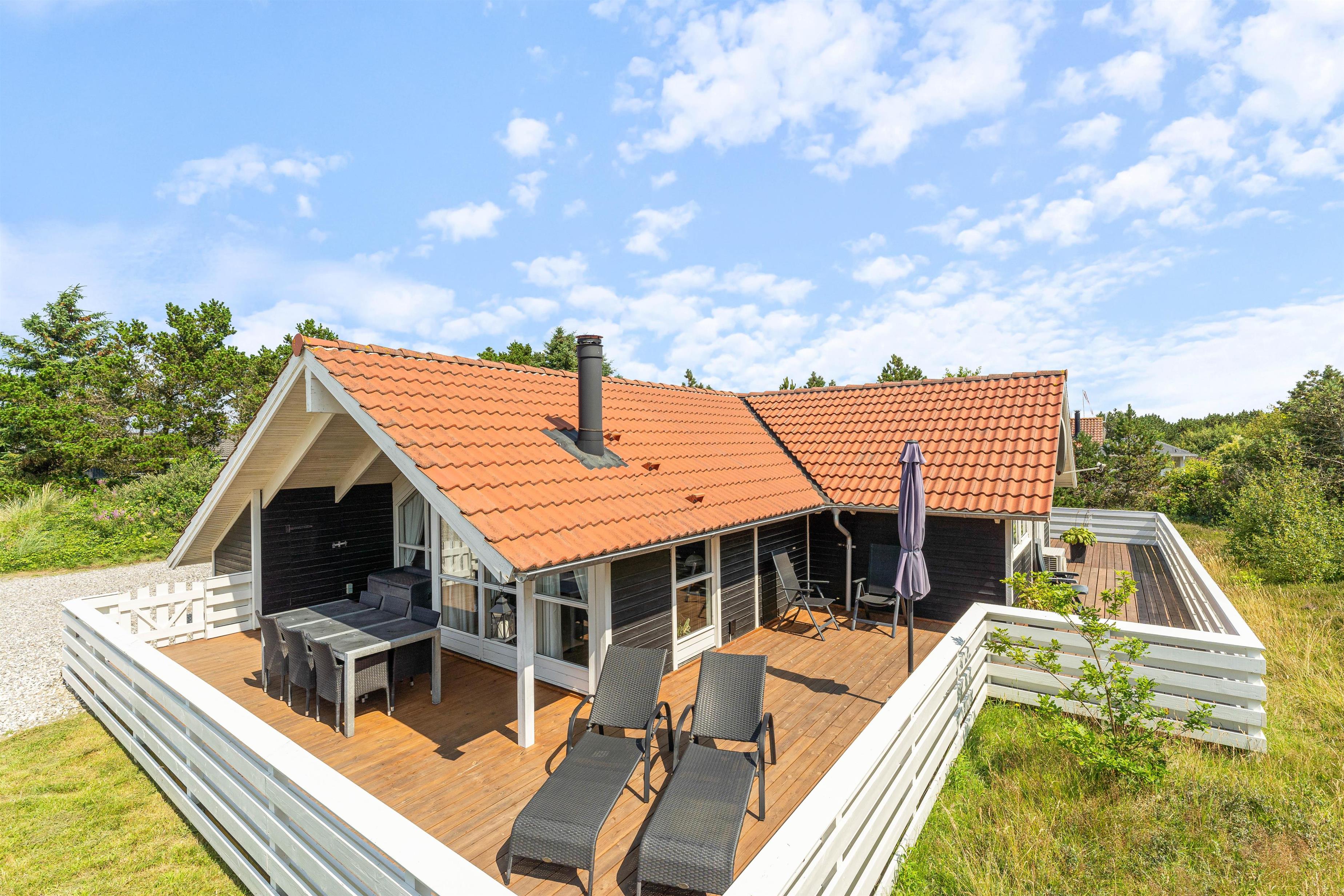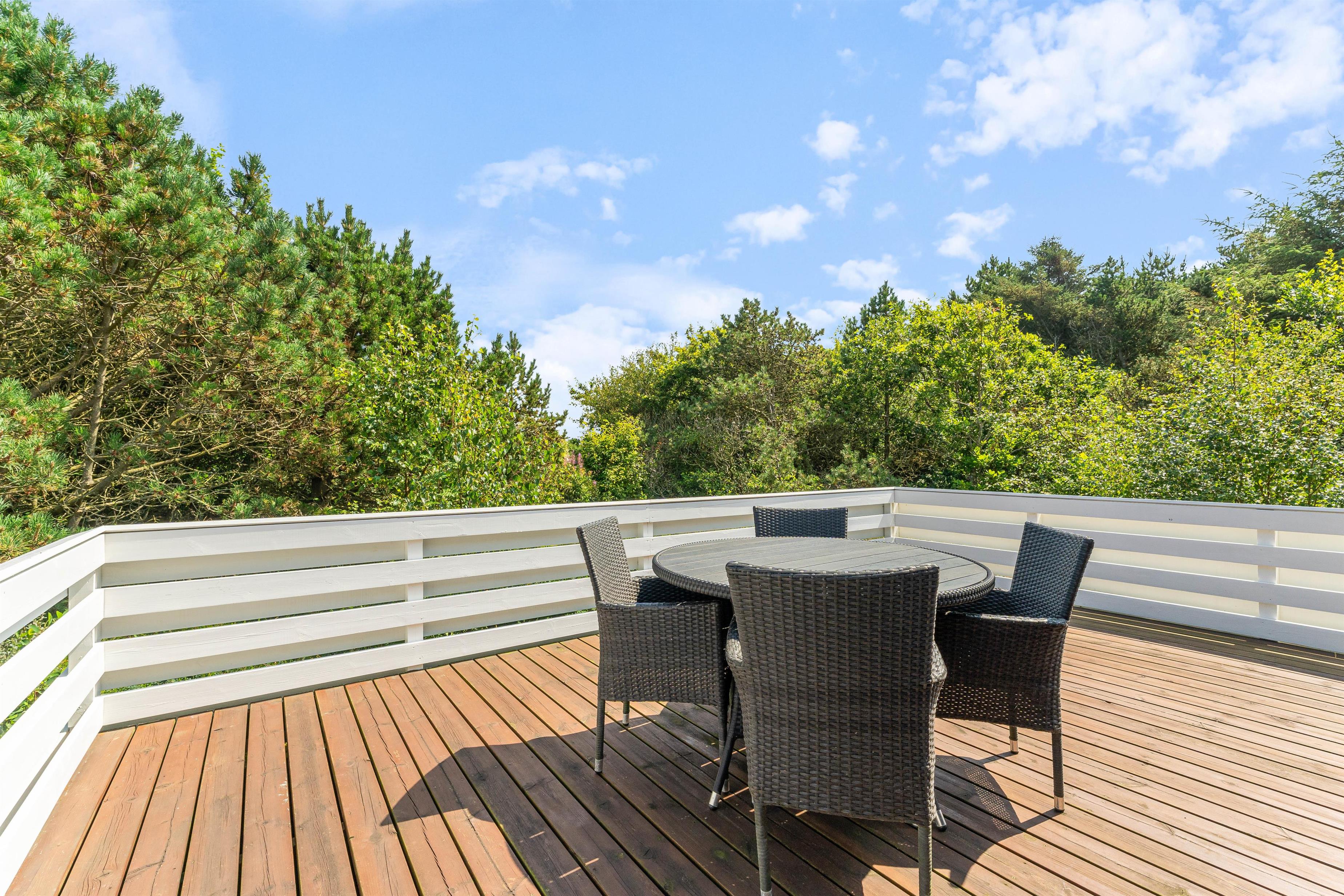 Beliggenheden på en naturgrund betyder, at I kan nyde udendørslivet fra den lukkede terrasse med havemøbler og grill. Børnene vil også elske at lege på gyngen og i sandkassen. Feriehuset er omgivet af en skøn og stor lukket terrasse, som især er perfekt, hvis der er en hund med eller mindre børn at holde øje med. Terrassen går næsten hele vejen rundt om huset, så der er rigeligt med plads til alle, og det er muligt at tilbringe det meste af dagen i solen, eller at finde gode steder med læ. Selv hvis det drypper lidt, kan I stadig noget udeliv, for dele af terrassen er også overdækket.