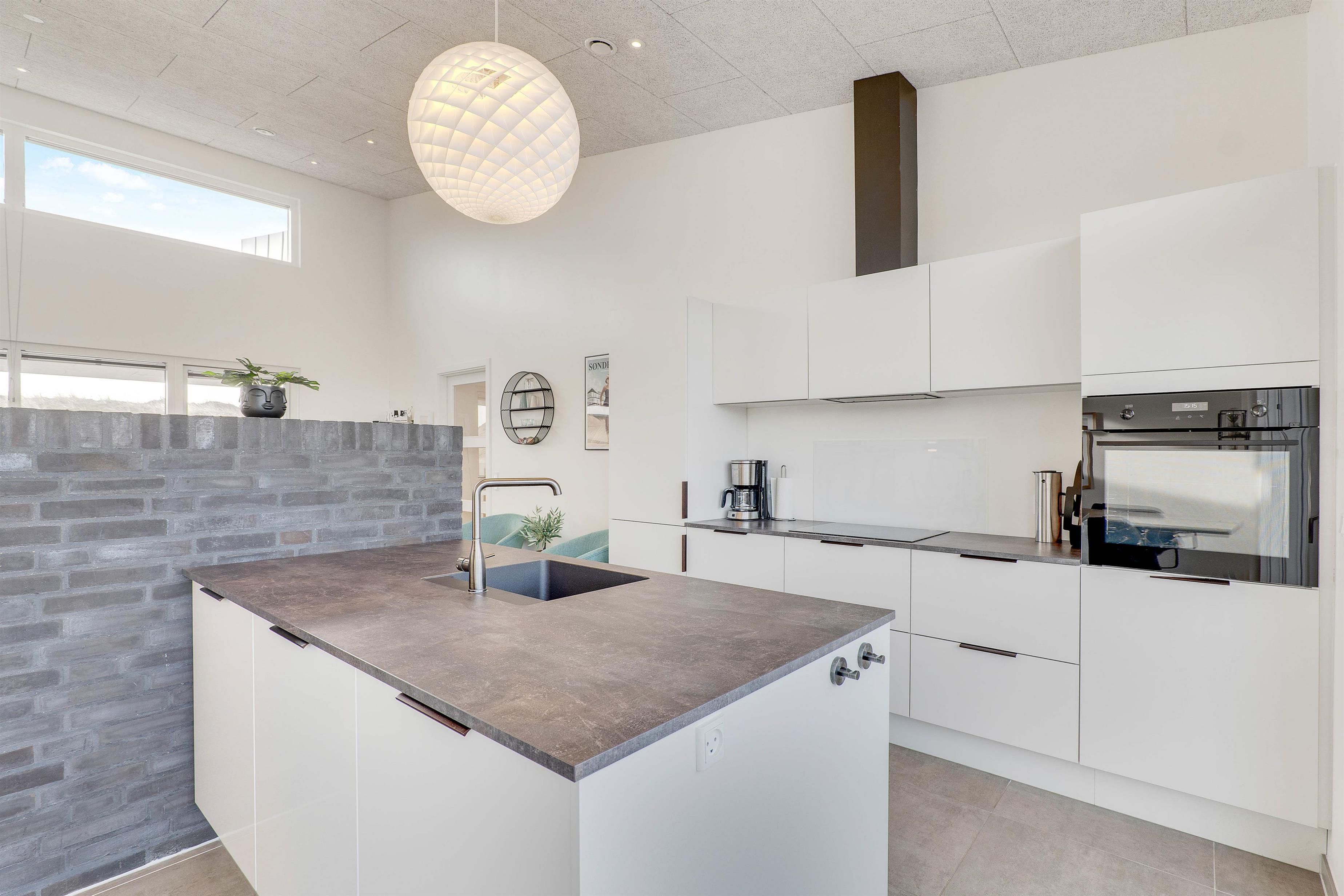 Sommerhusets hjerte er uden tvivl det store opholdsrum med integreret køkken og spiseafdeling. Her kan I mødes og lave god mad, nyde dagens mange nye indtryk foran den store fladskærm eller læse en god bog til lyden fra den knitrende brændeovn. Det store, flotte køkken er lækkert udstyret med blandt andet keramiske kogeplader, opvaskemaskine, mikroovn og køleskab med fryser.