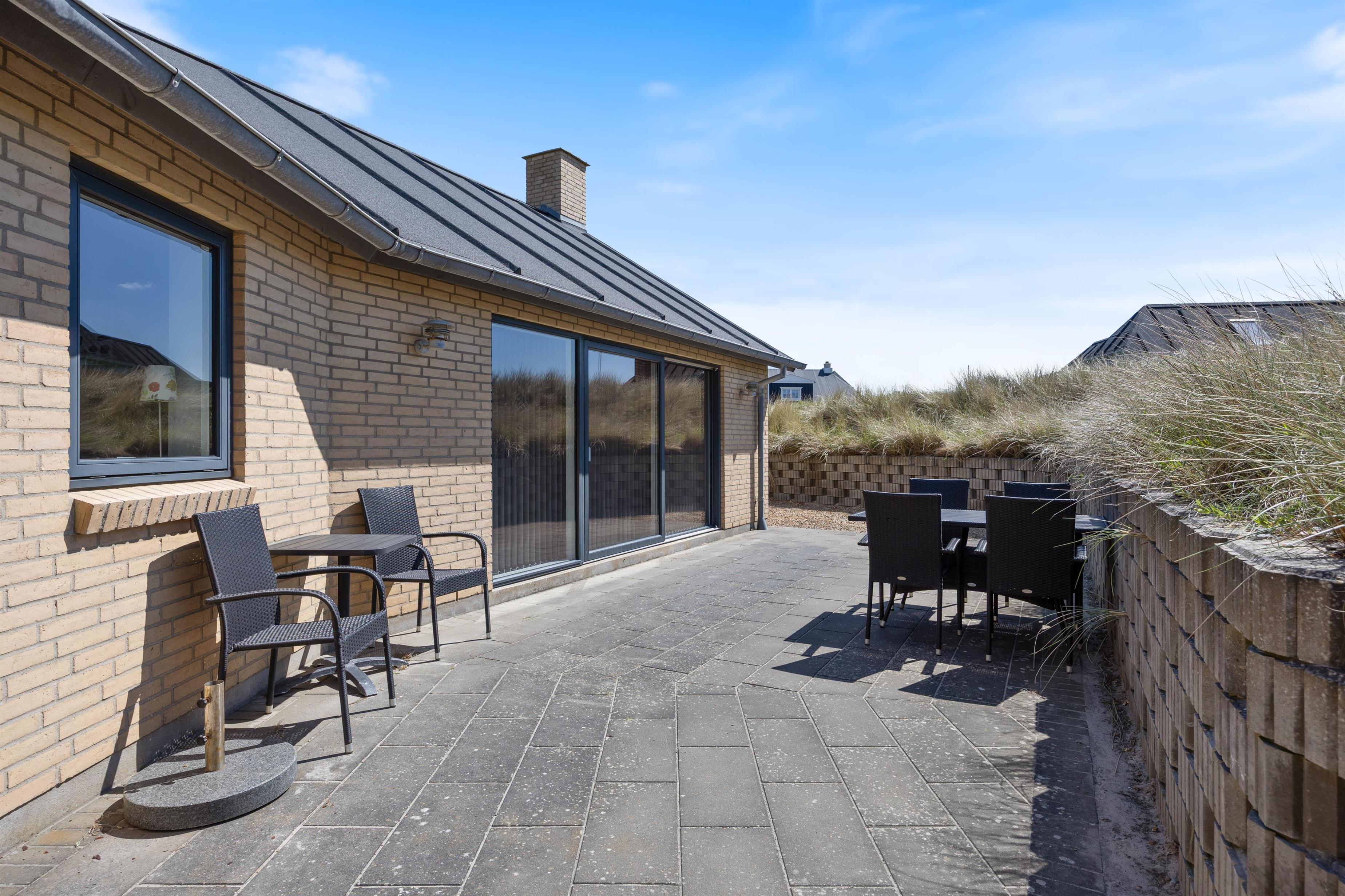 Feriehuset er indrettet med et stort moderne badeværelse og et gæstewc. Især i den koldere årstid vil I nyde, at der er gulvvarme i begge rum. Fra stuen har I direkte udgang til den skønne delvist afskærmede terrasse, der er udstyret med gode havemøbler. Her kan man virkeligt slappe af og nyde solens varme stråler på huden, lyden af bølgebrus i ørerne, duften af hav i næsen og udsigten til de hvide måger, der svæver hen over en blå himmel.
