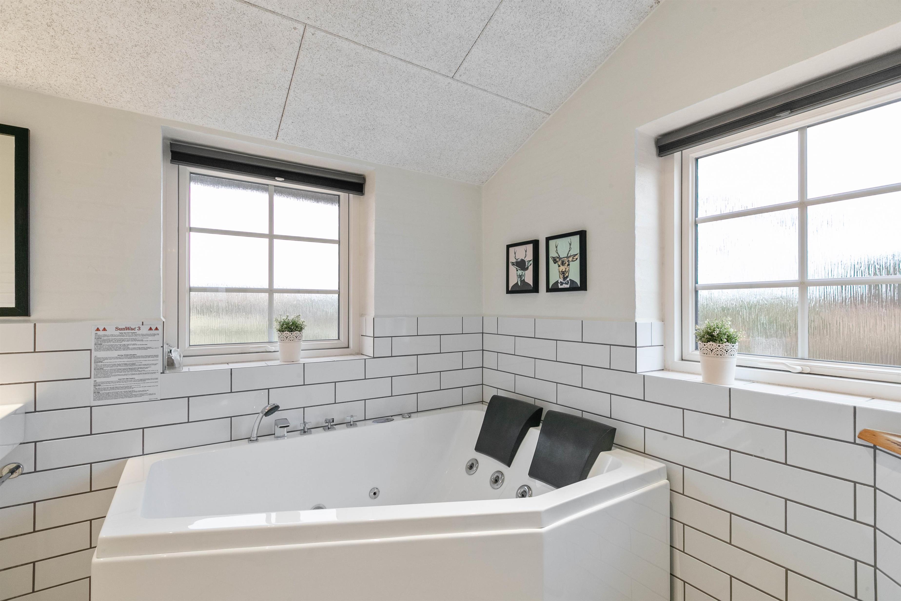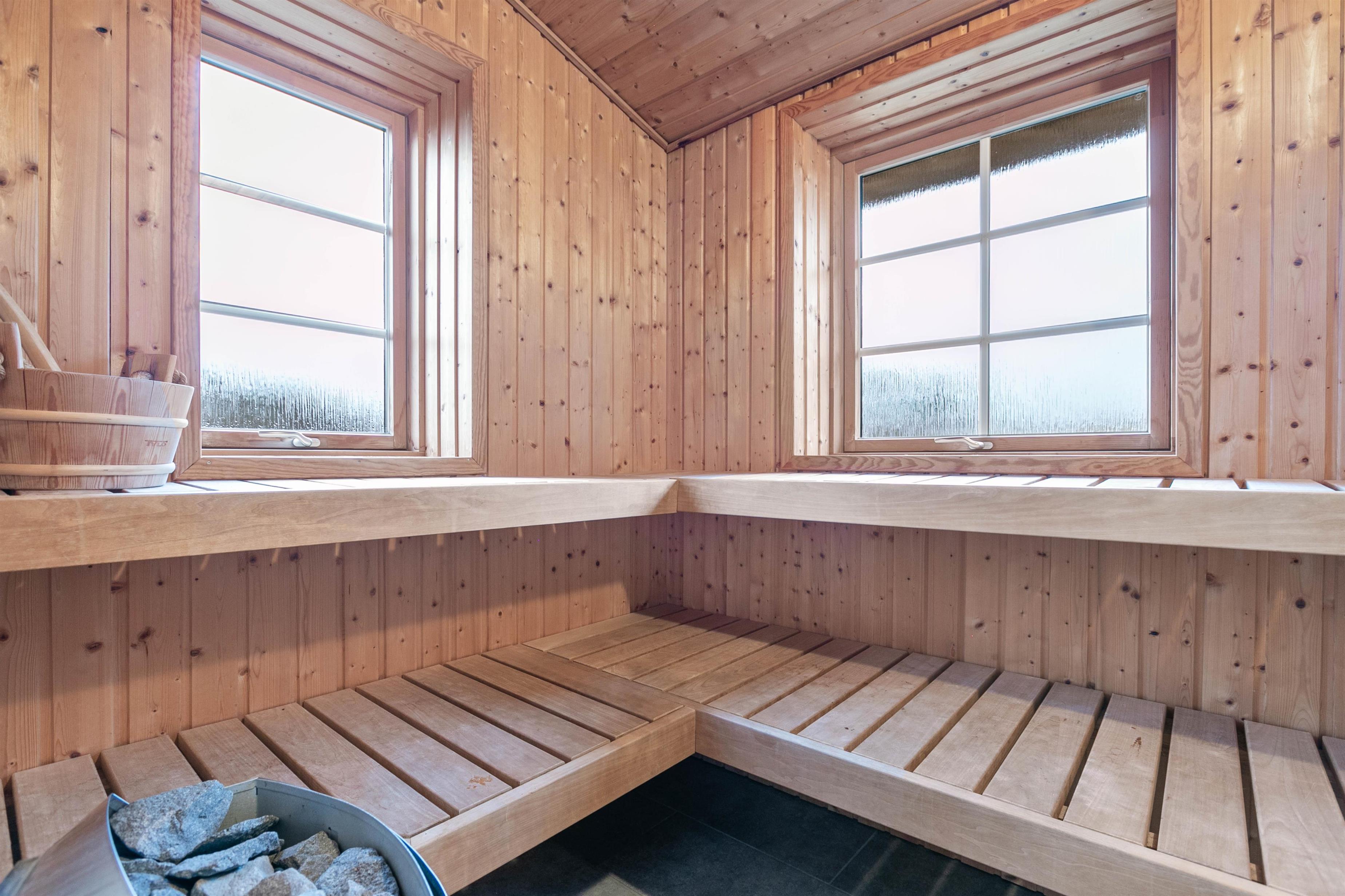 Der er lavet to soveafdelinger, så I har et soverum og det store badeværelse med sauna og spa i den ene ende af huset, og to soverum, et badeværelse og en praktisk baggang med håndvask i den anden. Sådan en rumfordeling er helt perfekt, hvis børnene skal have en afdeling for sig selv, eller hvis du holder ferie med vennerne.
