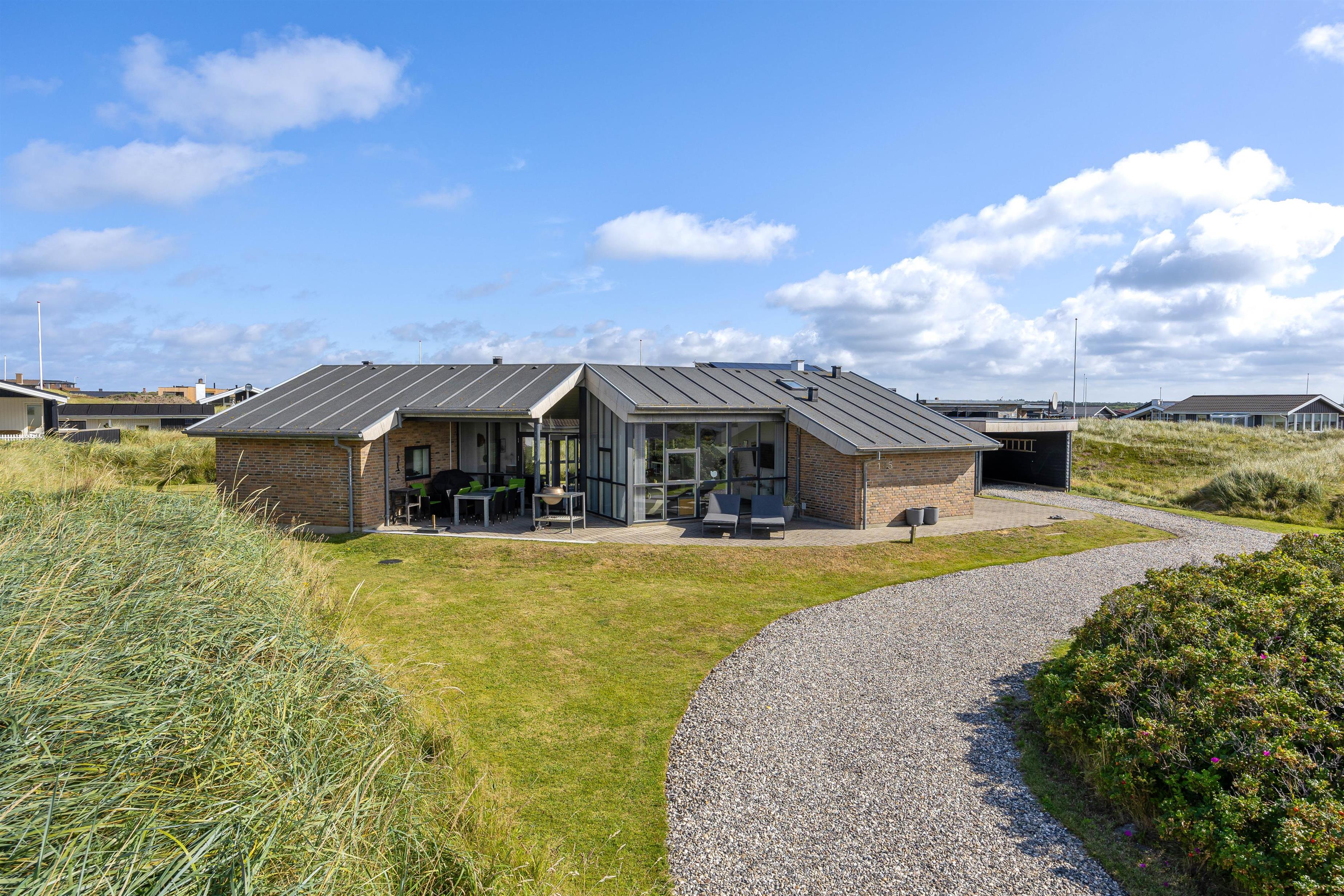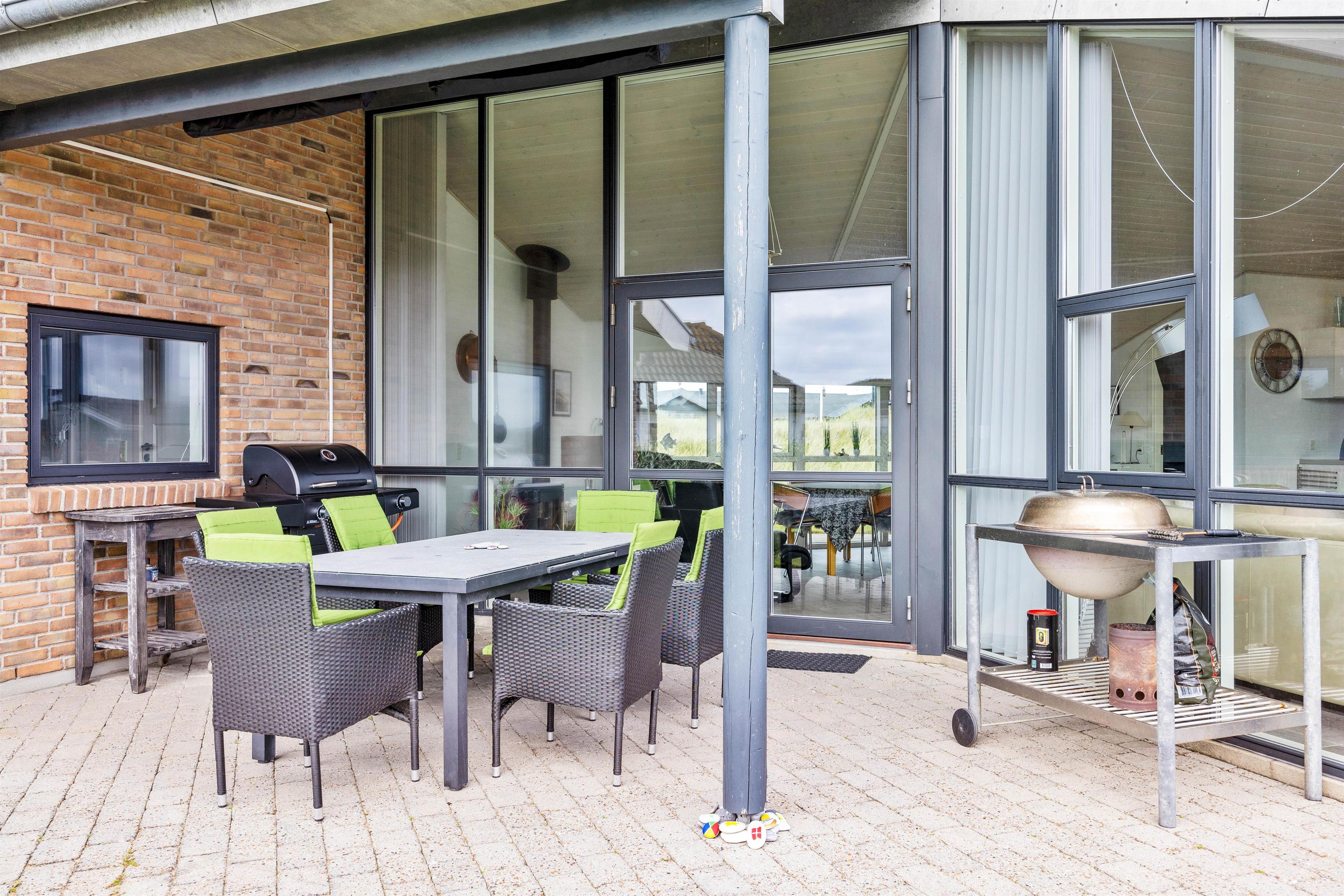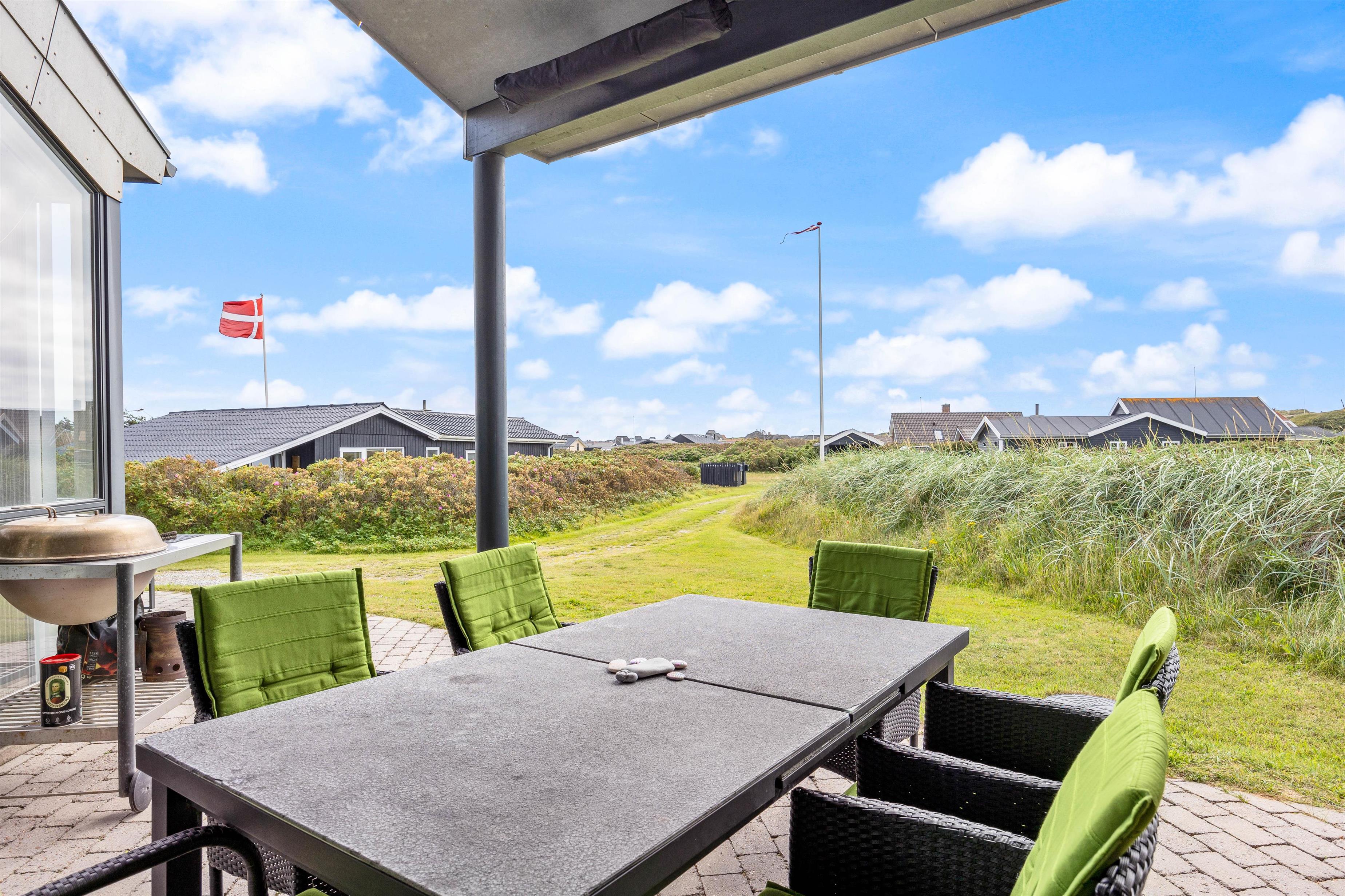 Udenfor huset finder I en dejlig og solrig terrasse, hvor I kan nyde solen og det smukke landskab omkring huset. Der er også havemøbler og en grill til rådighed, så I kan lave et lækkert måltid på grillen, og nyde det udenfor i det fri. Udenfor har i direkte adgang til en dejlig udesauna, hvor i kan nyde varmen, og på sammetid nyde udsigten ud over det betagende klitlandskab.Terrassen er delvis overdækket og med en terrassevarmer, hvilket der indbyder i stor grad til hygge. Her kan I læne jer tilbage i havestolene og bare nyde livet. Eller solbade på solsengene når vejret er godt.