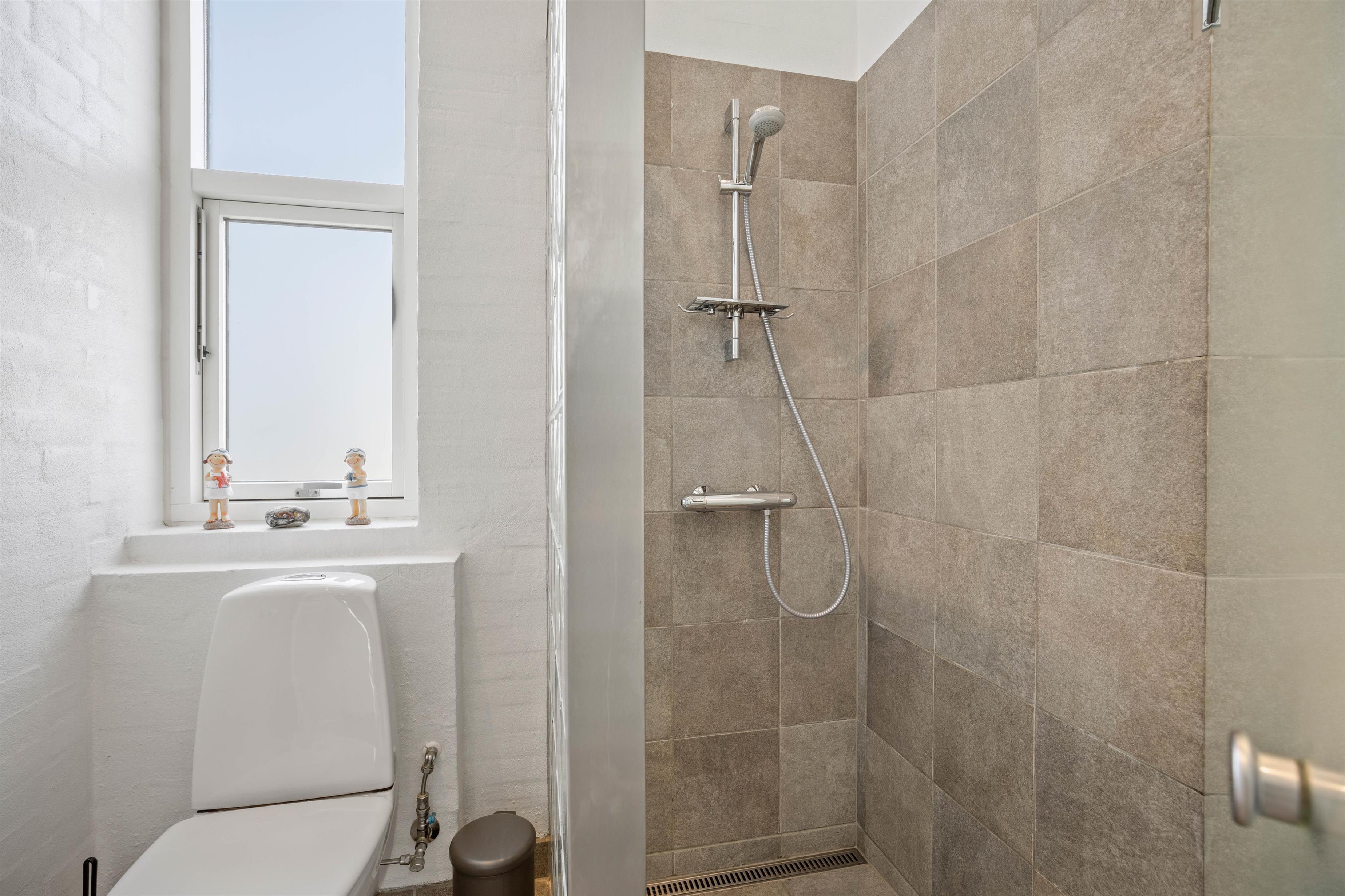 De 2 badeværelser er begge udstyret med toilet og bad, så ingen står i kø ved morgenrutinen. Alle opholdsrum samt badeværelser er udstyret med gulvvarme, hvilket giver en behagelig og hyggelig atmosfære, uanset årstiden. Om aftenen kan I synke ned i sofaen og kigge ud på stjernehimlen gennem de flotte, store vinduespartier, som bidrager til et fantastisk lysindfald i sommerhuset. Skulle I få brug for at vaske tøj under jeres ophold, så er der vaskemaskine og tørretumbler til fri afbenyttelse.
