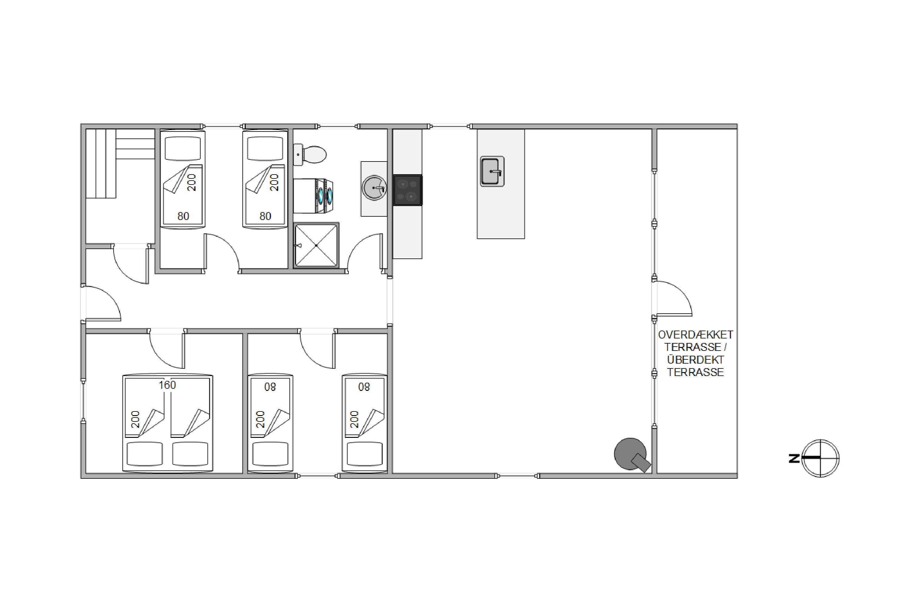 Det 72 m2 store sommerhus er lyst og dejligt indrettet med fokus på de små detaljer. De skønne vinduespartier giver et godt lysindfald i feriehuset og er med til at skabe en hyggelig atmosfære og feriestemning. Sommerhuset råder over 3 dejlige soverum og plads til 6 personer, hvoraf 2 af soveværelserne er indrettet med hver 2 enkeltsenge og det sidste med en dobbeltseng. Desuden råder feriehuset over både sauna, brændeovn, Smart-tv og gratis, trådløst internet i huset.