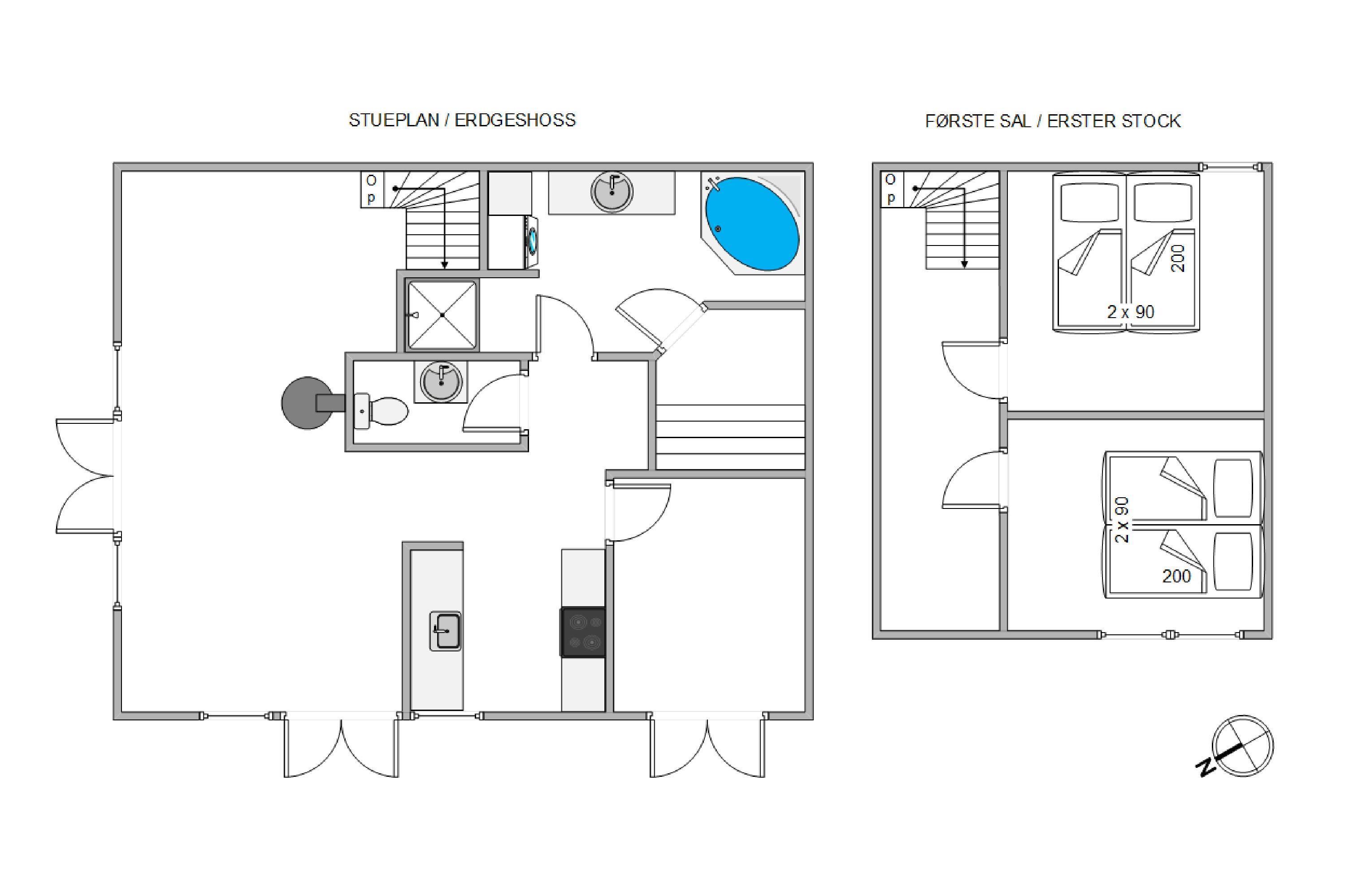 På første sal ligger ferieboligens to soveværelser, som begge er hyggeligt indrettede og udstyrede med dobbeltsenge. Her kan I trække jer tilbage efter en dejlig dag og lade batterierne op igen til nye eventyr på ferien.
