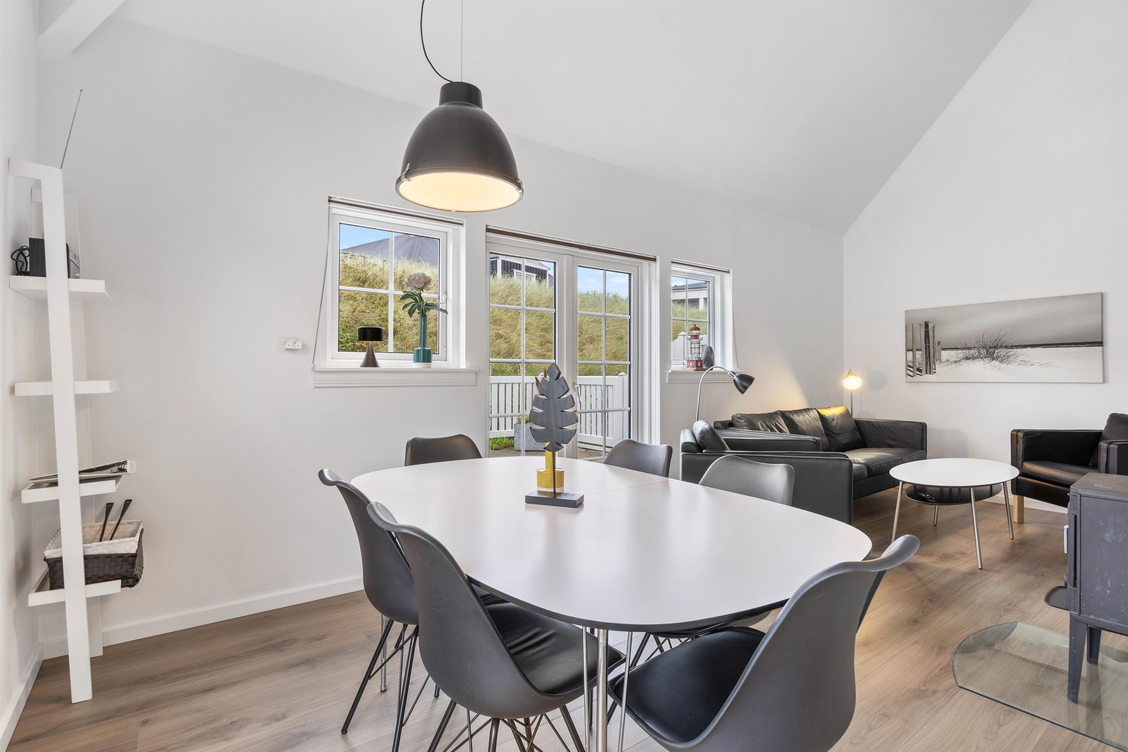 Feriehuset blev renoveret i 2023 og er indrettet på 2 etager. I stueetagen ligger den store opholdsstue, som helt klart er feriehusets hjerte. Opholdsstuen er i direkte forbindelse med køkkenet, og her kan I samles og lave mad sammen mens I planlægger feriens kommende aktiviteter.
