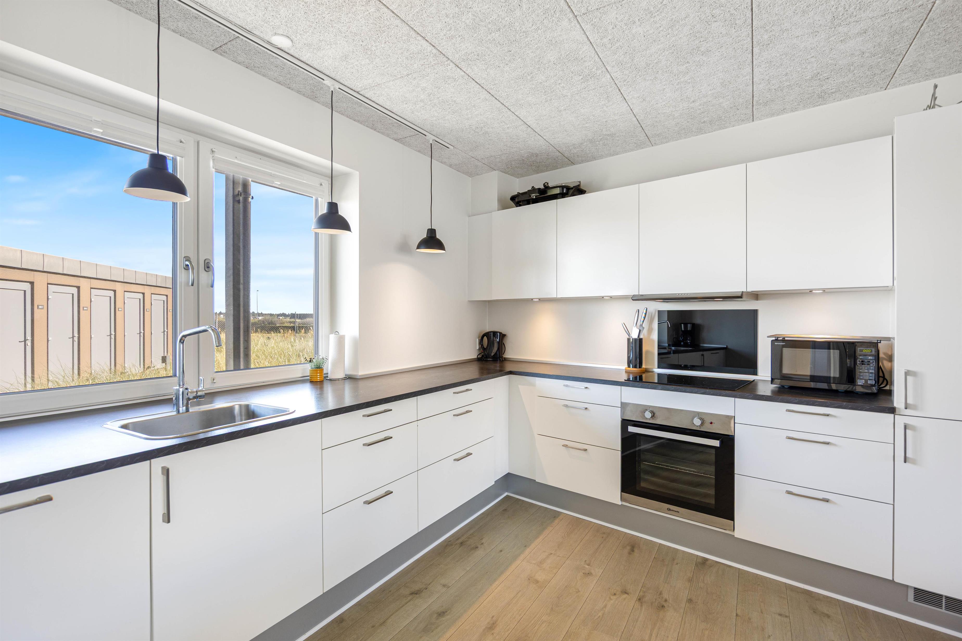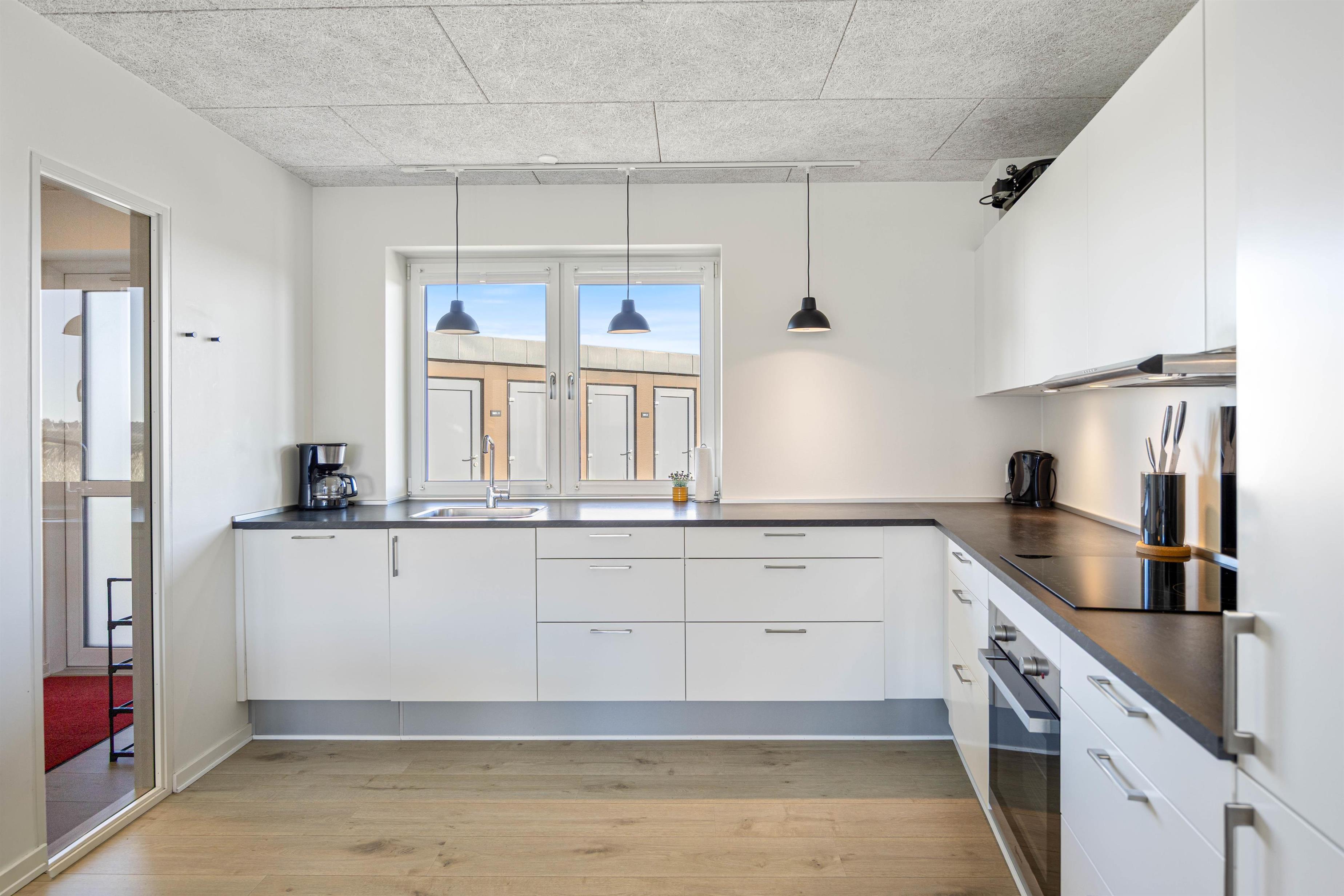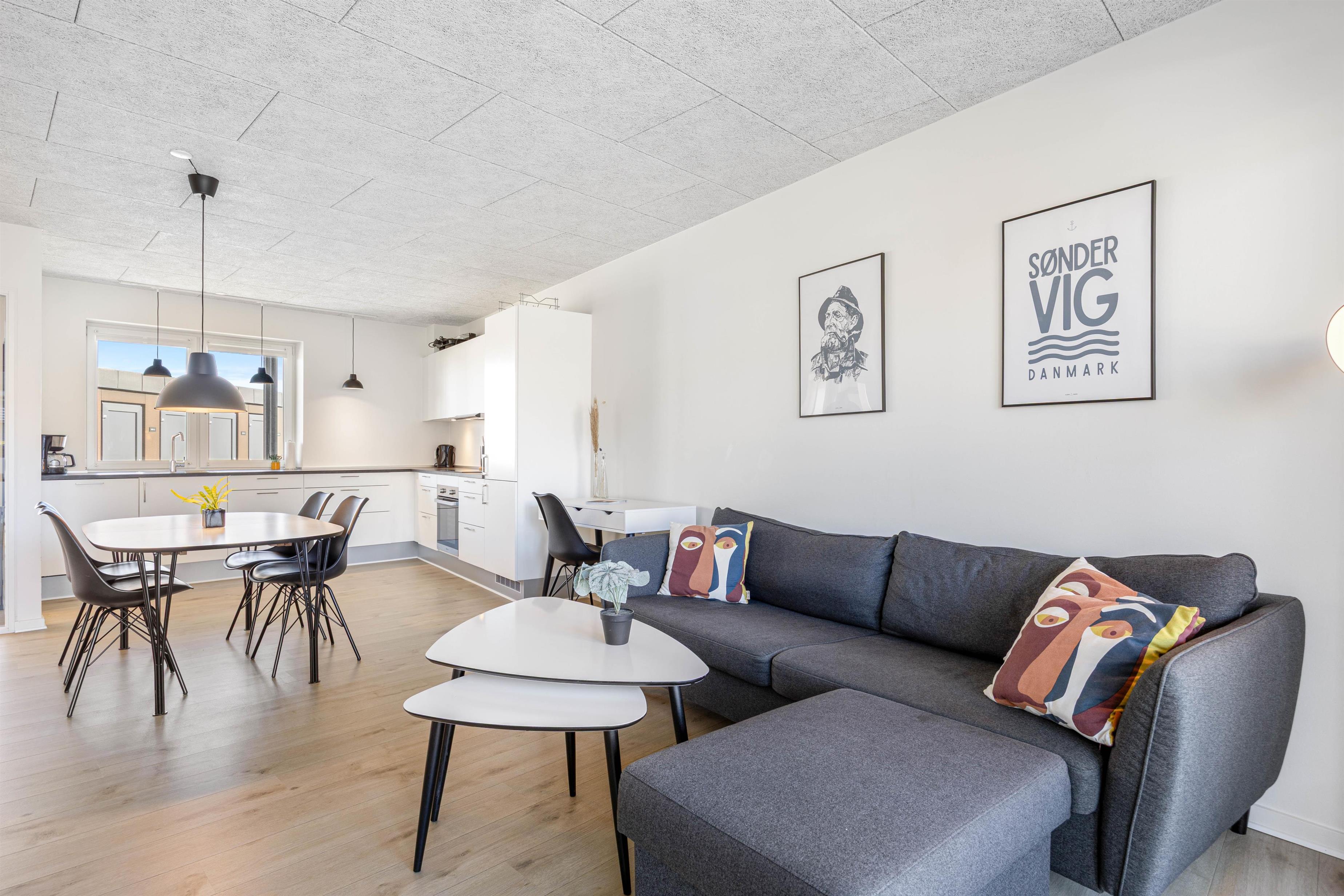 Det store og åbne opholdsrum med gulvvarme, hvor stuen står i åben forbindelse til køkkenet former lejlighedens hjerte. Det er her alle kan samles og samtidig lave noget hver for sig på de rolige aftener. Feriekokkene har rig mulighed for at slå sig løs i det veludstyrede køkken og afprøve forskellige retter. Hvad med en lækker fiskeret med friskfanget fisk fra Hvide Sande?