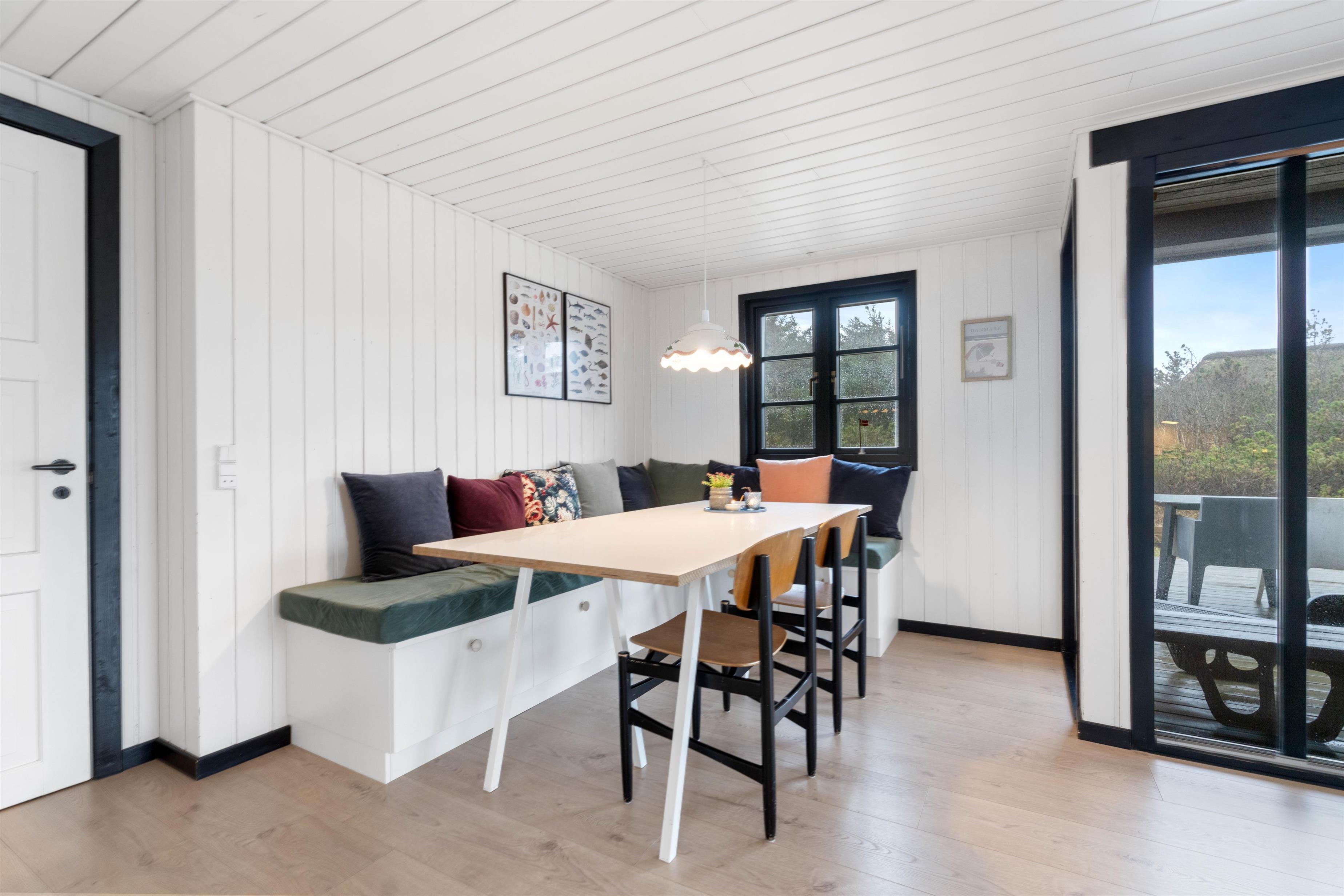 Det flotte feriehus på Nordsøvej 458 har i 2018 gennemgået en totalrenovering, og den lækre og moderne stil skinner klart igennem i indretningen, samtidig med, at den klassiske sommerhushygge er bevaret. De lyse farver skaber en imødekommende atmosfære, mens de skarpe kontraster sætten prikken over i'et i de stilfulde omgivelser. I stuen står brændeovnen klar til at sprede ekstra varme og feriestemning, og gennem store vinduespartier har I udsigt til den smukke natur, I er omgivet af.