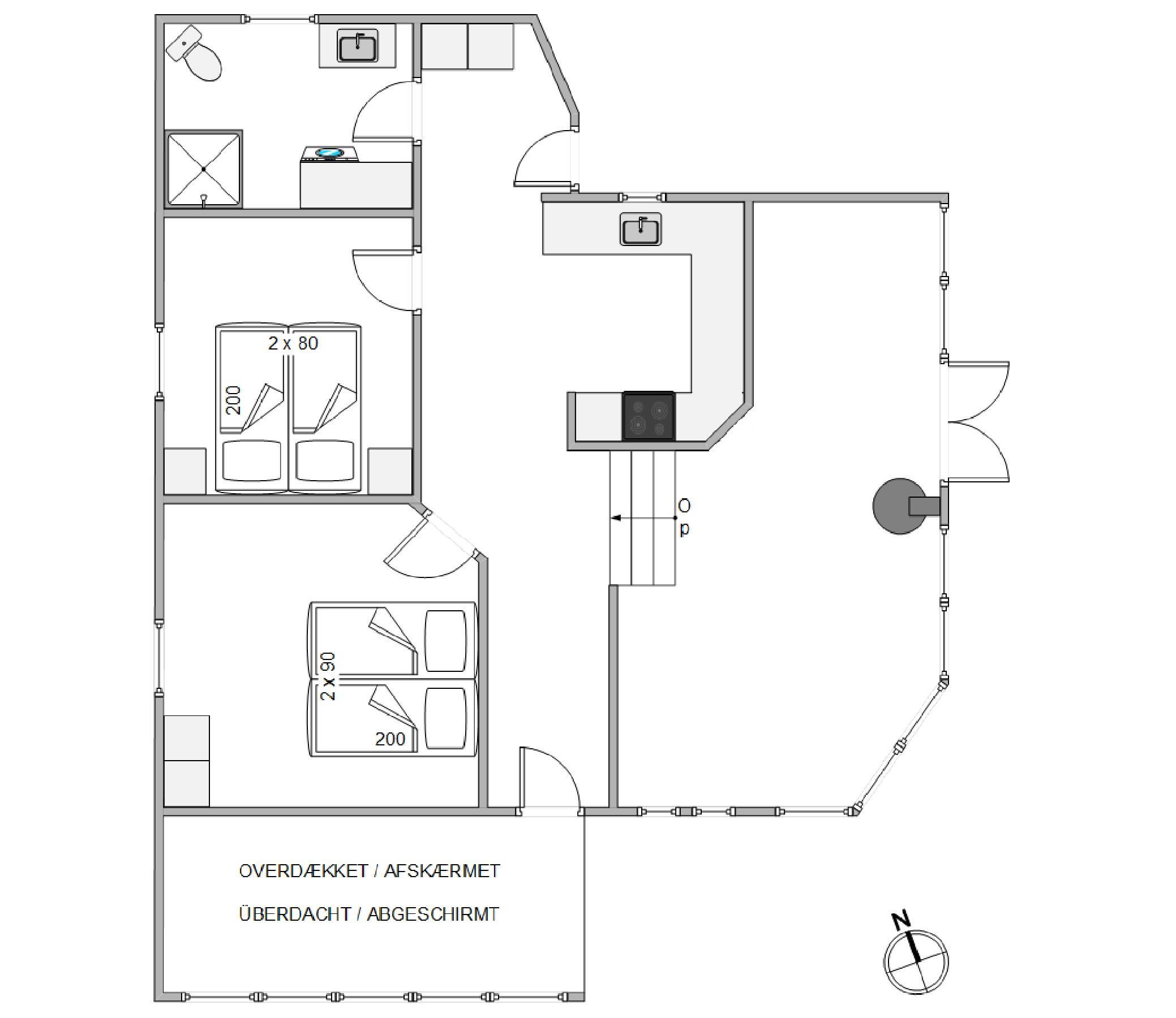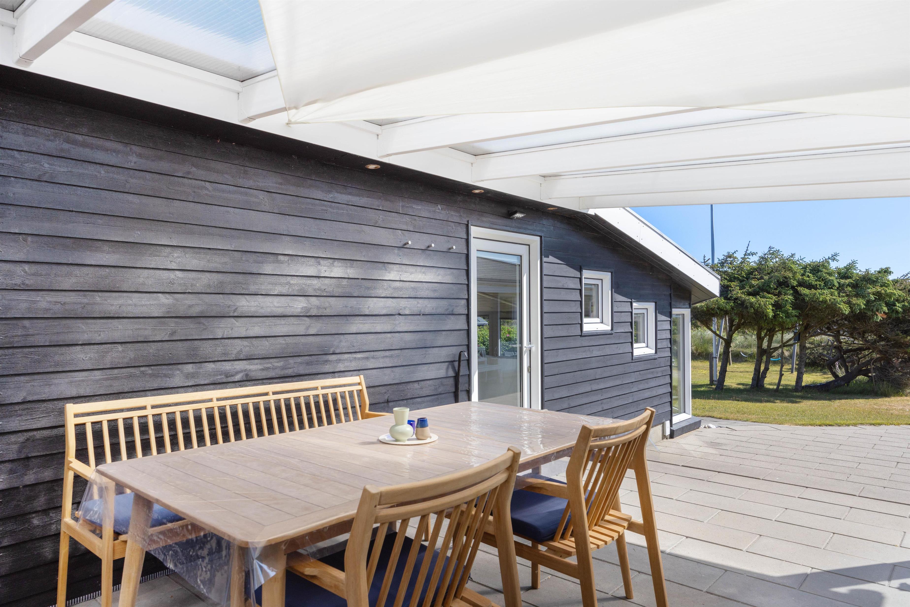 Sommerhuset har to alsidige terrasser, så der er noget for enhver smag, uanset om I er til læ og skygge eller sol og udsigt. Den ene terrasse er både overdækket og afskærmet fra vinden, så her kan I altid finde en hyggekrog, hvor I kan læne jer tilbage med en god bog i hånden. Den anden terrasse er en forhøjet træterrasse med fantastisk udsigt til den smukke vestjyske natur.
