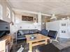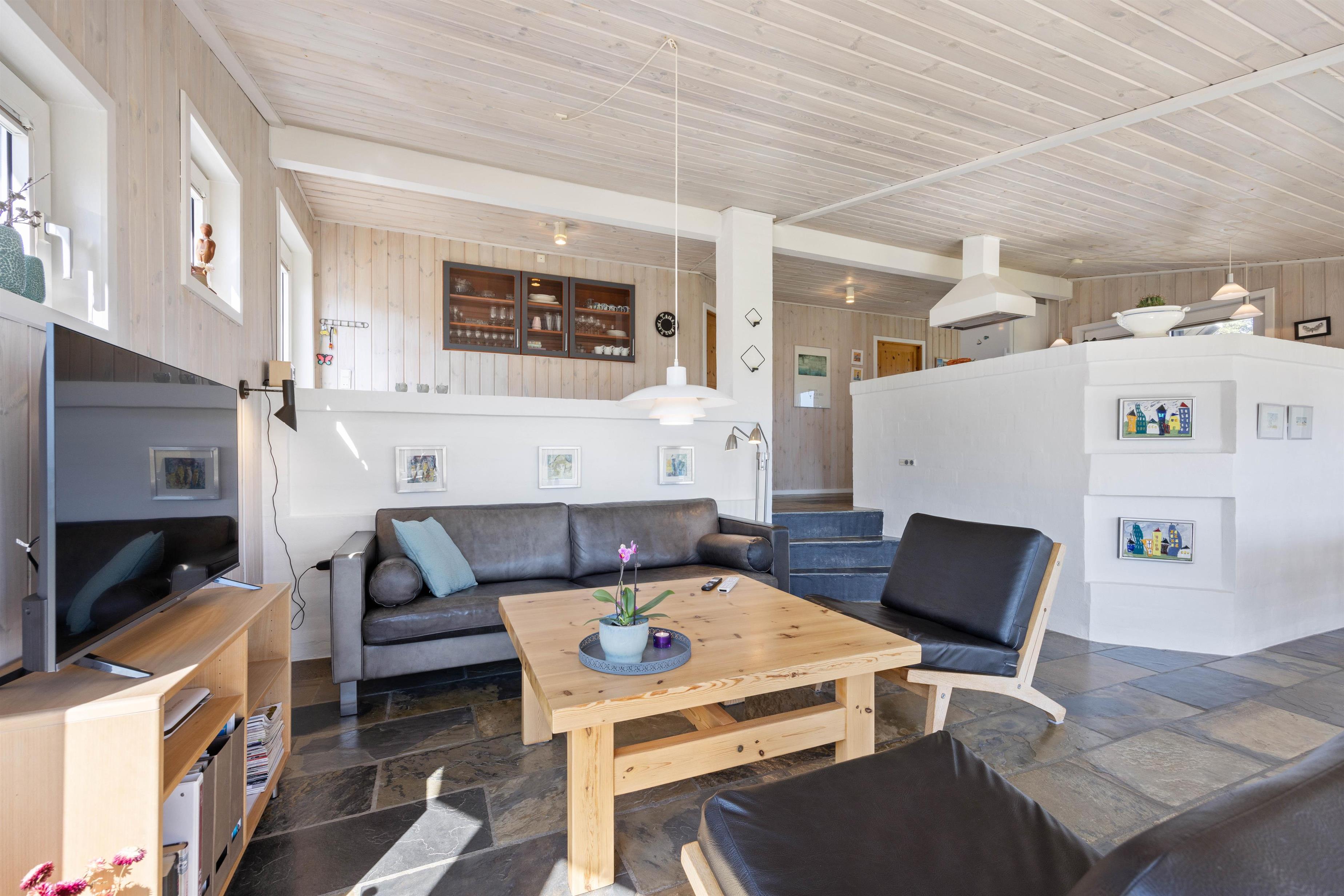 Den lyse, hyggelige nedsunket opholdsstue med opvarmet flisegulv er udstyret med brændeovn, hvor hele familien kan samles efter dagens oplevelser og nyde hinandens selskab. Her sørger de store vinduespartier for et dejligt lysindfald, og sikrer ikke mindst en god udsigt til de naturskønne omgivelser. Opholdsstuen er kombineret med køkkenet, hvor der kan laves lækkert mad. Derudover har sommerhuset to gode soveværelser med dobbeltseng, samt et badeværelse med gulvvarme.