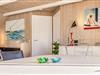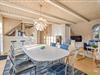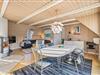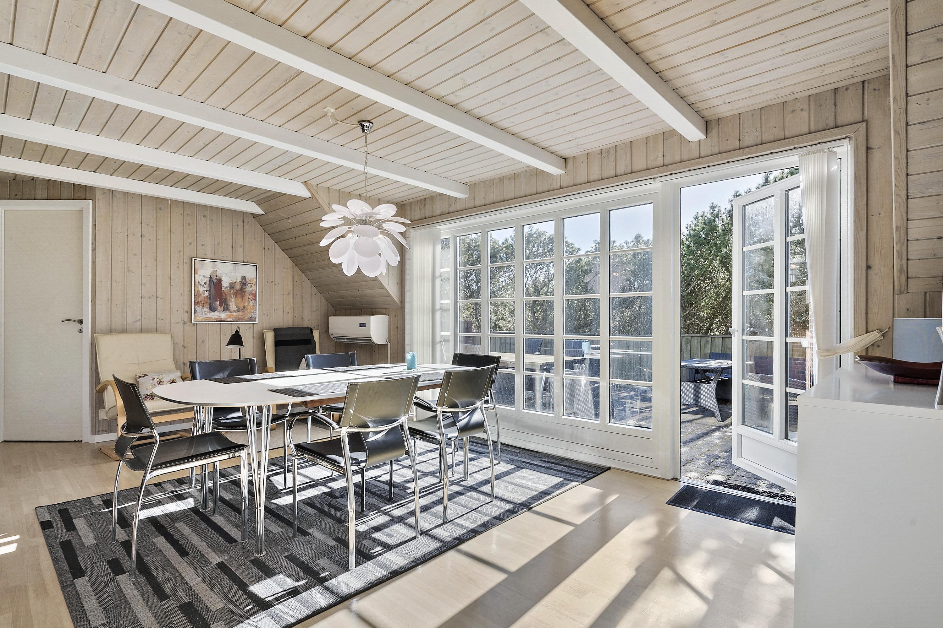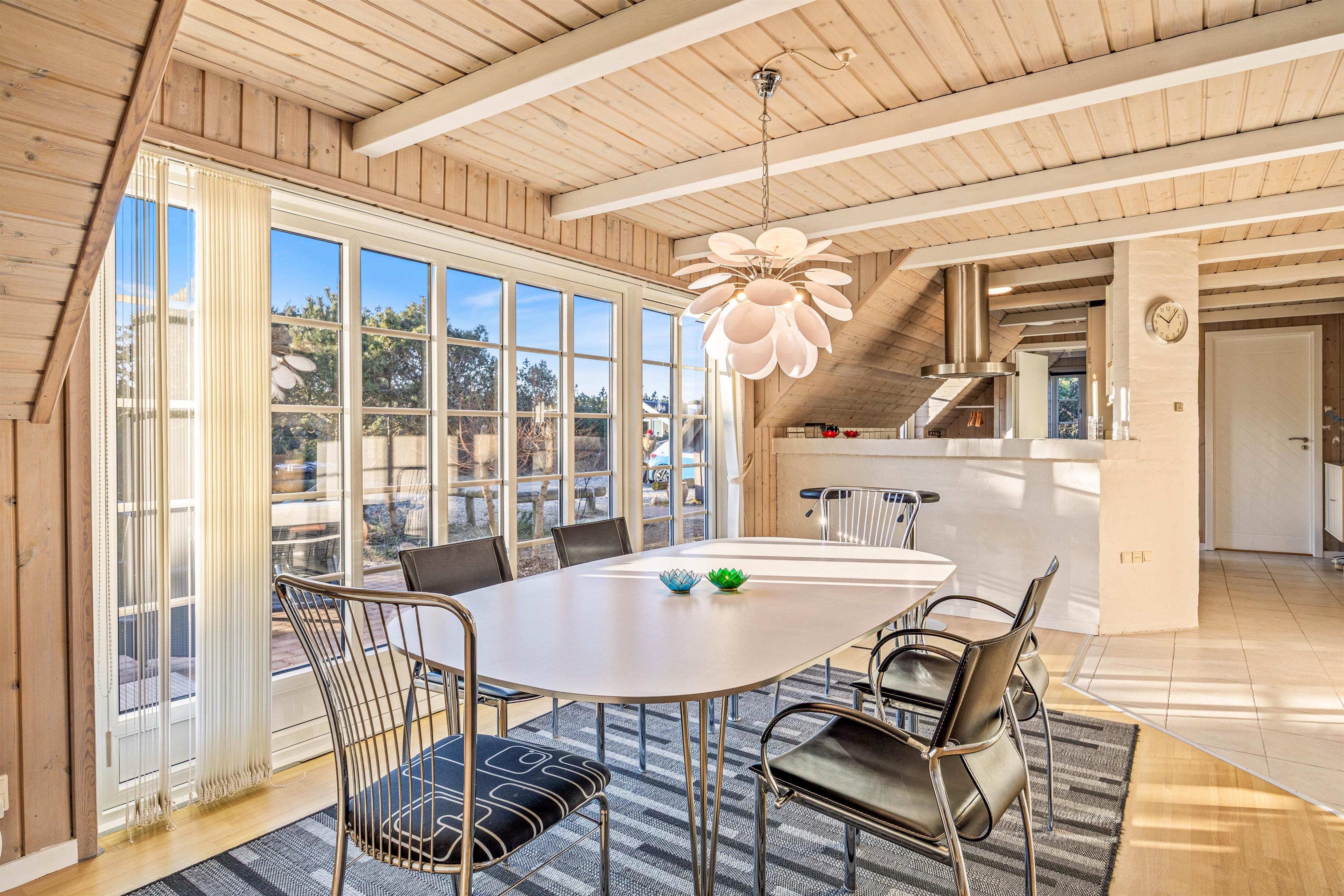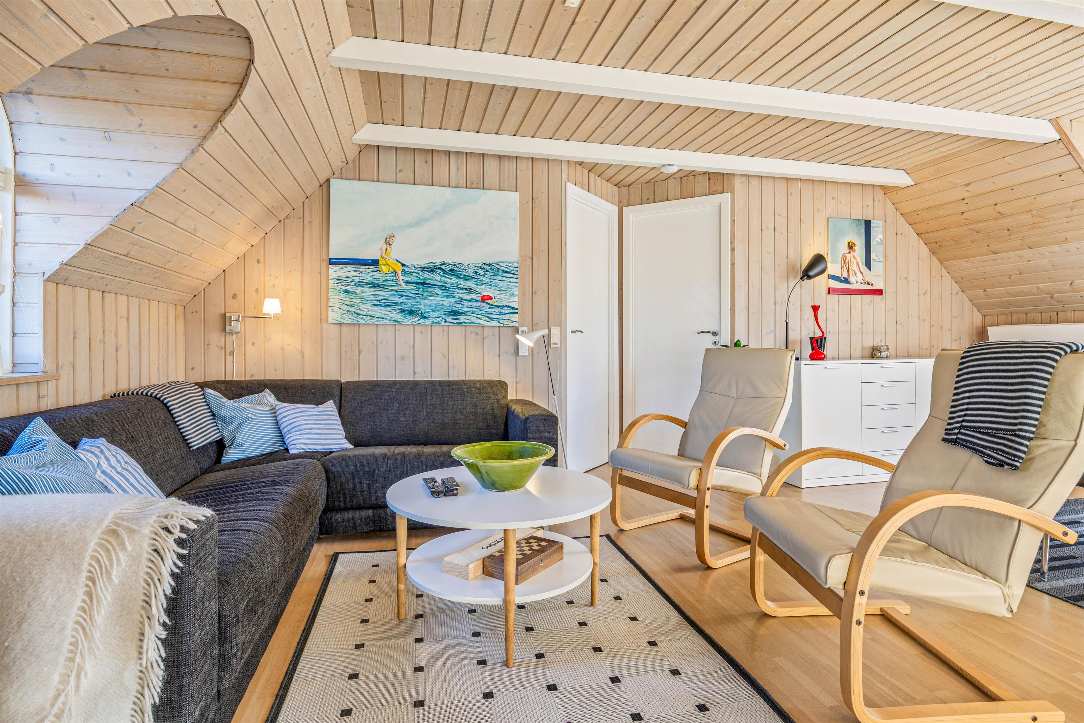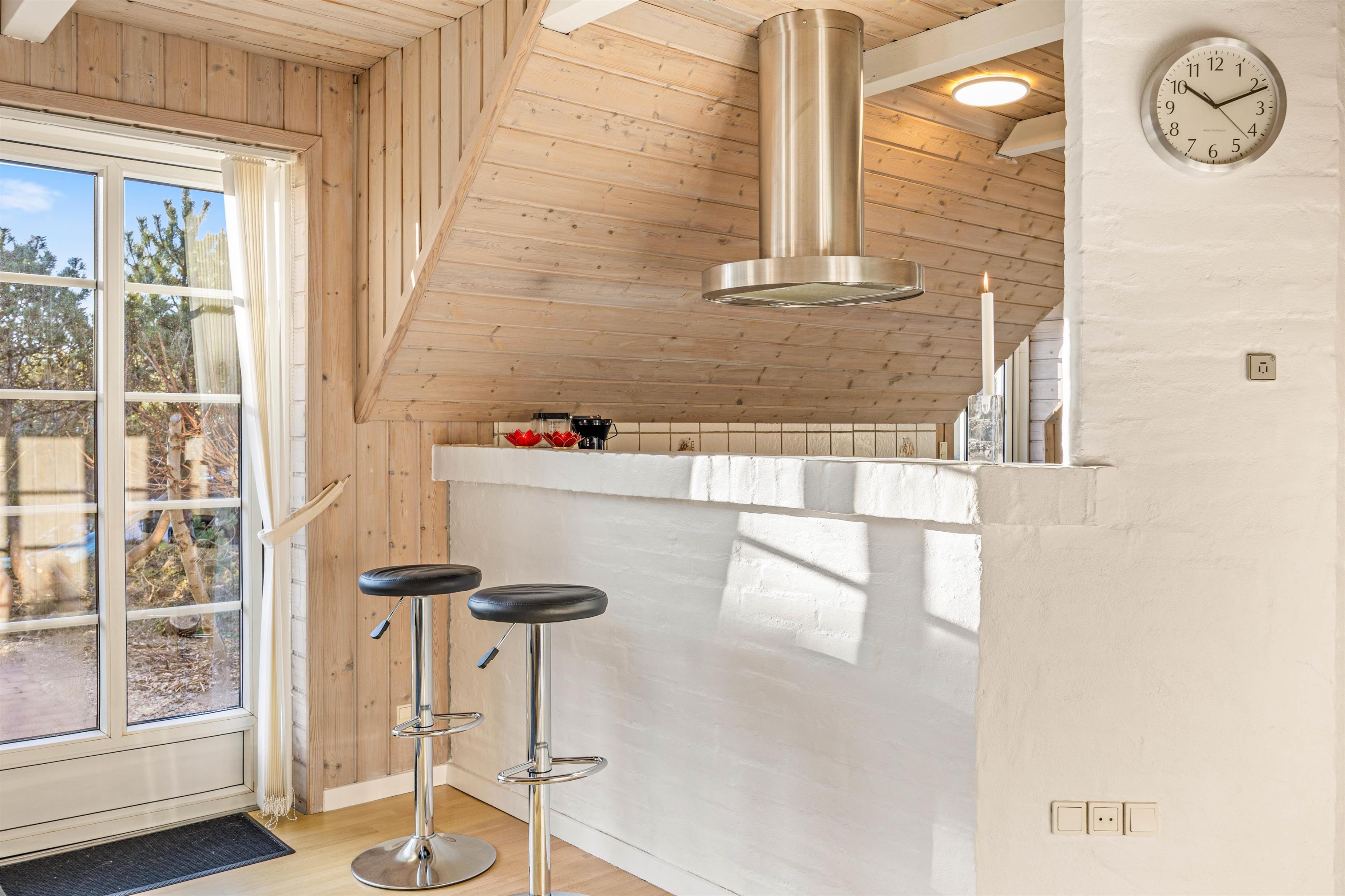 Sommerhusets hjerte er det åbne køkken-alrum – et lyst og rummeligt område, hvor hele familien kan samles. Her kan nogle lave mad, mens andre nyder et brætspil eller hyggeligt samvær. Om aftenen kan alle samles i sofaen til filmhygge, og på kølige aftener skaber brændeovnen ekstra varme og atmosfære.