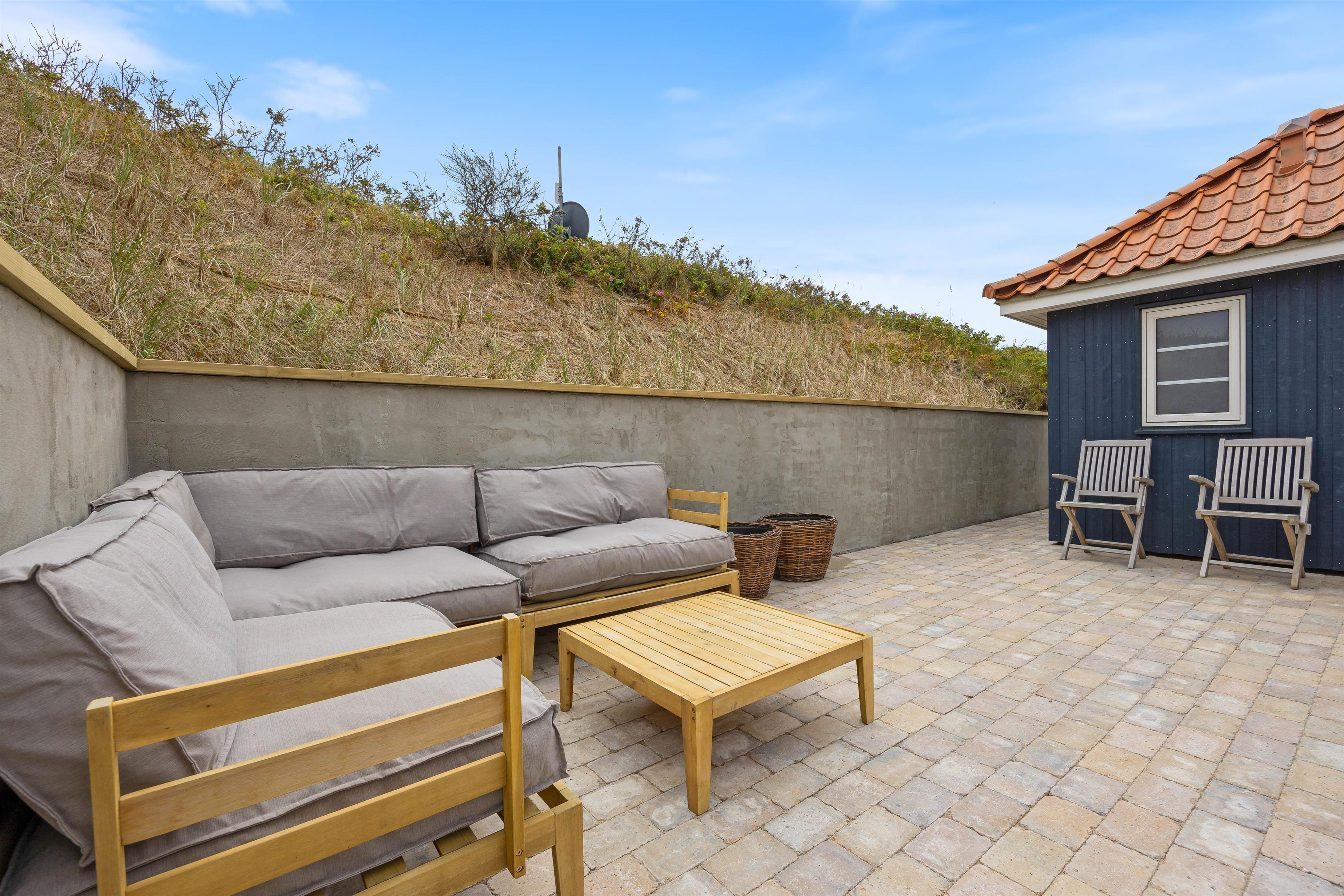Den hyggelige udestue er det perfekte sted at slappe af med en god bog eller nyde morgensolen sammen med en kop kaffe. Om sommeren kan I nyde jeres måltider på terrassen. Hele vejen rundt om huset er der lagt fliser, og der er derfor mange forskellige små hyggekroge hele vejen rundt om huset. For de, der søger lidt ekstra privatliv, byder sommerhuset også på en afskærmet terrasse, hvor man kan nyde solens stråler i fred og ro, hvor der også er en grill og komfortable havemøbler, så der er rig mulighed for at lave lækre grillretter.