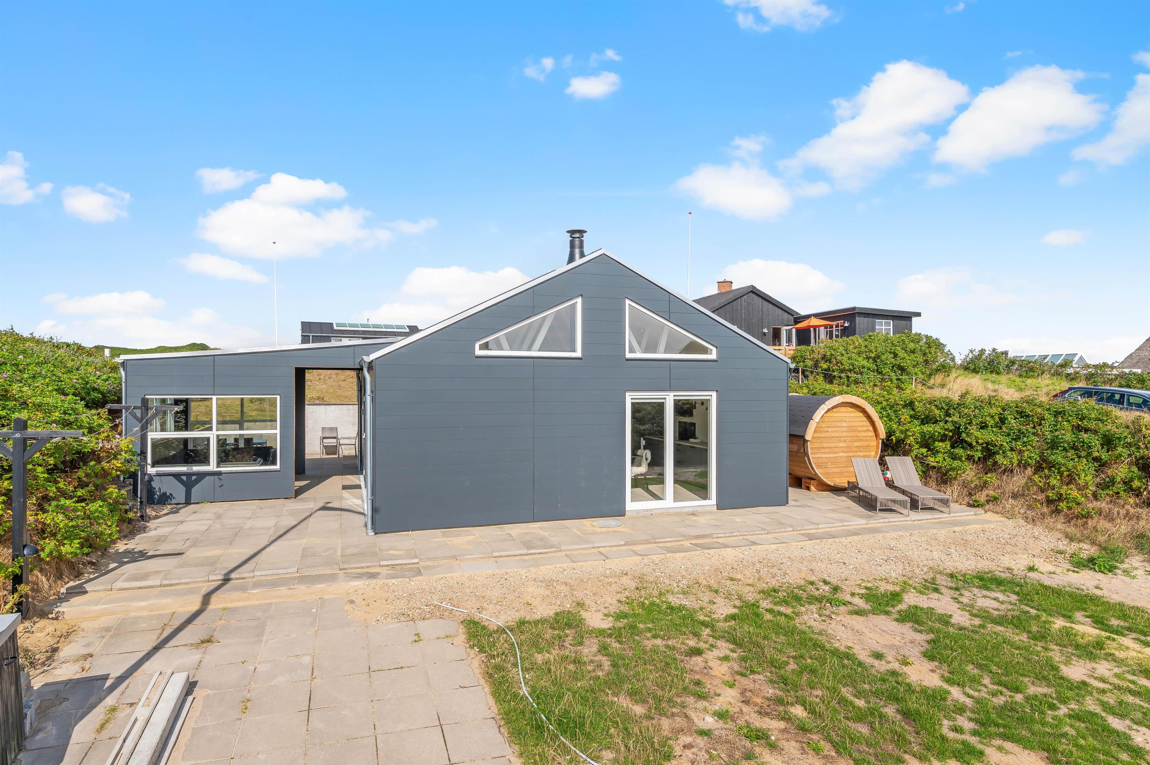 På sommerhusets udeområde kan I se frem til at nyde nogle dejlige, afslappende stunder. Her venter jer nemlig en skøn udesauna, som I kan sætte jer ind i og komme helt ned i gear i varmen. I kan også sætte jer ind i udesaunaen efter en tur ved stranden. Hvis I har været på stranden, kan I skylle det sidste sand af tæerne under udebruseren. Udebruseren må ikke benyttes fra i perioden fra november til april.