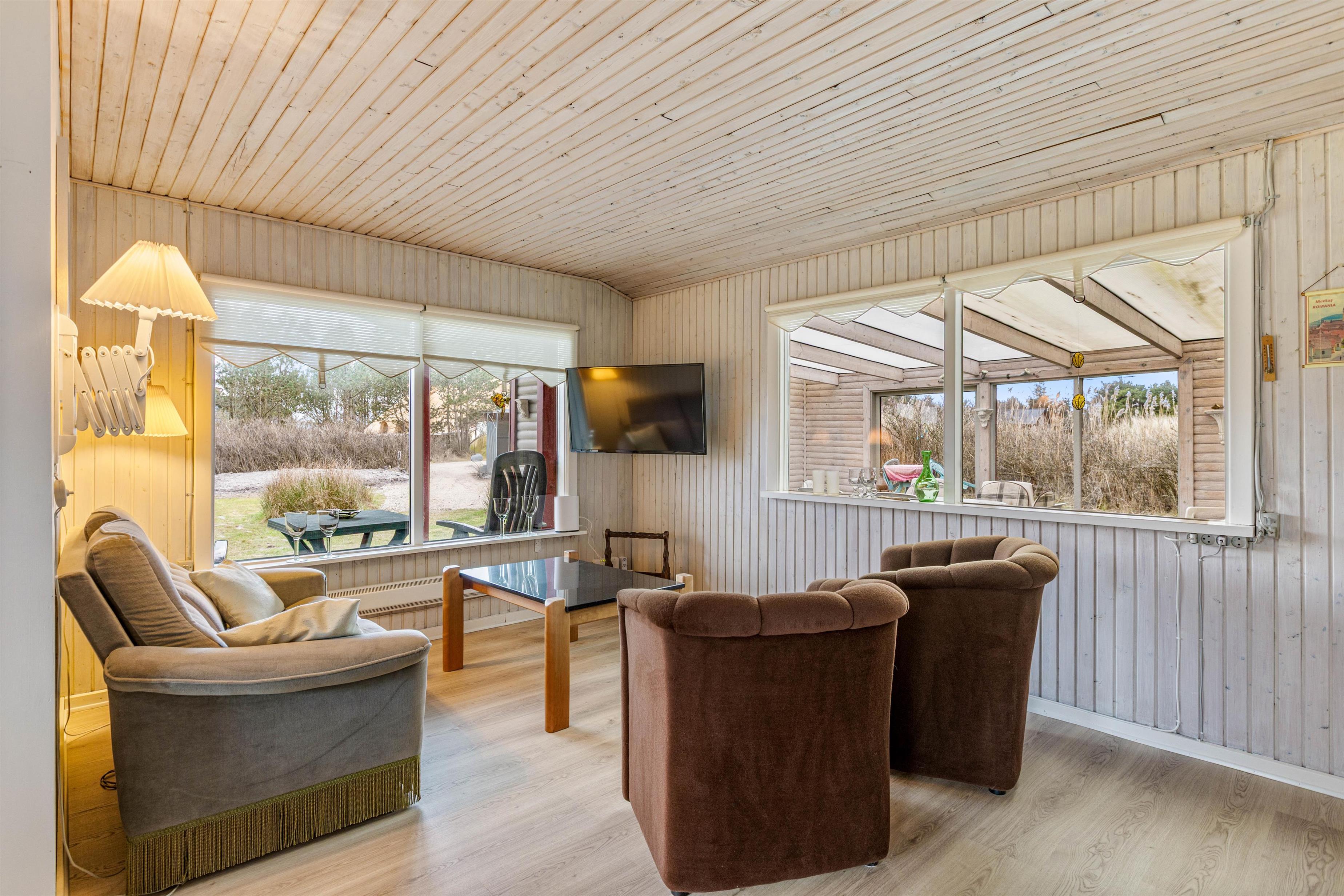 Sommerhusets udestue er indrettet med store vinduespartier, som giver et dejligt lysindfald og samtidig en skøn udsigt over den store grund – helt perfekt til morgenkaffen.